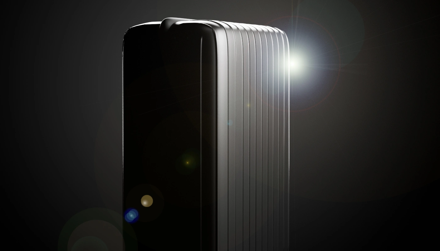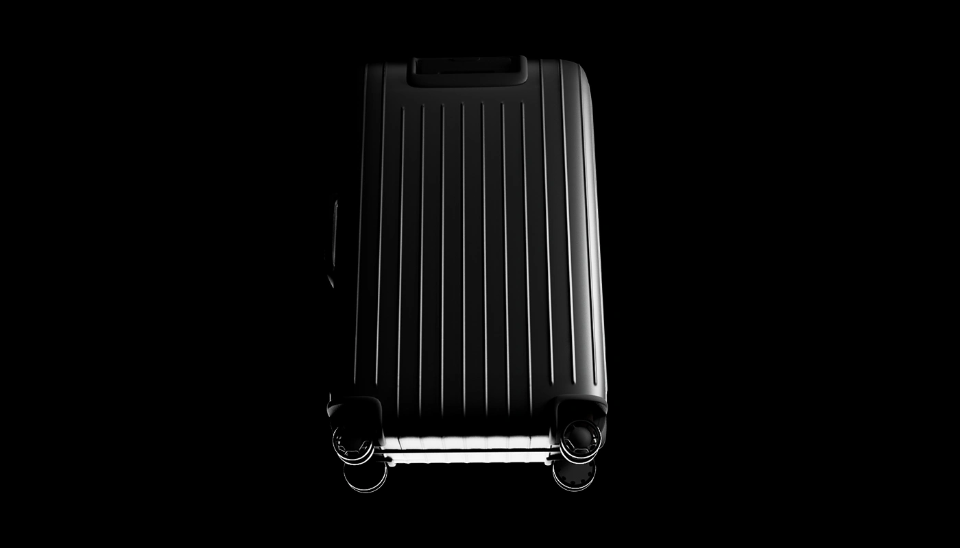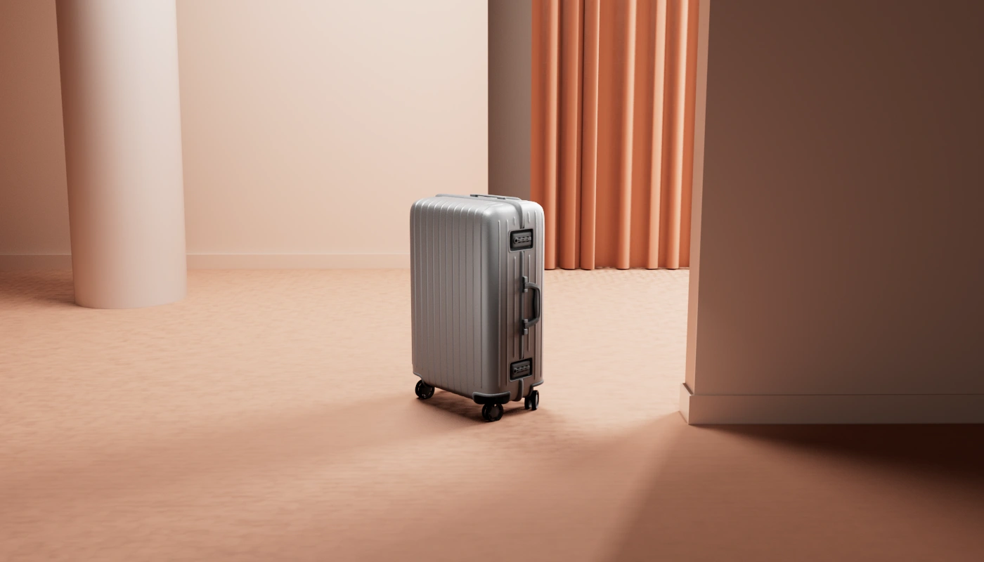 Designed and rendered entirely in Maya. The suitcase features a sleek, ribbed design, highlighted by dramatic lighting that accentuates its contours and texture.