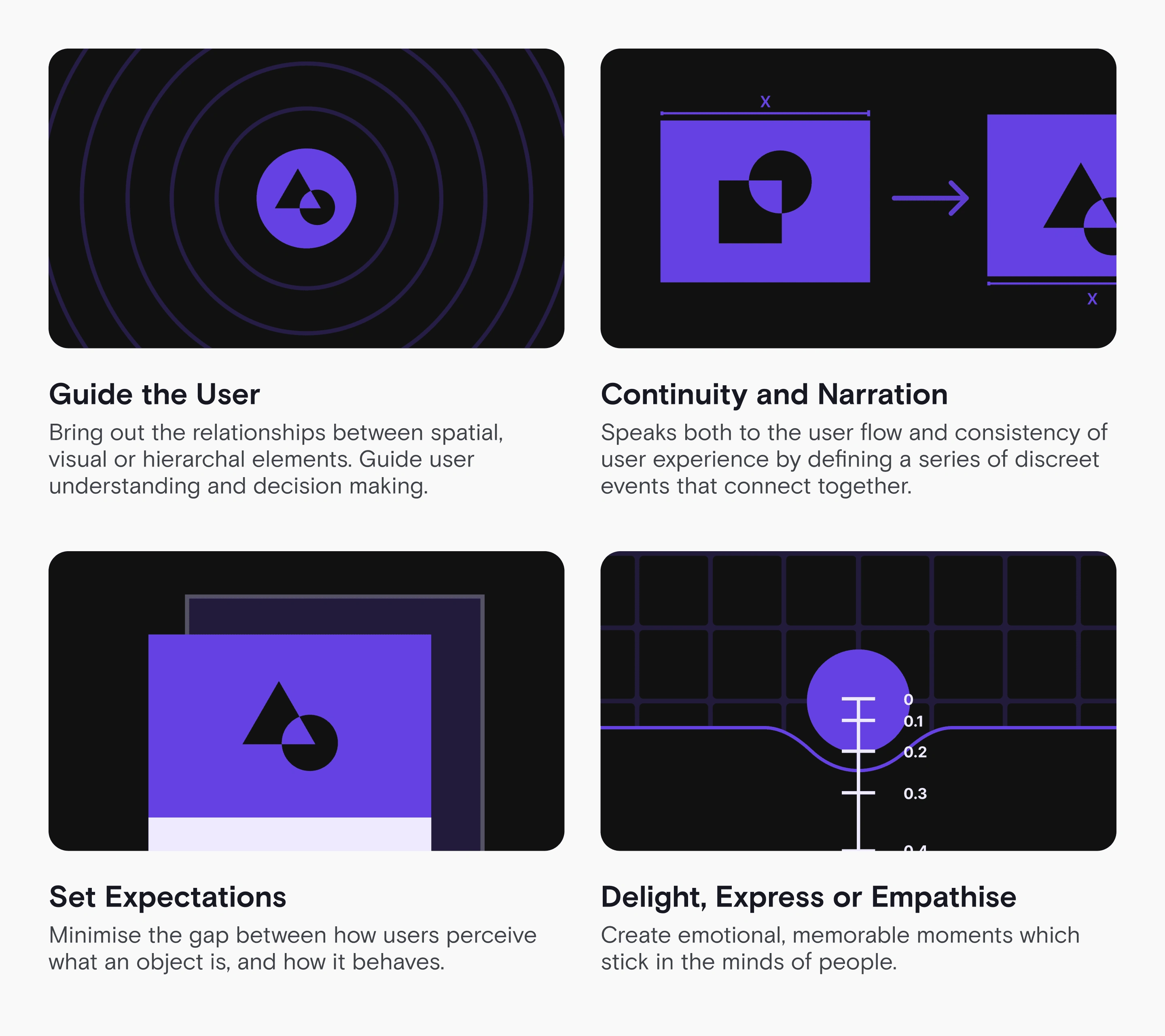 Non Real Time: Interactions occur after user input. Users briefly pause and watch the result before continuing. This is where motion design system comes in with properties like duration, easing, etc.