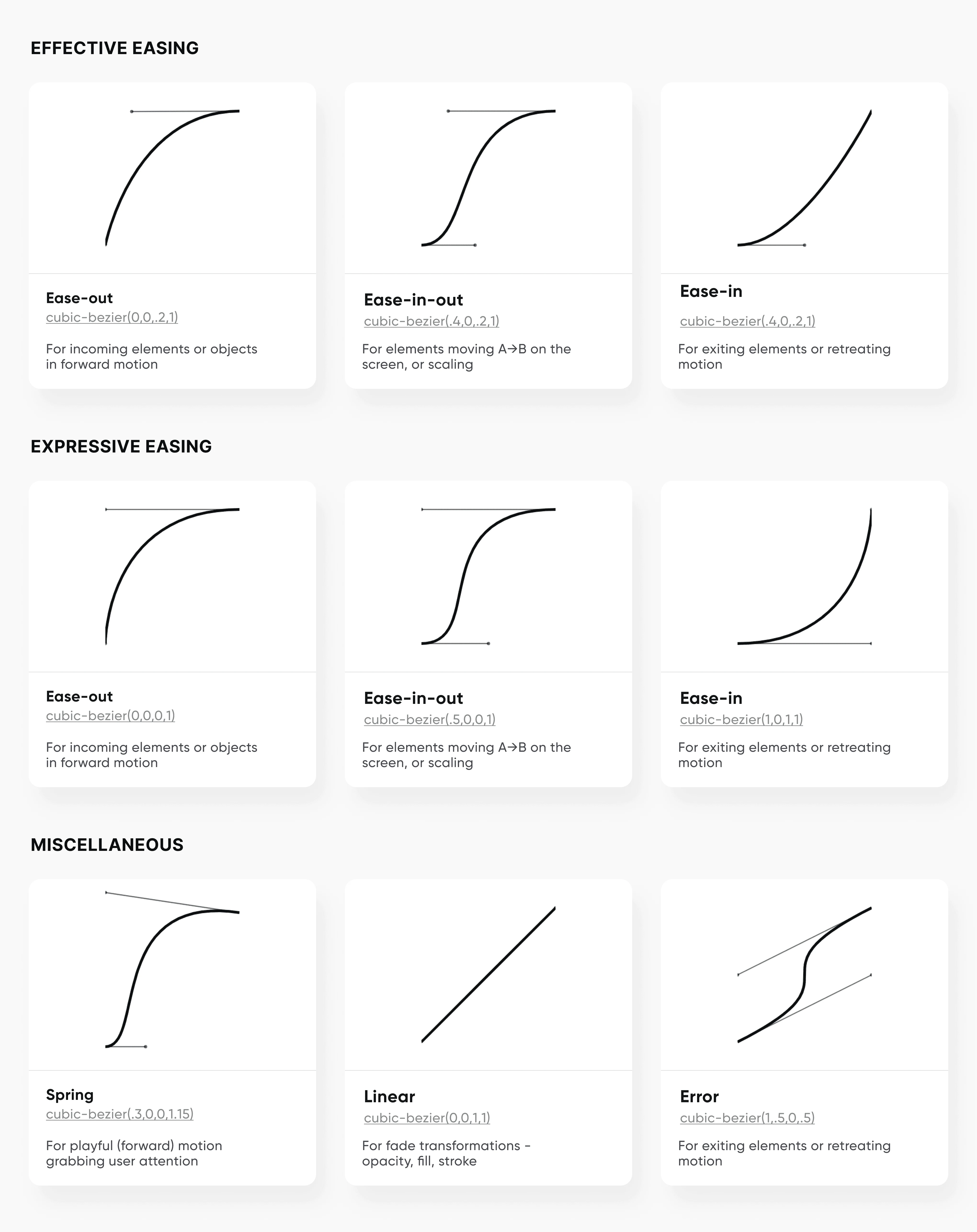 For each easing type, we defined the start and end of a transition — using bezier curves. A general rule of thumb is to use: