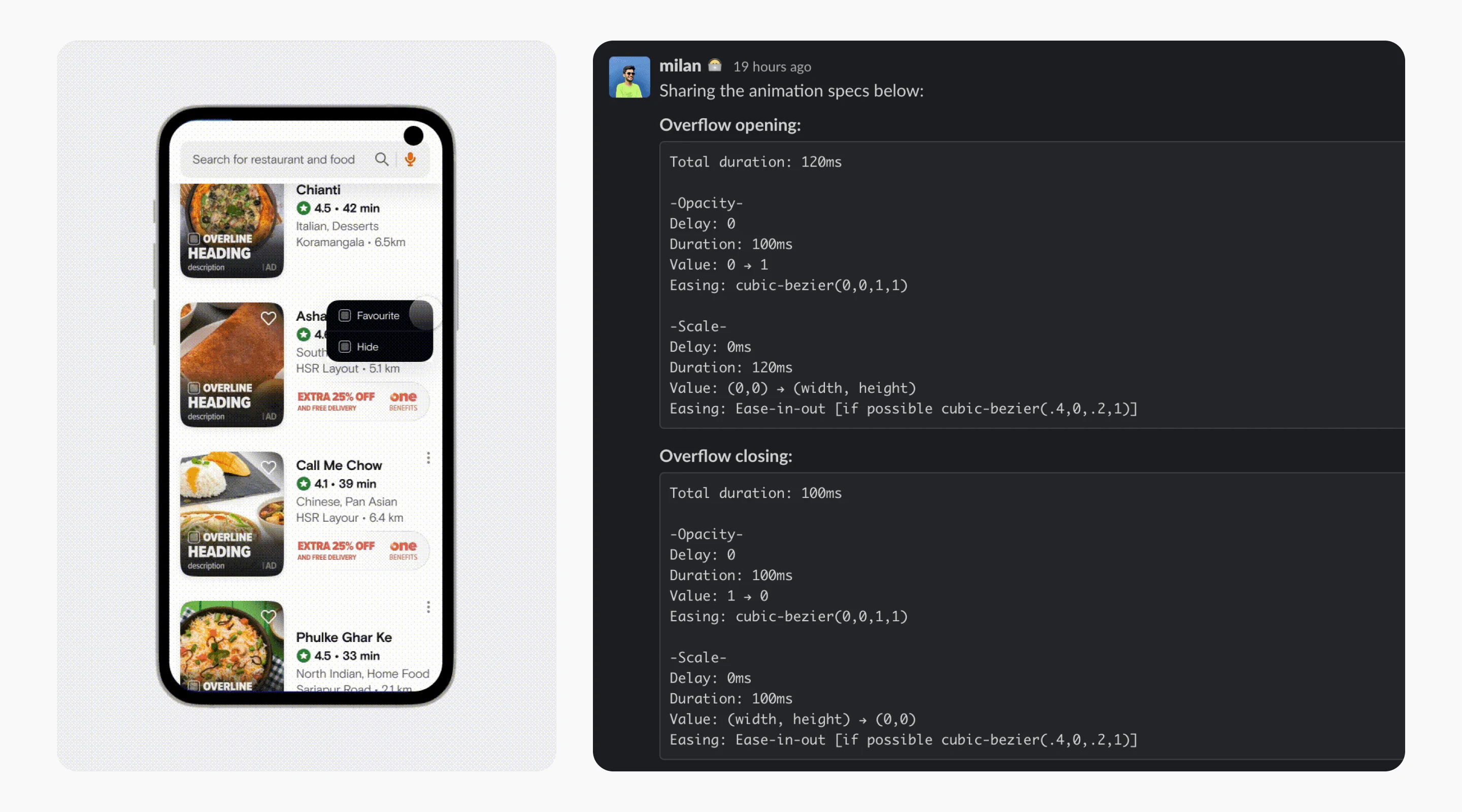 Not all objects were part of design system components yet. To show how an interaction would behave, we started writing specs using motion tokens. These were communicated async over Slack or Figma and discussed in handoff meetings if needed.