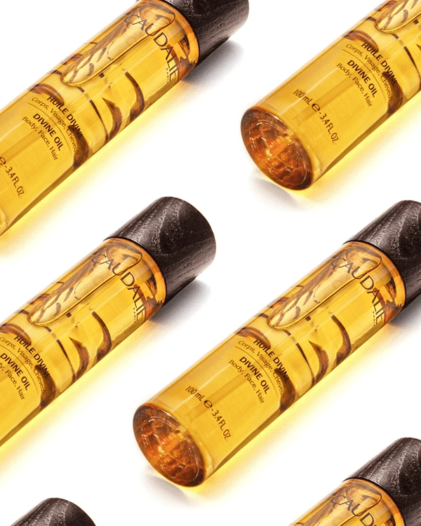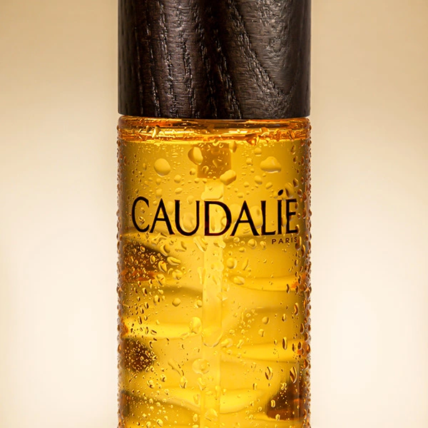 Photographed Caudalie Divine Oil with a premium, glowing look. Focused on textures, reflections, and elegance to enhance brand value and shelf appeal.