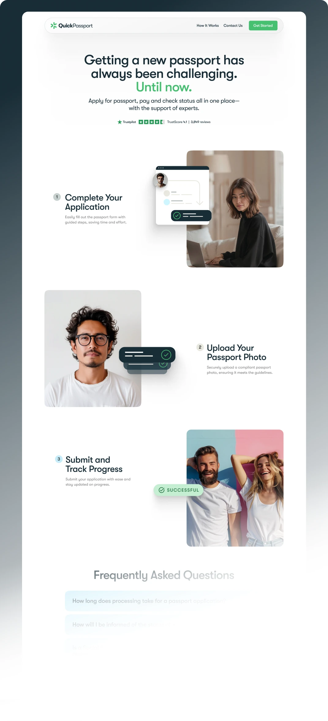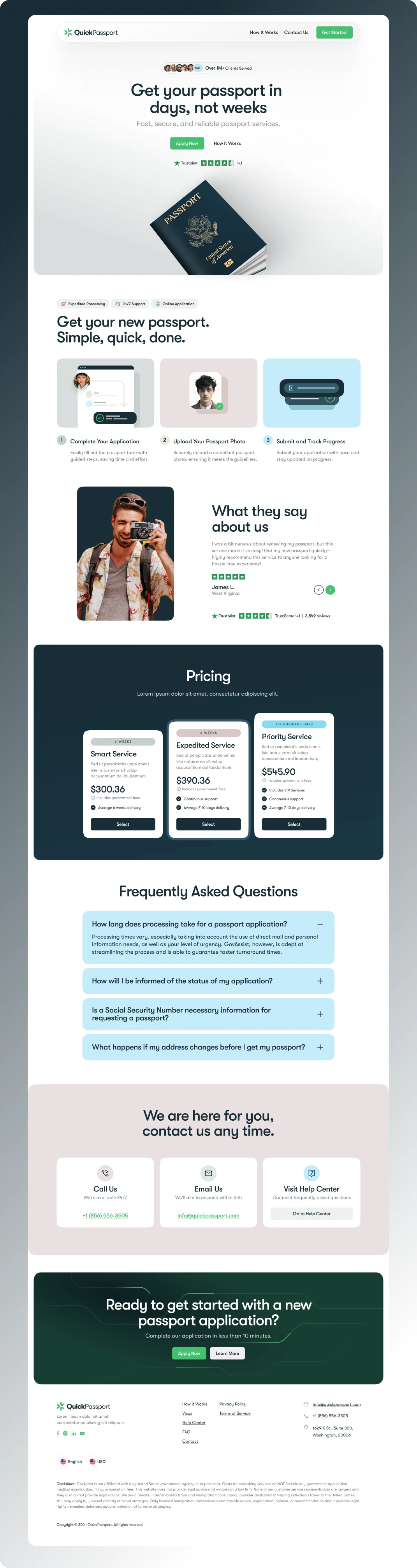 Website for QuickPassport, designed for people looking to get a new U.S. passport or renew their old one. QuickPassport’s goal is to simplify the process and assist with any inquiries along the way.