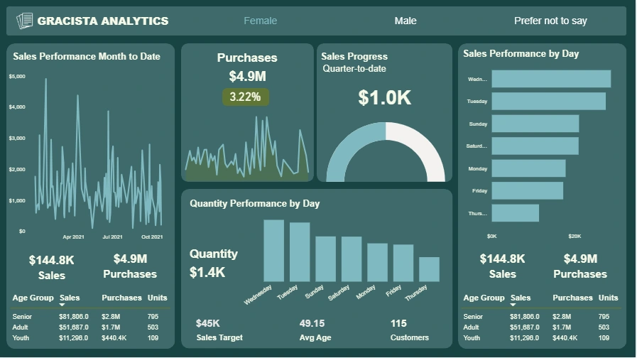Daily trends spotlight Wednesday as the peak performer across both revenue and volume, while Thursday trailed behind. Quantity sold reached 1.4K units, and the average customer age sits at 49.15, shaping a clear demographic narrative.