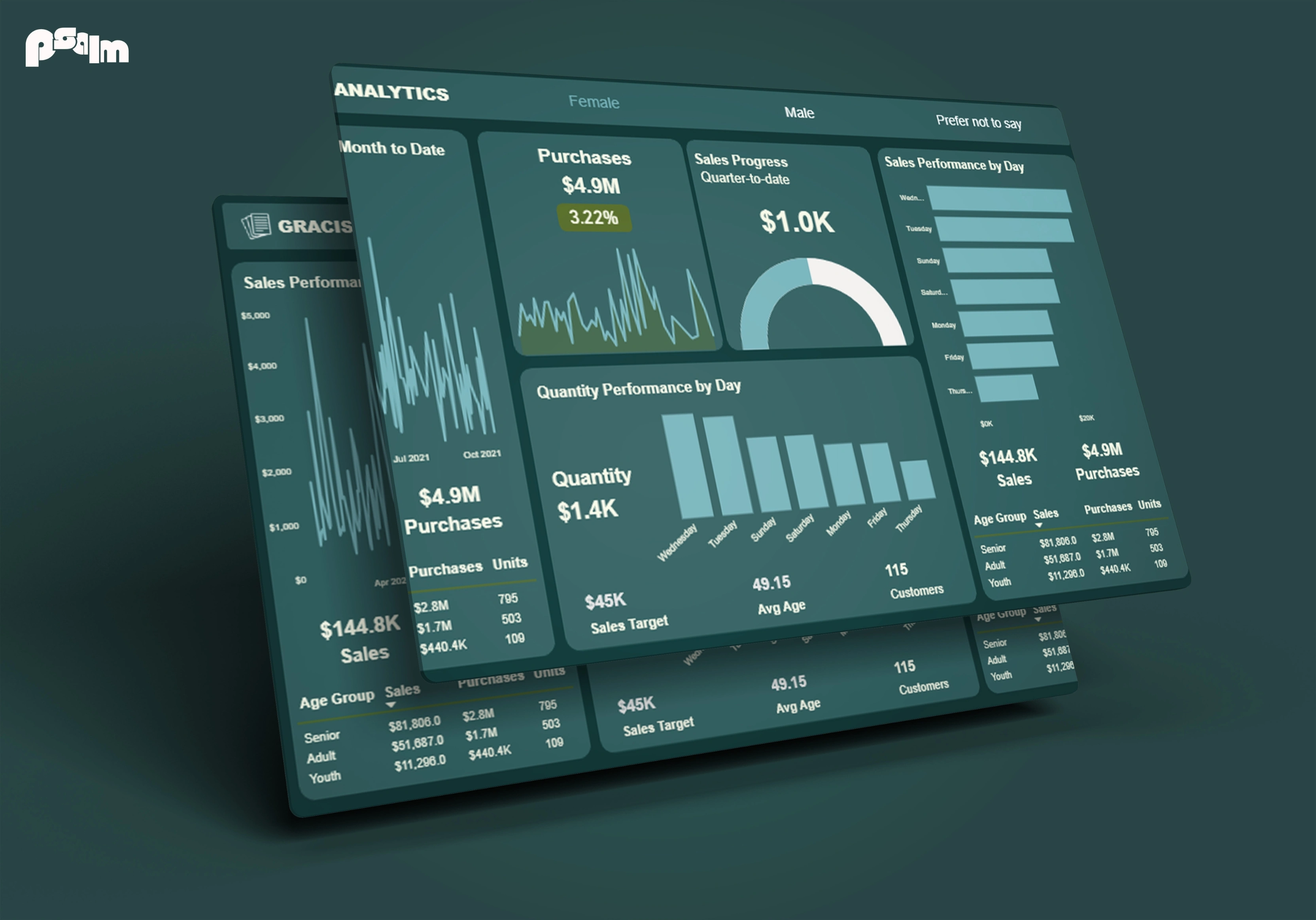The aboveΒ dashboard delivers a powerful snapshot of recent commercial activity, blending clarity with strategic insight. Total purchases soared to $4.9M, underscoring strong buyer engagement, while Total Sales registered at $144.8K, with 705 units sold.