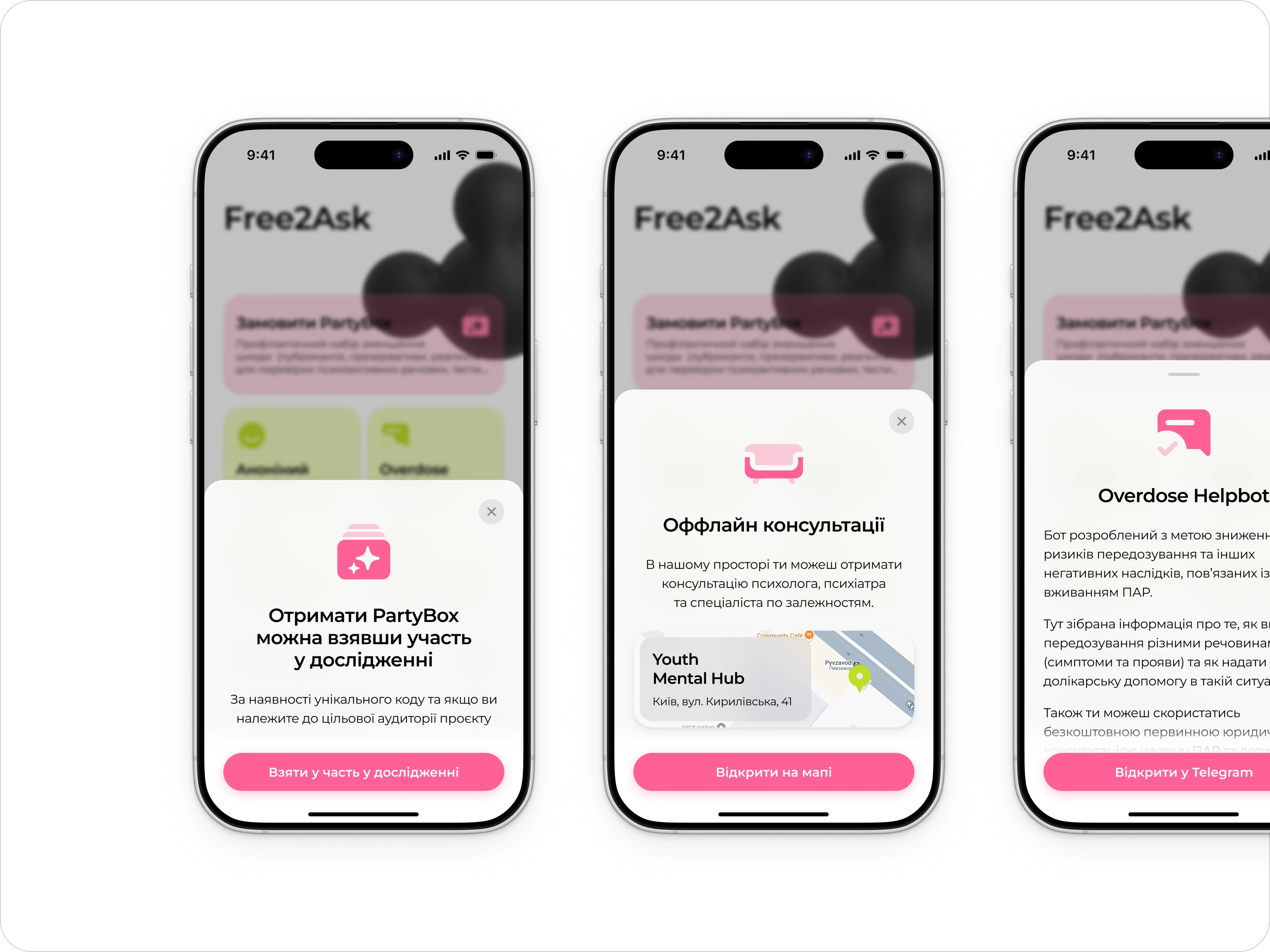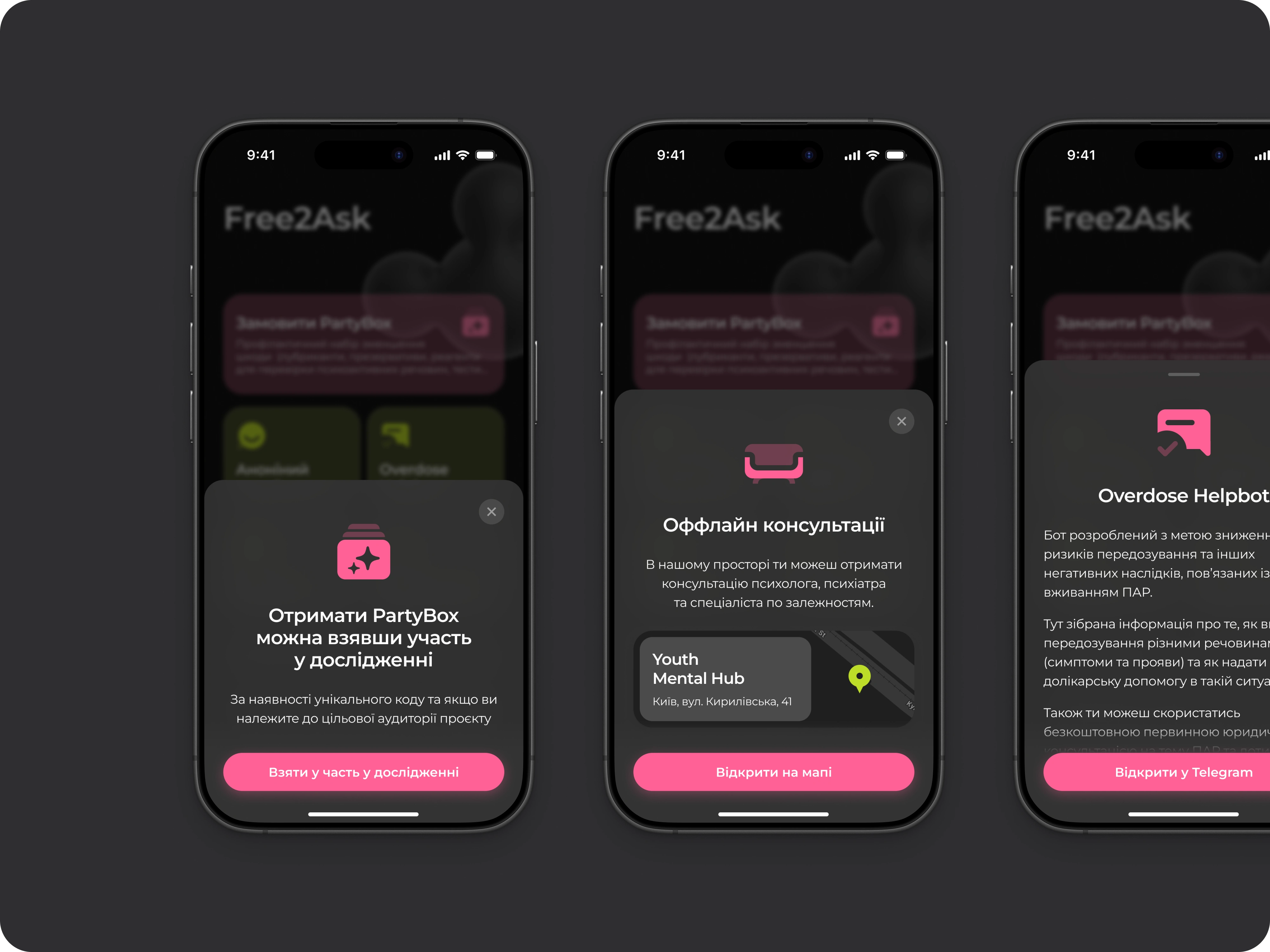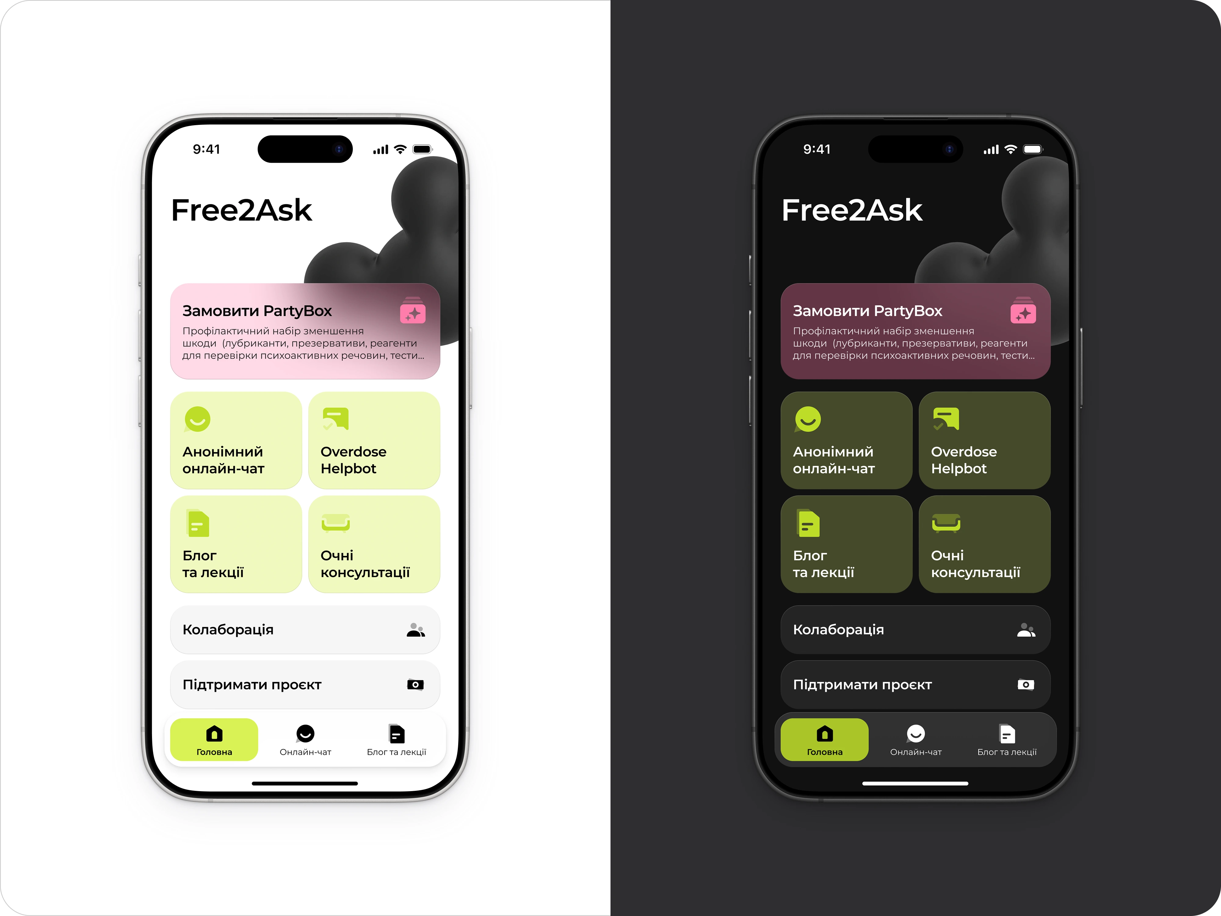 A mobile support platform for Ukraine’s nightlife and rave culture. Designed for fast access to consultation, overdose help, and party safety — all built with empathy, clarity, and privacy in mind. The design focused on inclusivity, clarity, and quick decision-making — with dual dark and light modes and native-app feel.