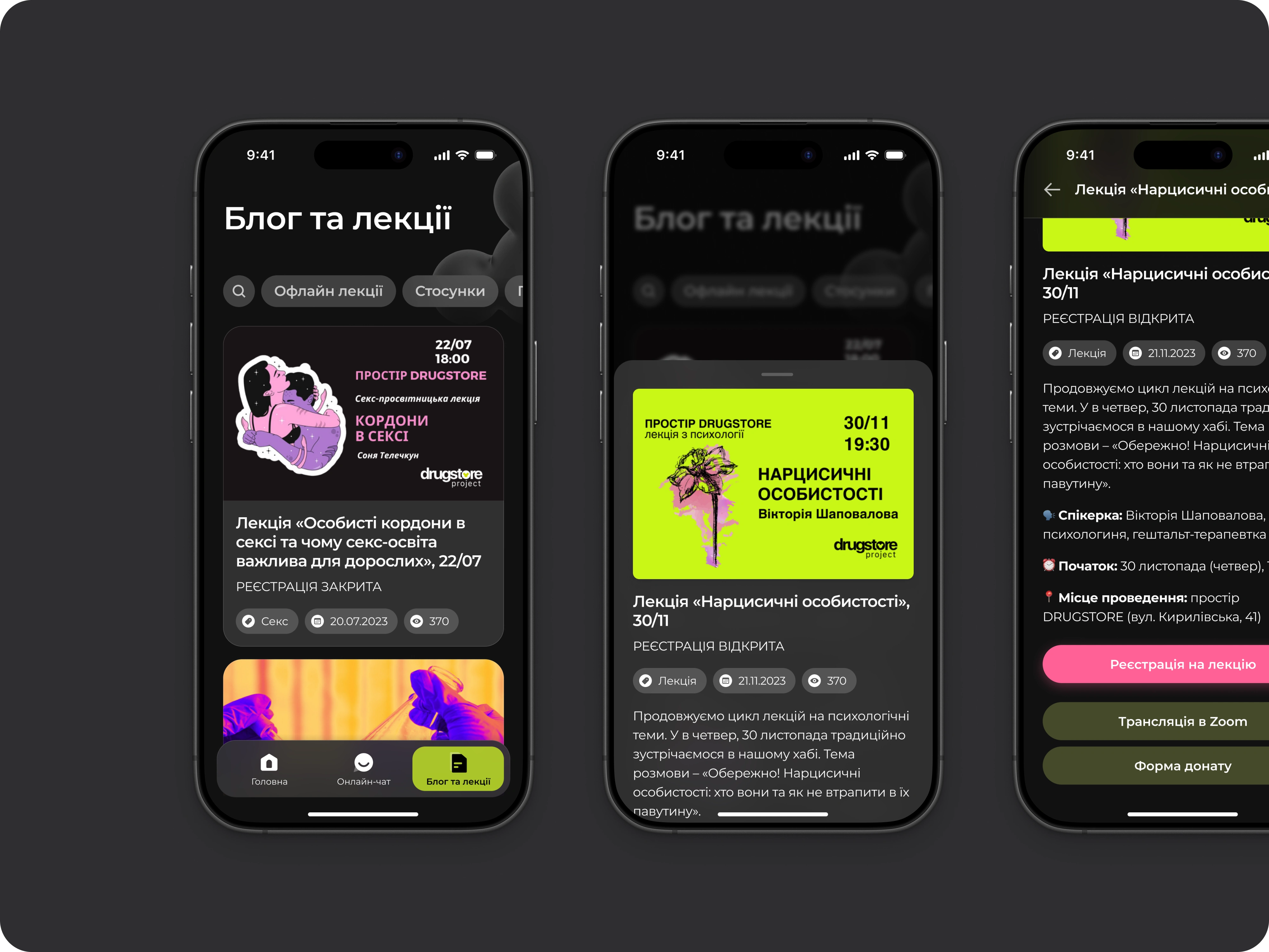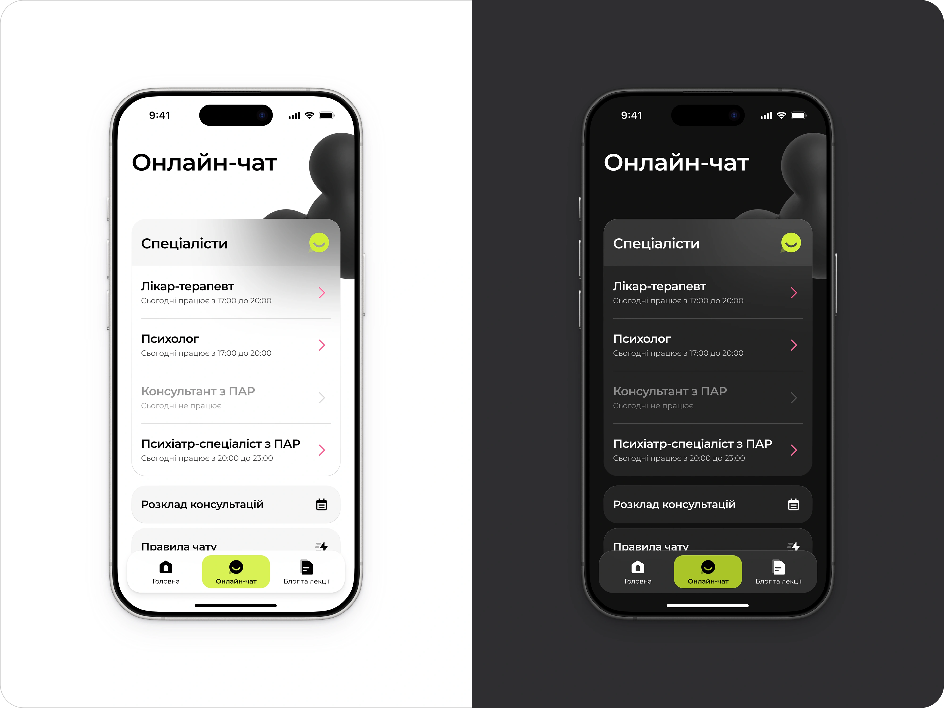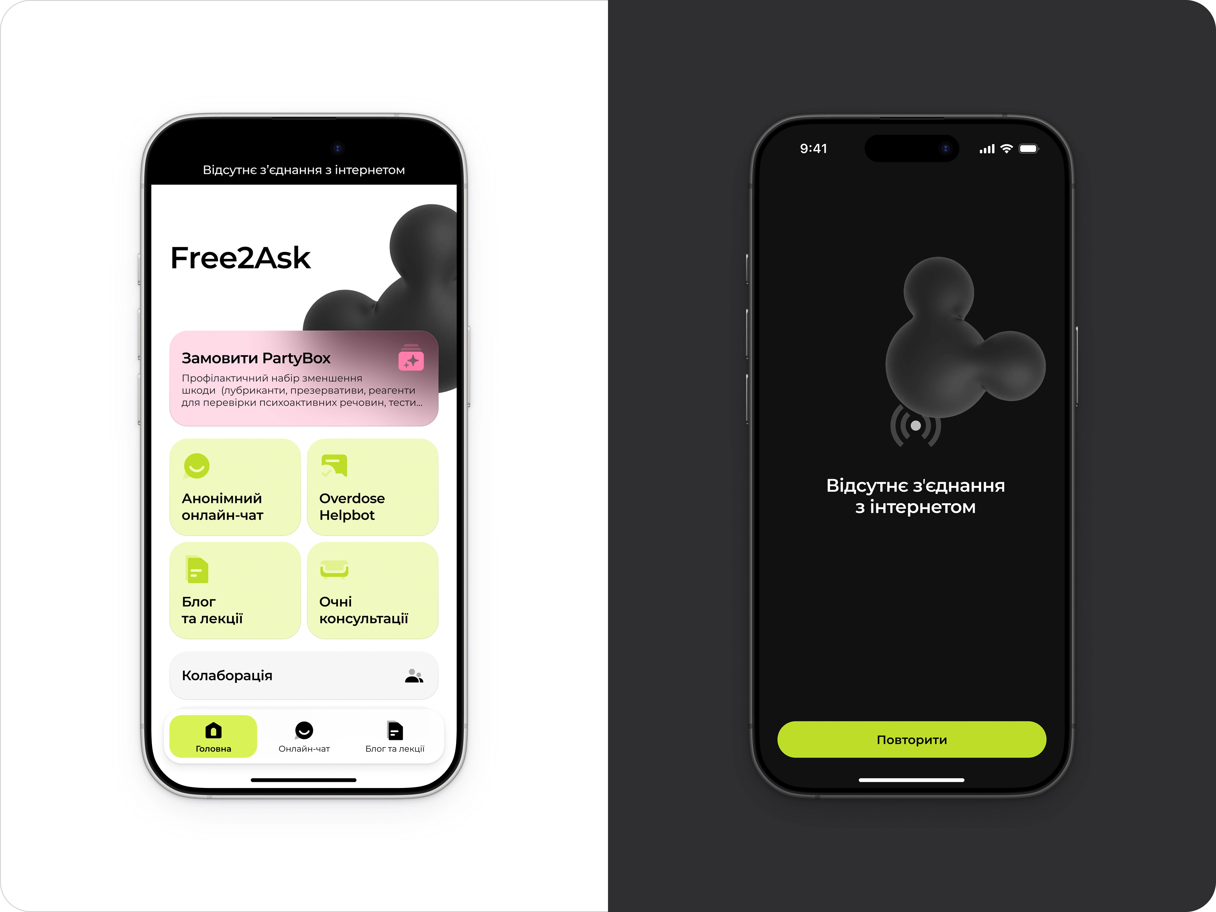 A mobile support platform for Ukraine’s nightlife and rave culture. Designed for fast access to consultation, overdose help, and party safety — all built with empathy, clarity, and privacy in mind. The design focused on inclusivity, clarity, and quick decision-making — with dual dark and light modes and native-app feel.