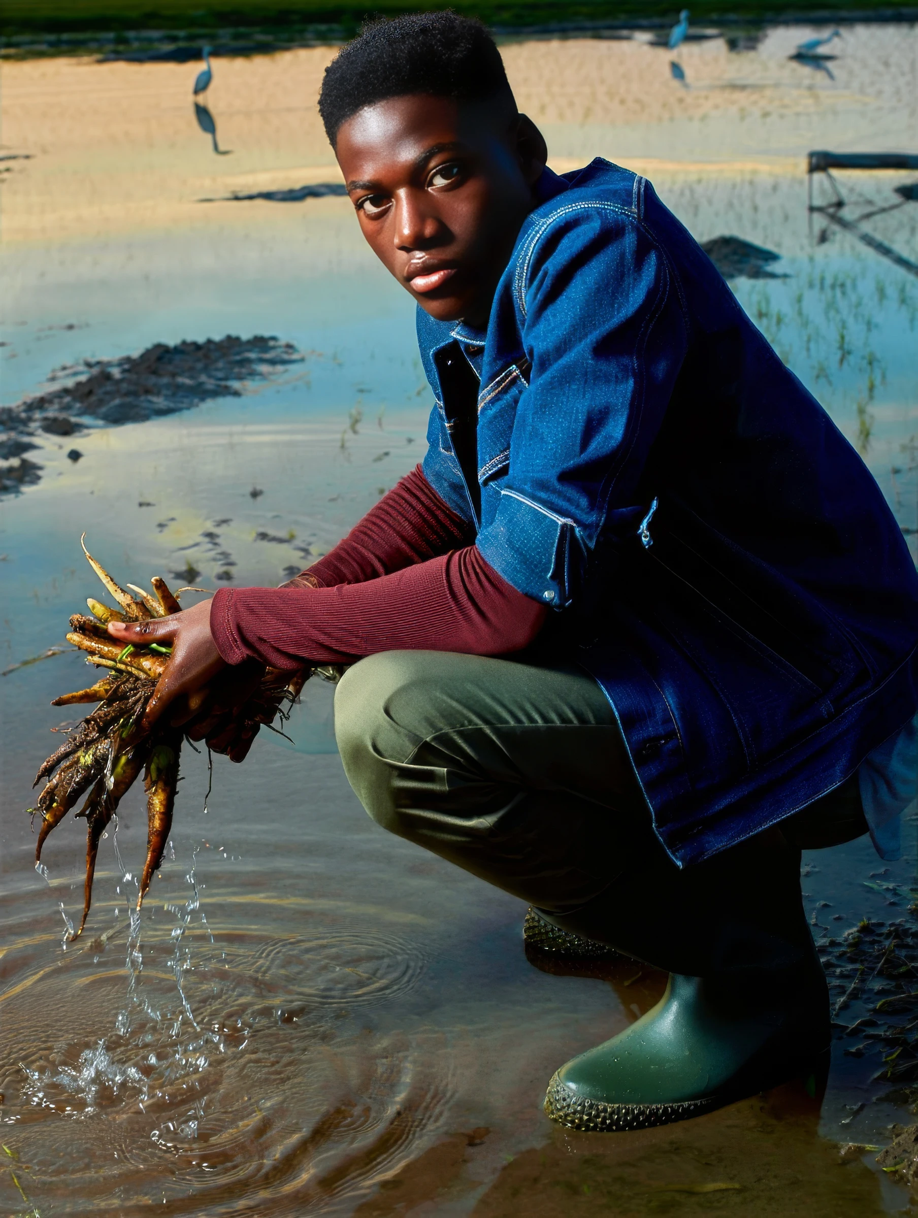 The aesthetic channels a grounded yet fluid minimalism, where utilitarian forms gain poetic dimension through tonal subtlety and tactile contrast. Garments feature relaxed, oversized profiles with elements like bib overalls, hooded vests, and wide-leg cargos, rendered in weathered fabrics that evoke sediment and flow—canvas softened by imagined erosion, nylon with a deep sheen, and cotton bearing faint fades. Color draws from earthen transitions: muted clays, verdant mosses, smoky grays, and warm ochres, set against reflective waters and expansive skies for a sense of atmospheric immersion, creating a timeless vibe that's both rugged and introspective, suited for transitional seasons or narrative-driven