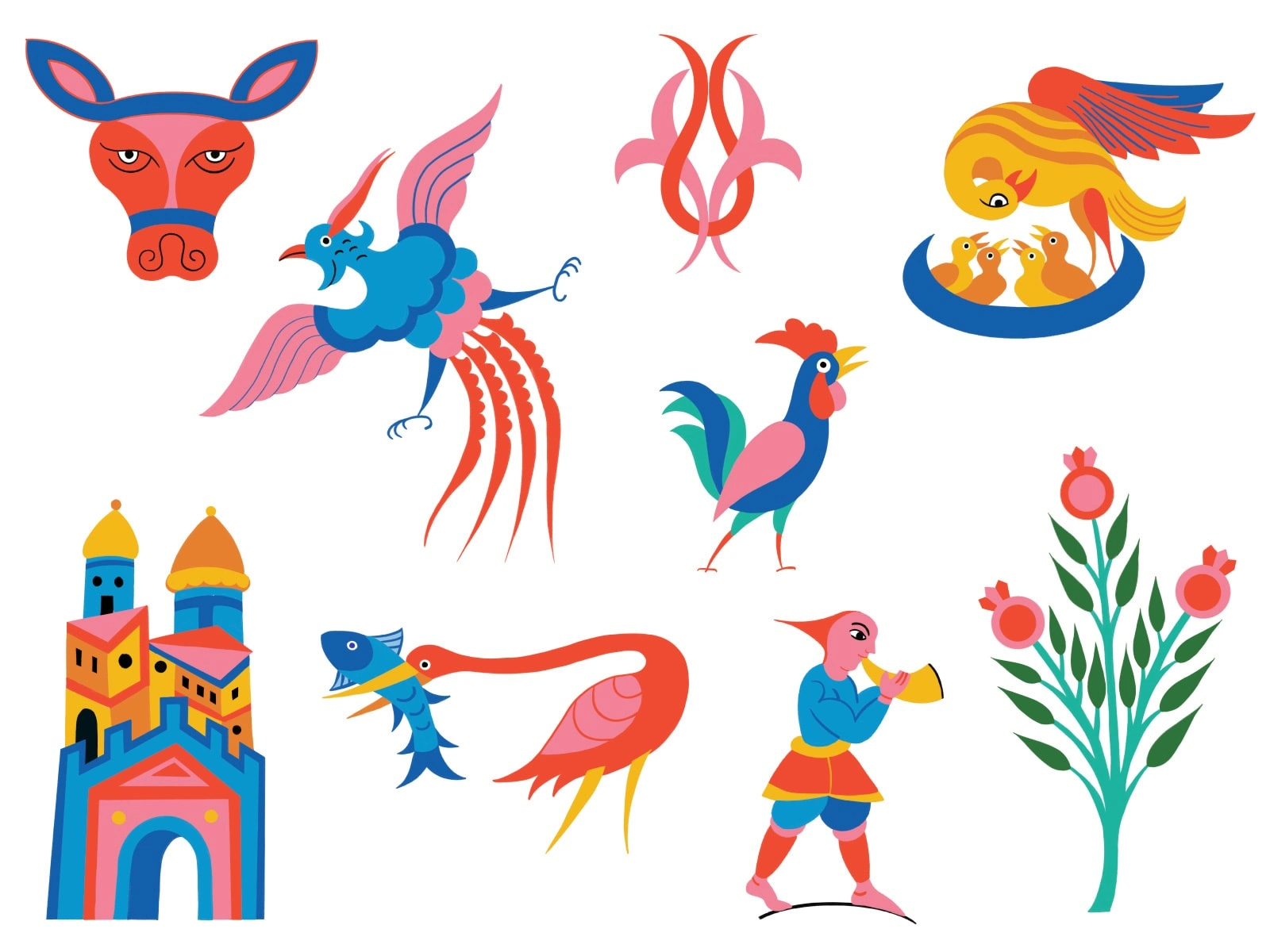 Illustration set of characters from Armenian Illuminated Manuscripts for Adobe Express. It features an interpretation of symbolic figures and ornaments.