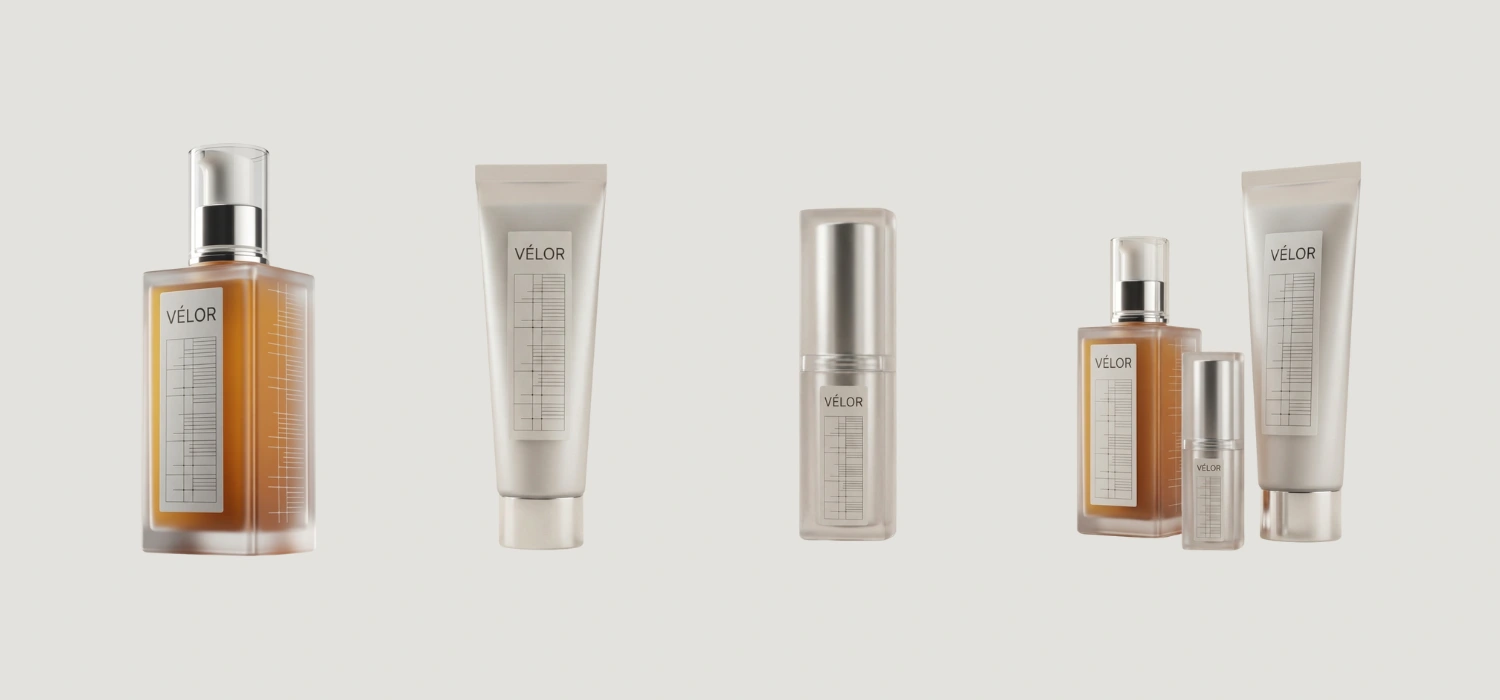 Key Achievement: Maintaining visual consistency (label placement, font, and "VÉLOR" logo) across three different product form factors using advanced prompting.