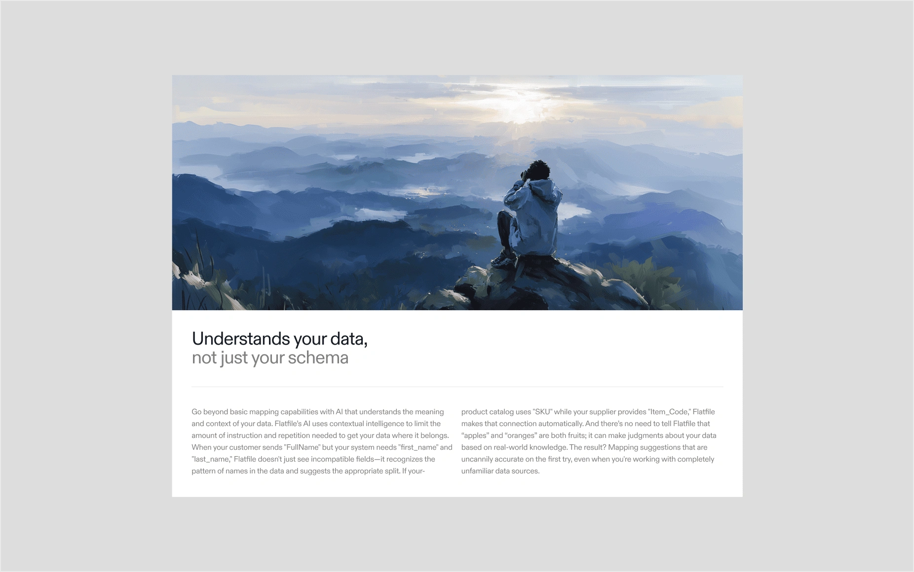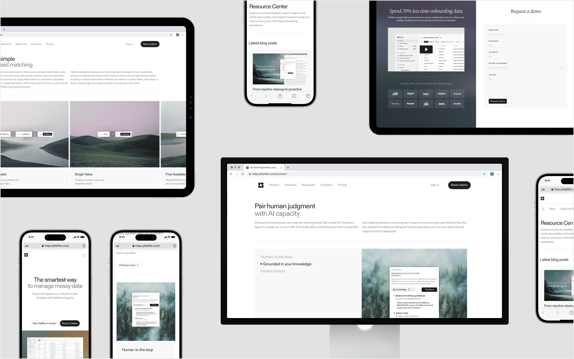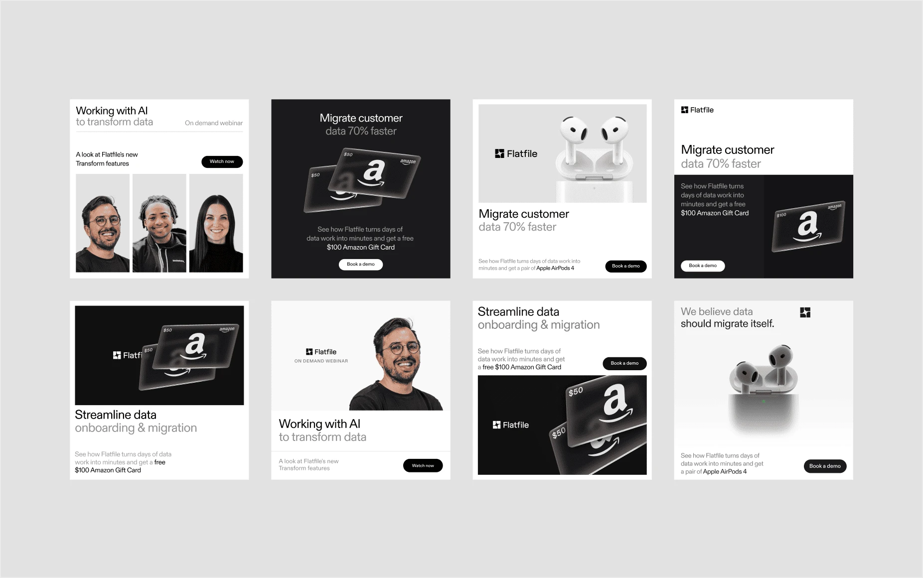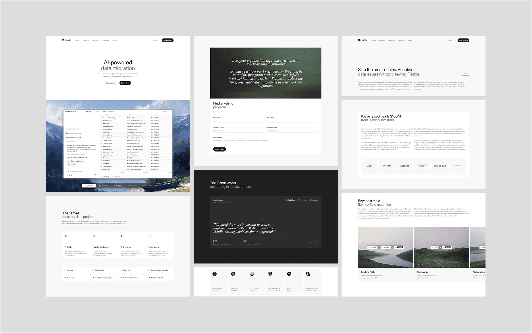 Flatfile is a platform powering AI data migration for companies like ADP, HubSpot, Amazon, and Sage. I worked as lead web designer to redesign their site into something premium that matched the product quality, as well as creating marketing collateral for socials, downloadable documents, and presentation decks.