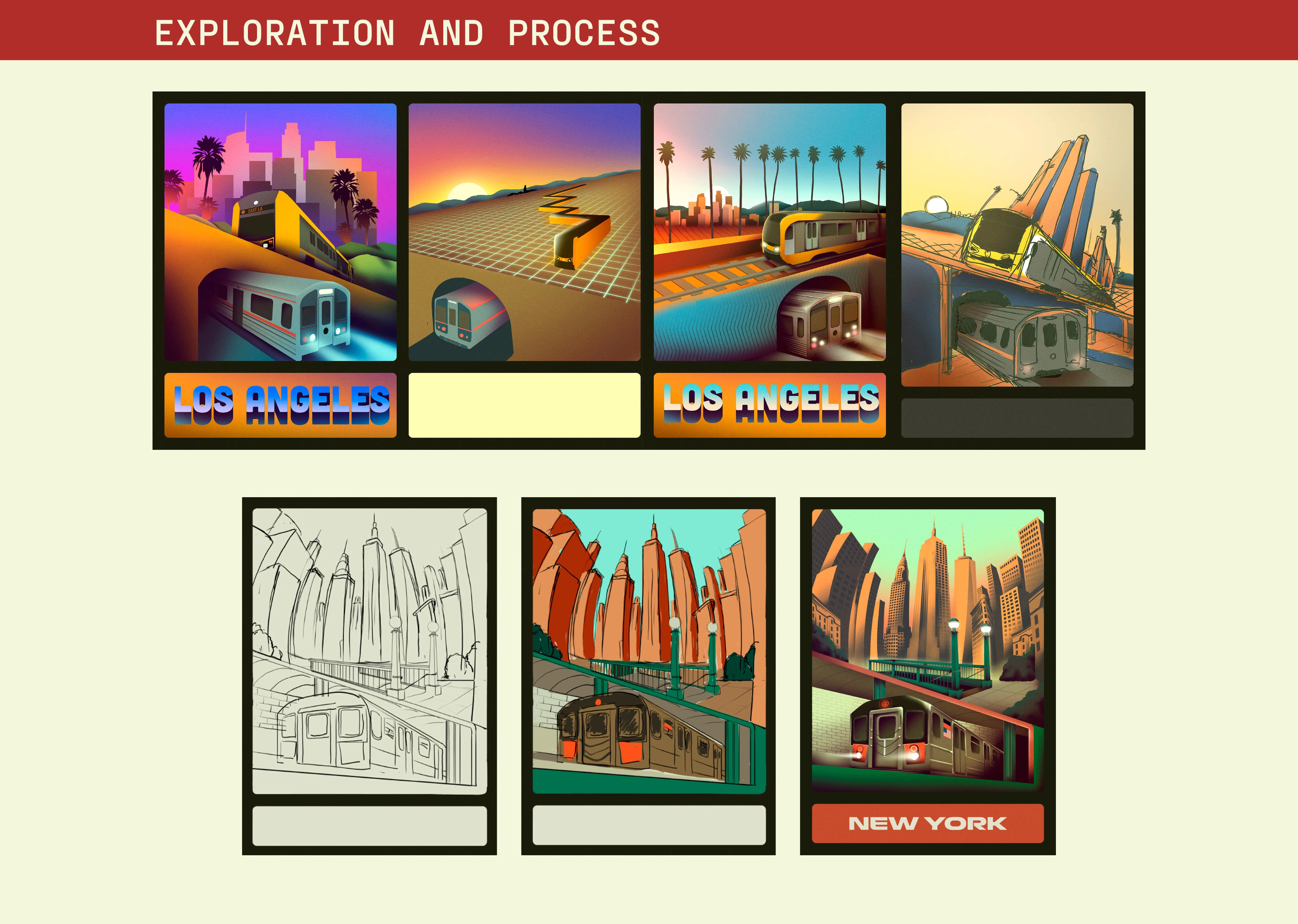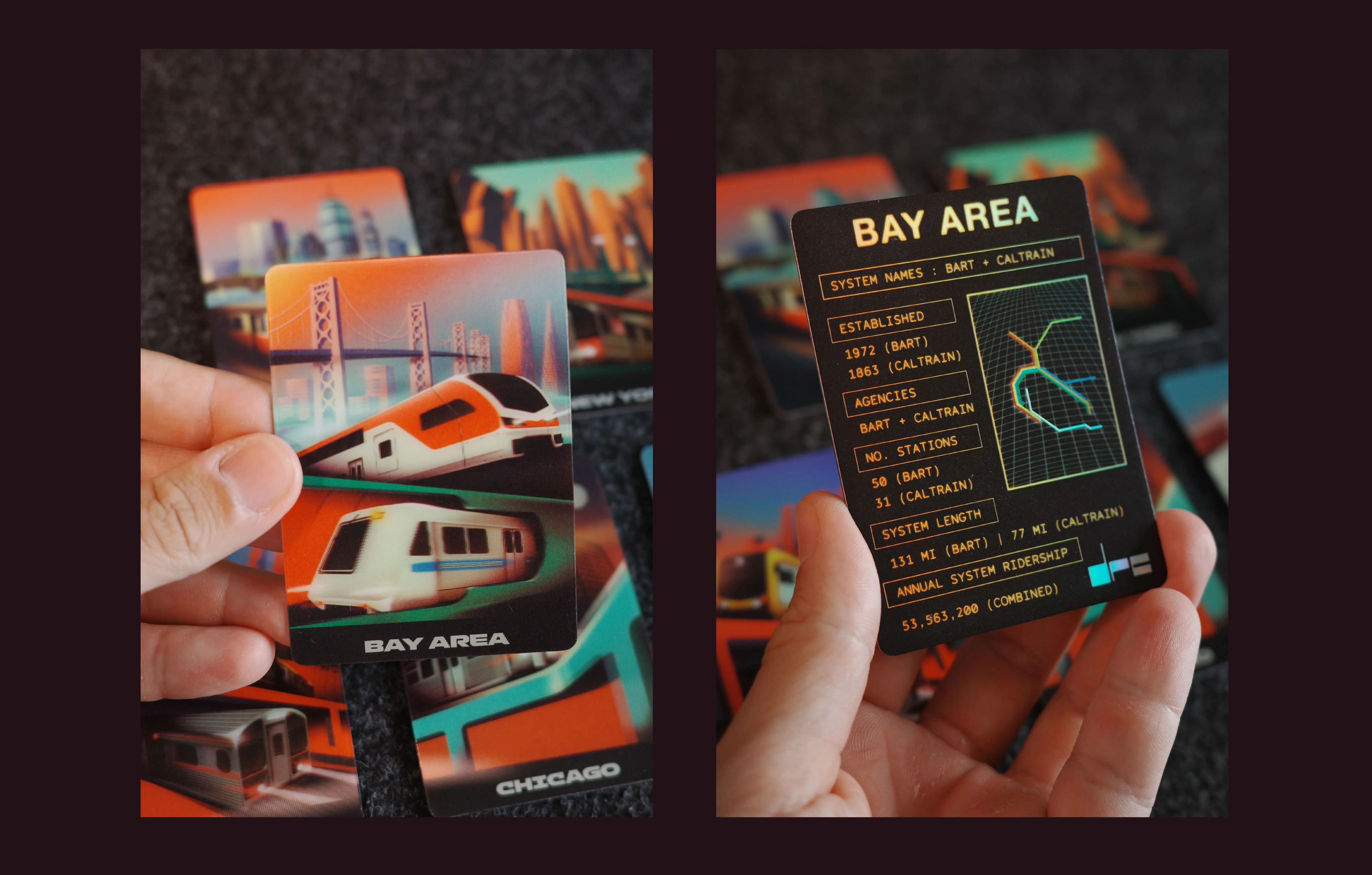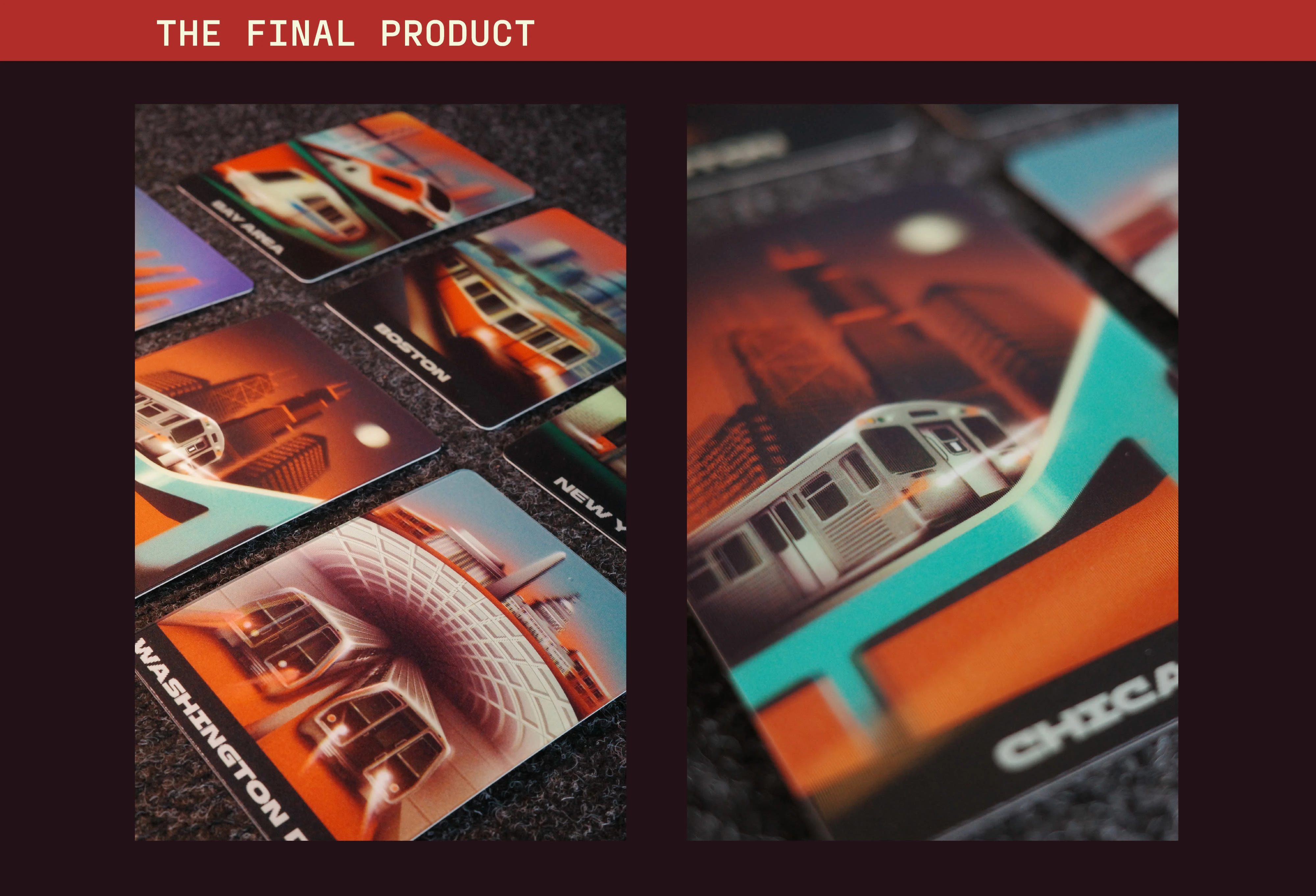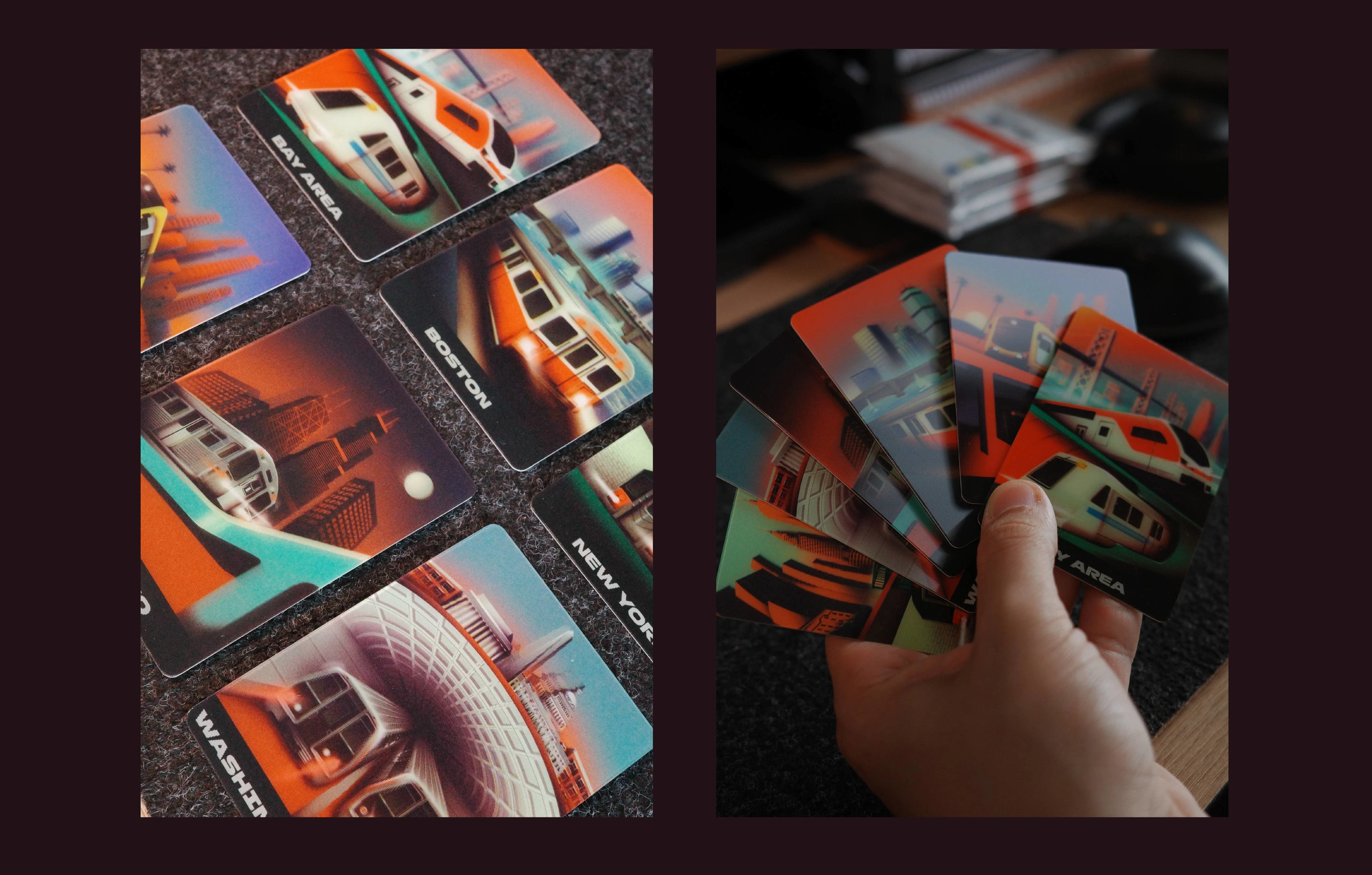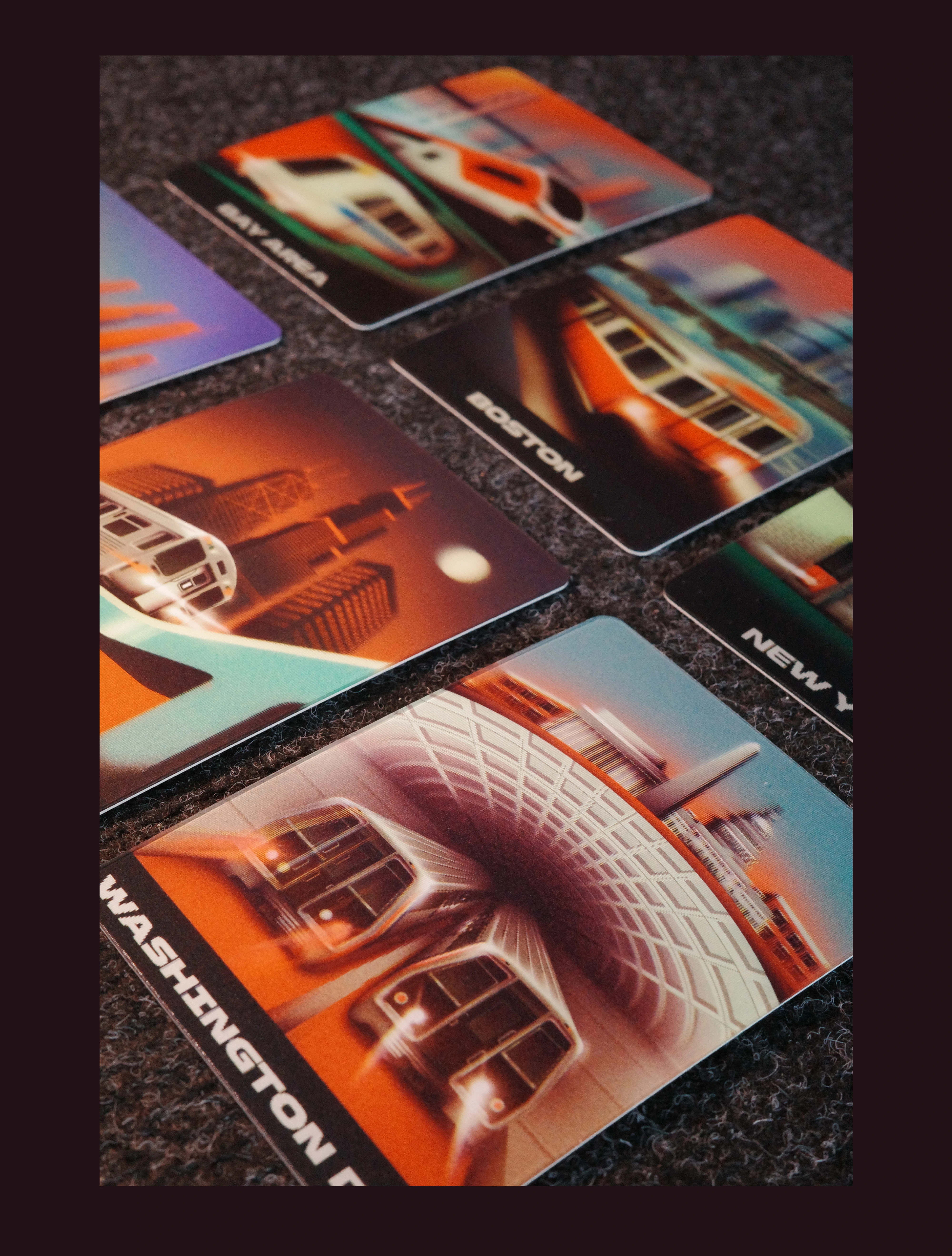 Set of 6 custom lenticular cards showcasing iconic USA cities along with their local metro system, part of Metroboard's launch campaign.