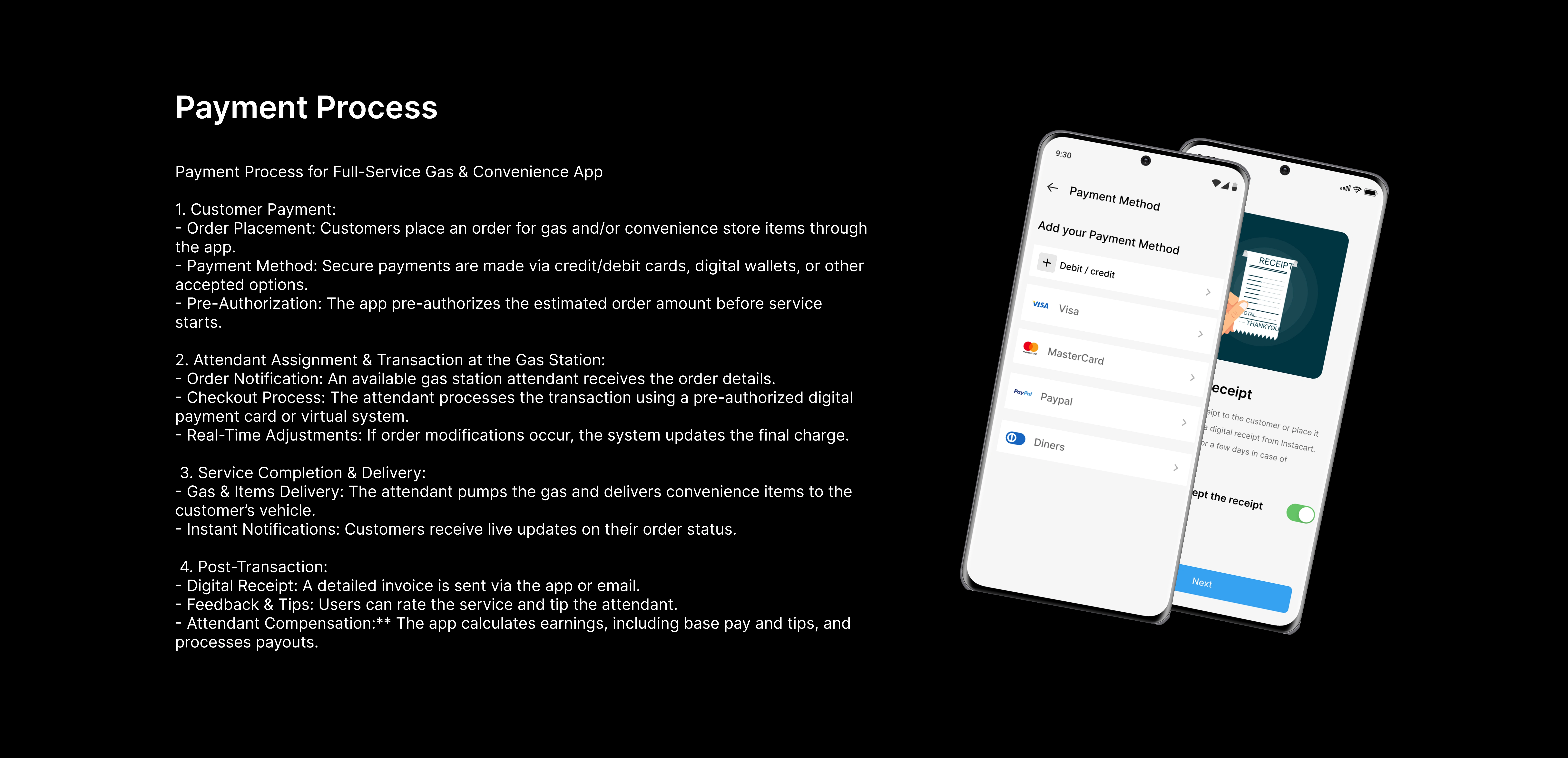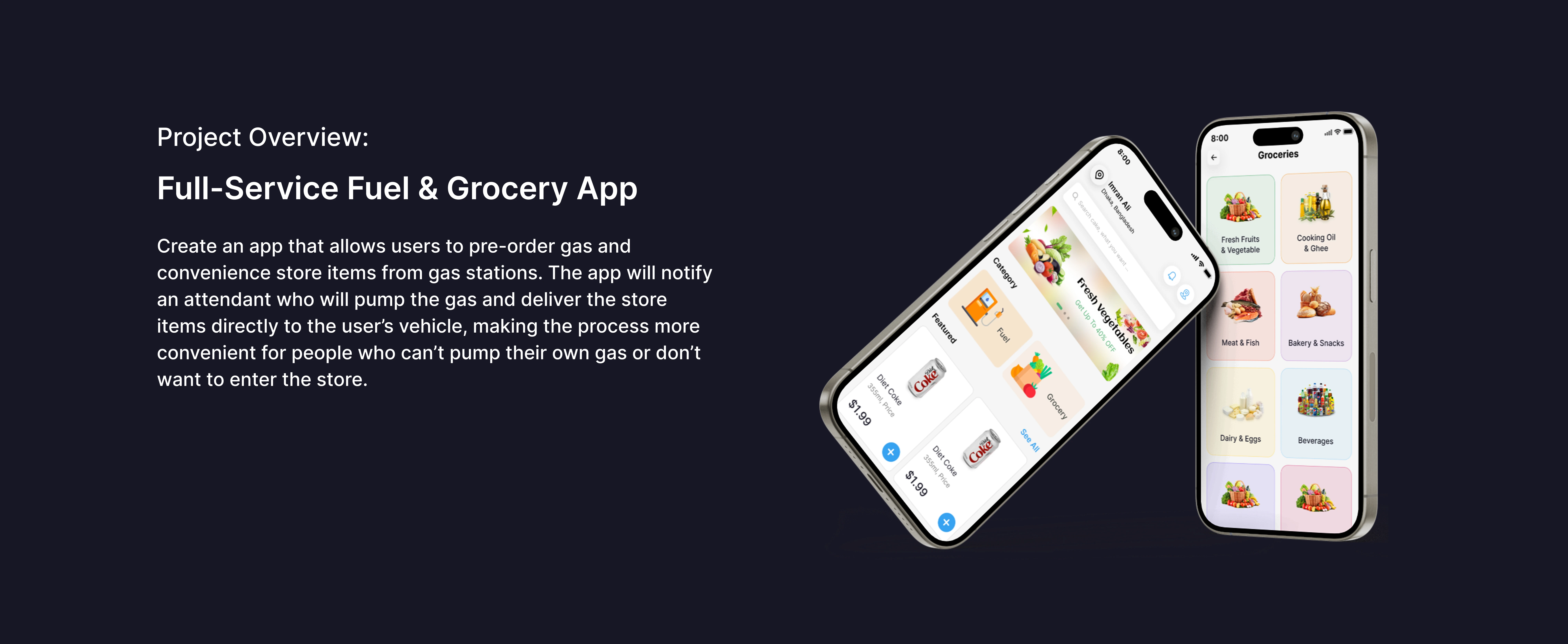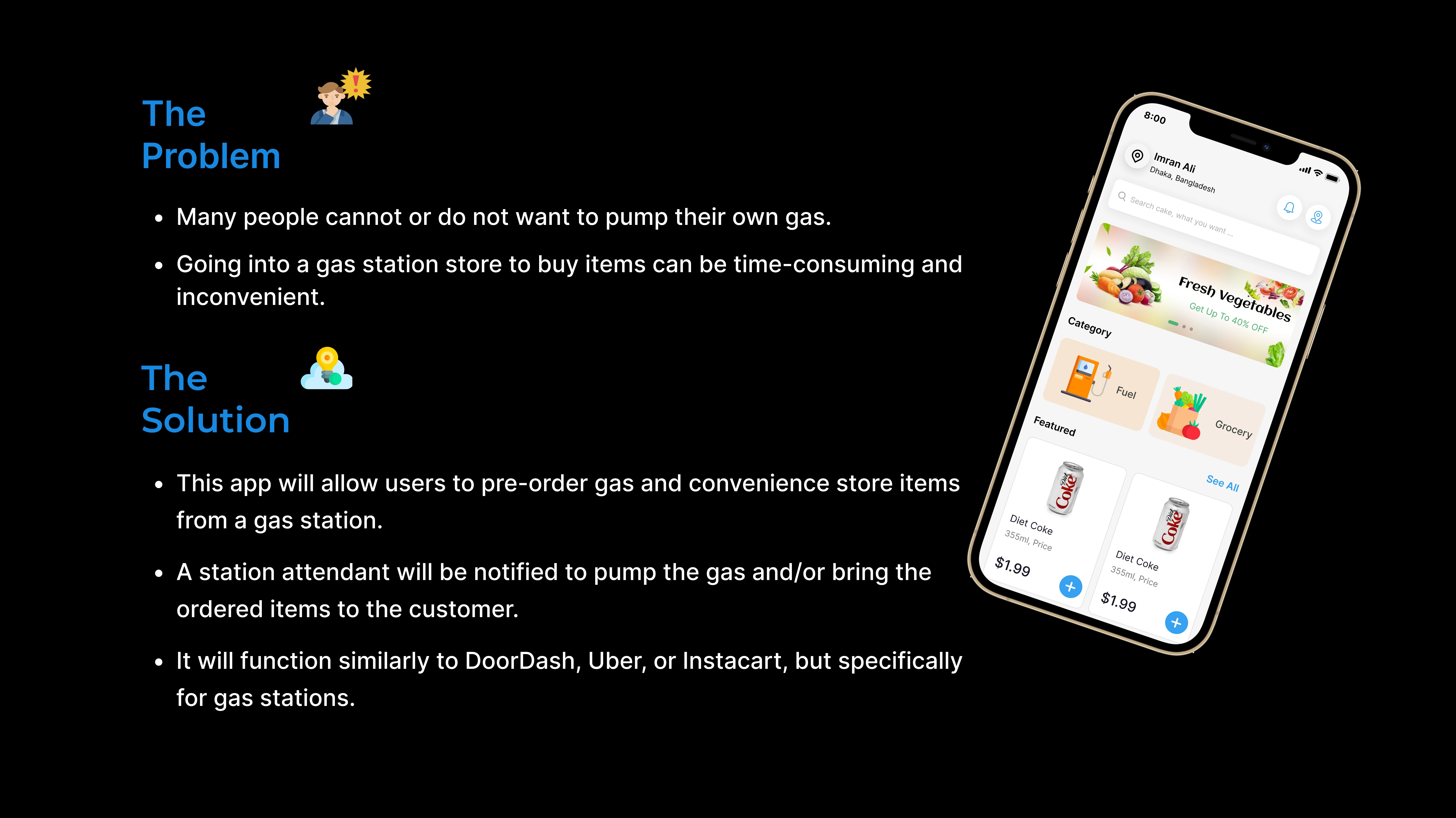 A full-service fuel & grocery app that lets users pre-order gas and store items. Attendants pump fuel and deliver items to the car for a seamless experience.