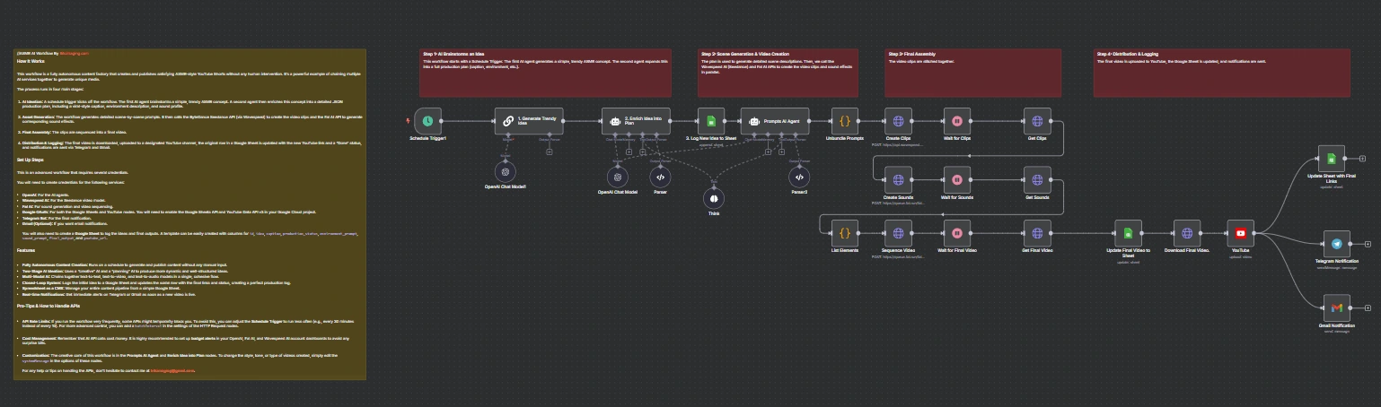 idea, caption, production_status, youtube_url. Add the Sheet ID to the Google Sheets nodes in the workflow.Telegram Notification node, enter your own Chat ID. In the Gmail Notification node, update the recipient email address.systemMessage in the "2. Enrich Idea into Plan" and "Prompts AI Agent" nodes.Posted Sep 19, 2025