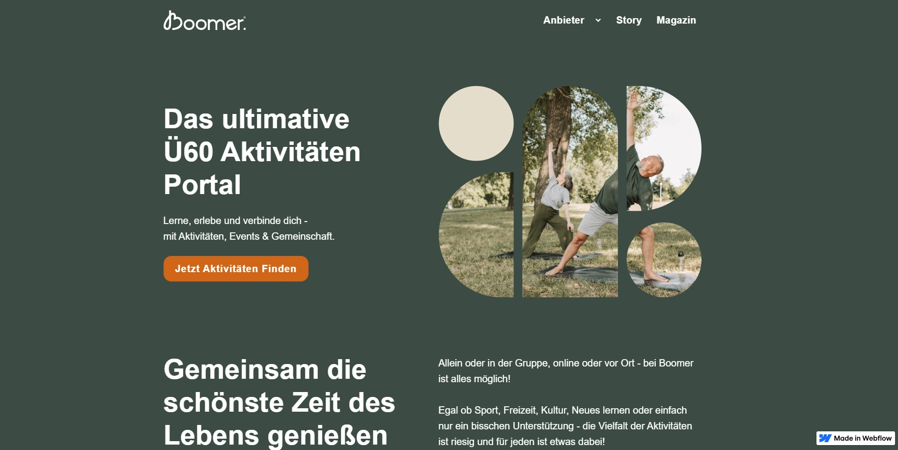 Challenge: Boomer, a platform focused on Germany's 60+ community, needed a landing page design that would make it simple for seniors to engage with a variety of activities and events. The platform wanted to encourage older adults to stay active, learn new skills, and socialize. The challenge was to create a modern yet easy-to-navigate interface that would resonate with the senior audience, many of whom may be less familiar with technology.