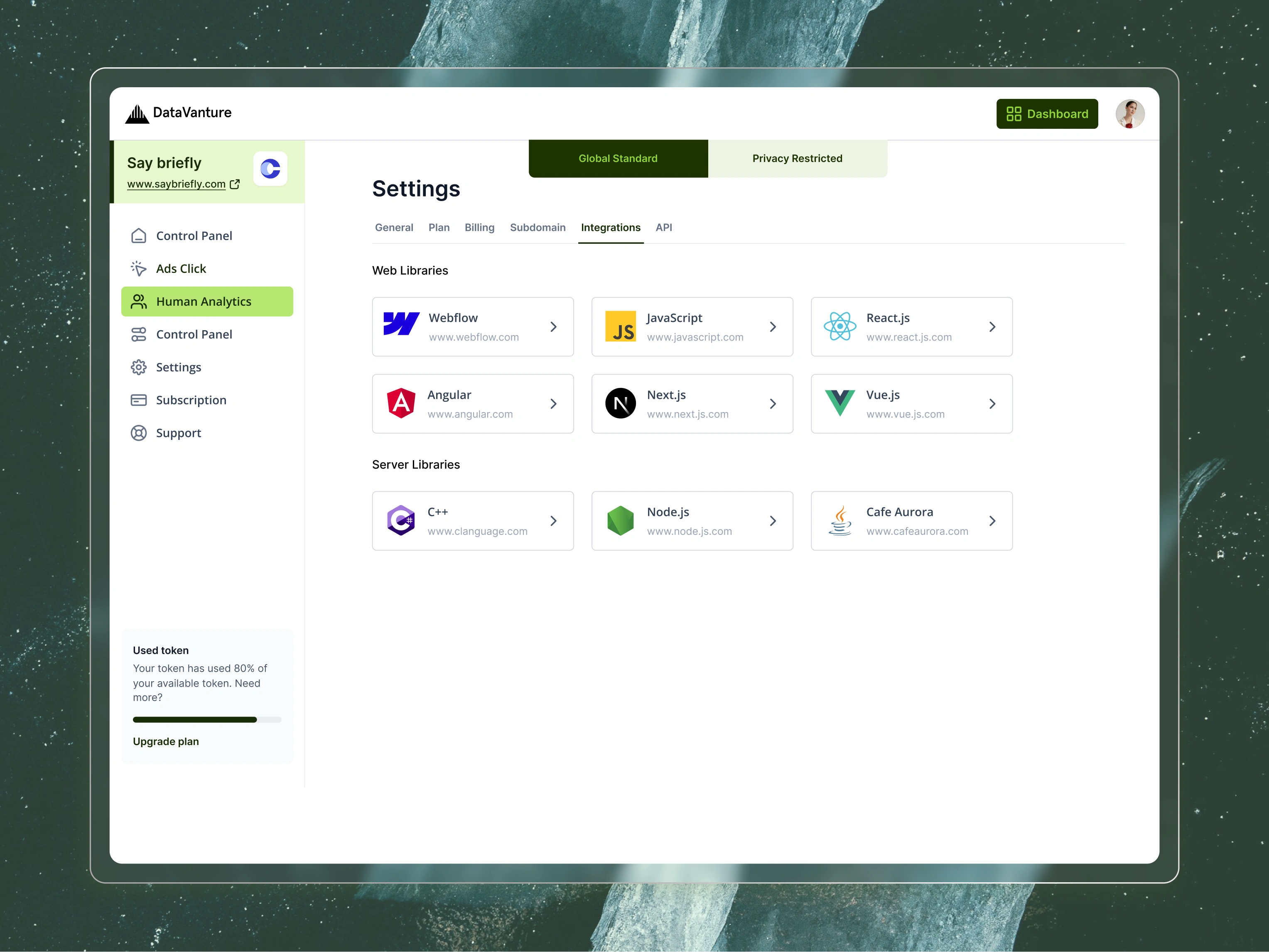 For any SaaS platform to be truly powerful, it must integrate seamlessly into the user's existing workflow and tech stack. This "Integrations" settings page for DataVanture was designed to be a clear, developer-friendly hub for connecting the platform.