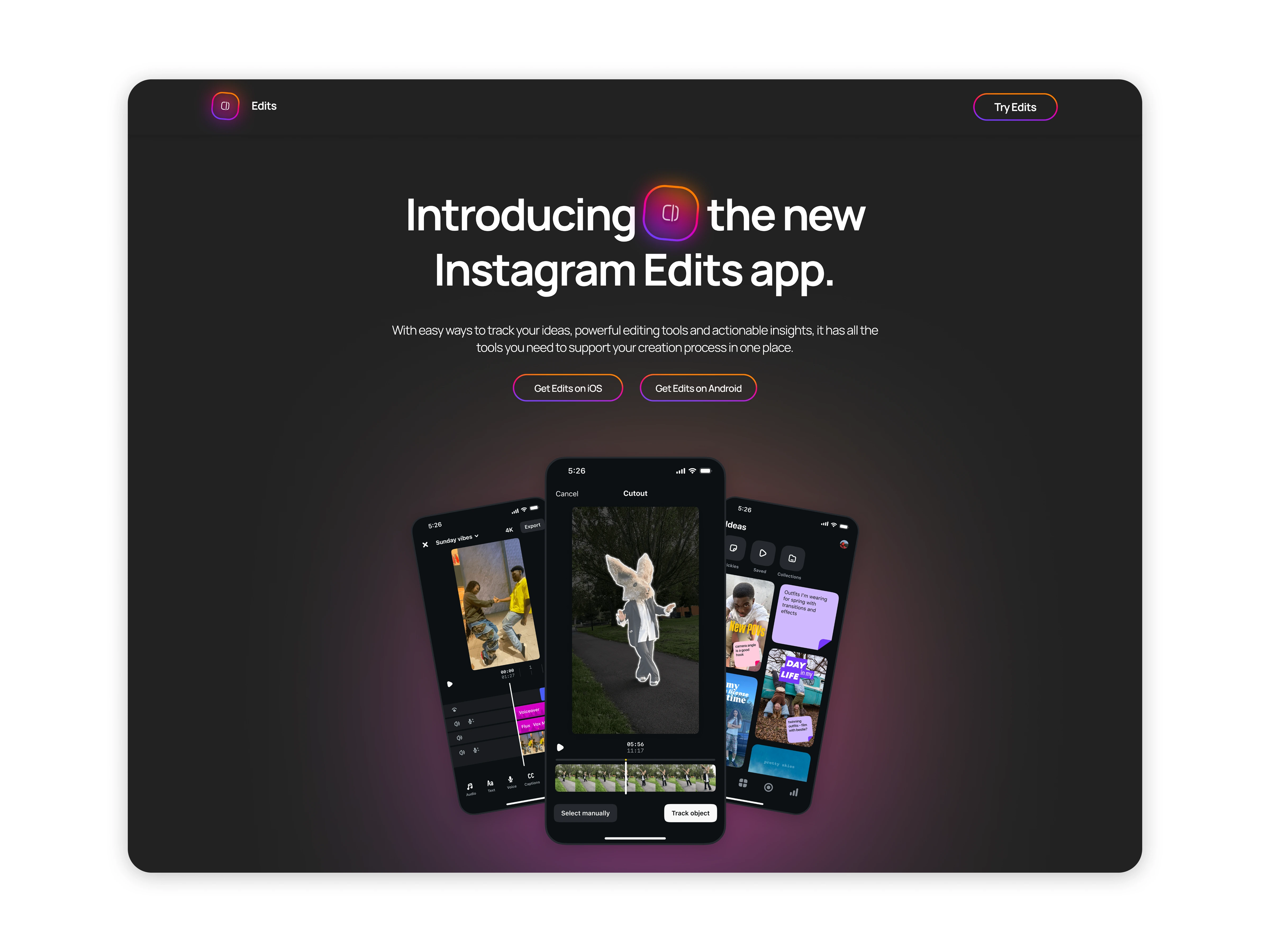 The landing page is designed to introduce and promote the new Instagram Edits app, encouraging mobile downloads by highlighting key features and benefits. It targets creators by combining modern design, focused messaging, and clear calls-to-action.
