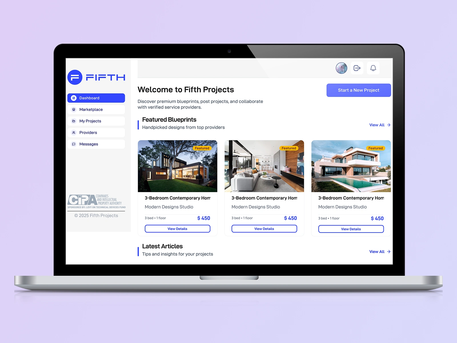 Fifth Projects is designed to be a seamless marketplace connecting Buyers with verified Providers, simplifying access to blueprints and building services while ensuring transparency, trust, and competitive project bids.