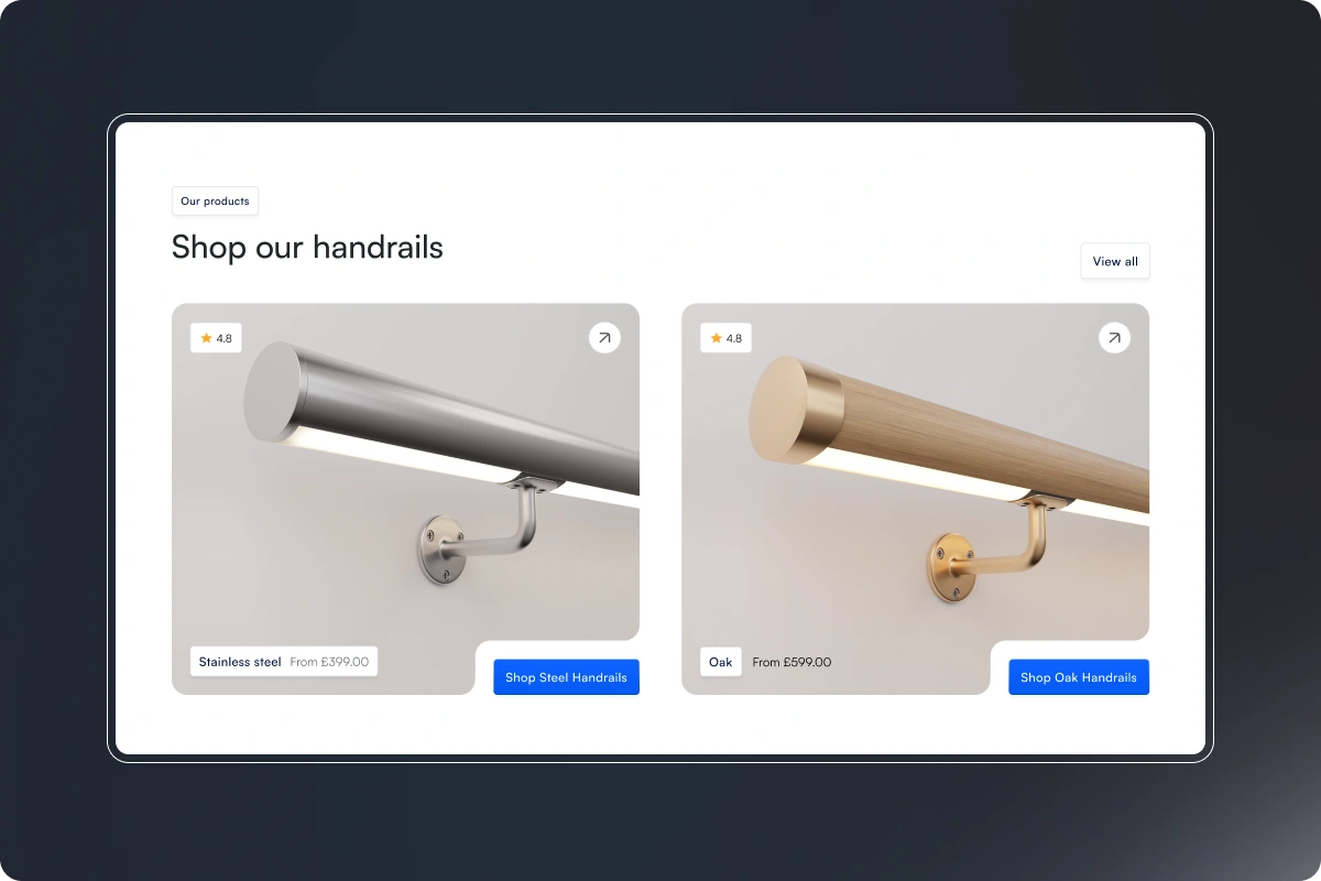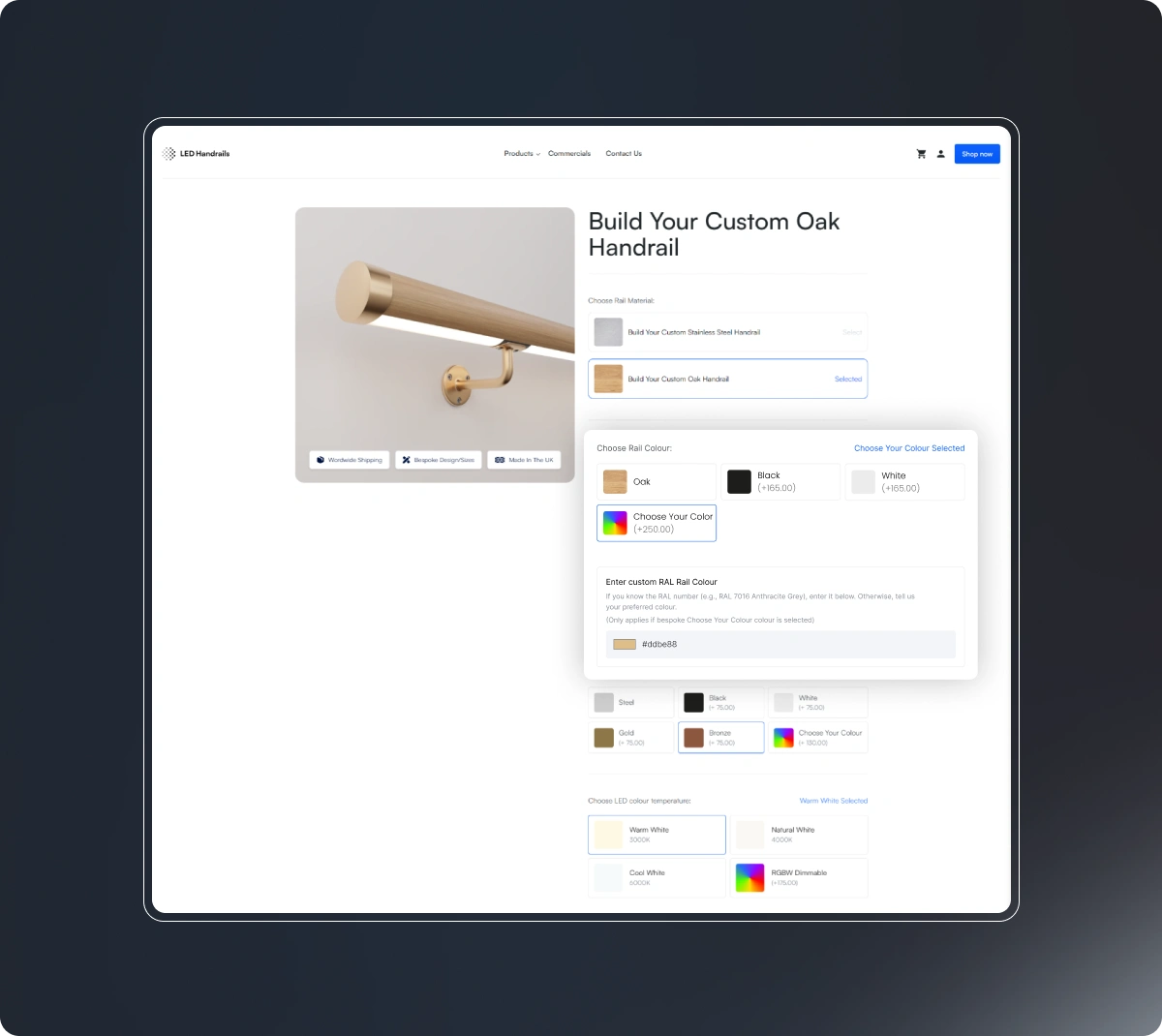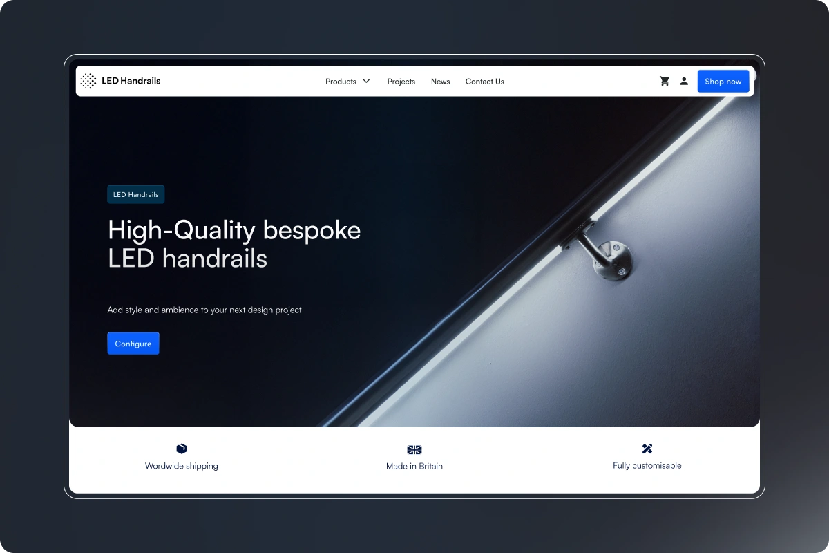LED Hndrails is a premium eCommerce experience focused on custom LED handrails, highlighting high-quality materials, integrated lighting, and bespoke configurations.