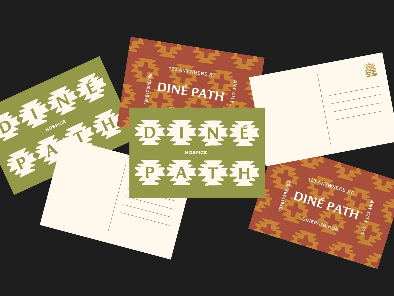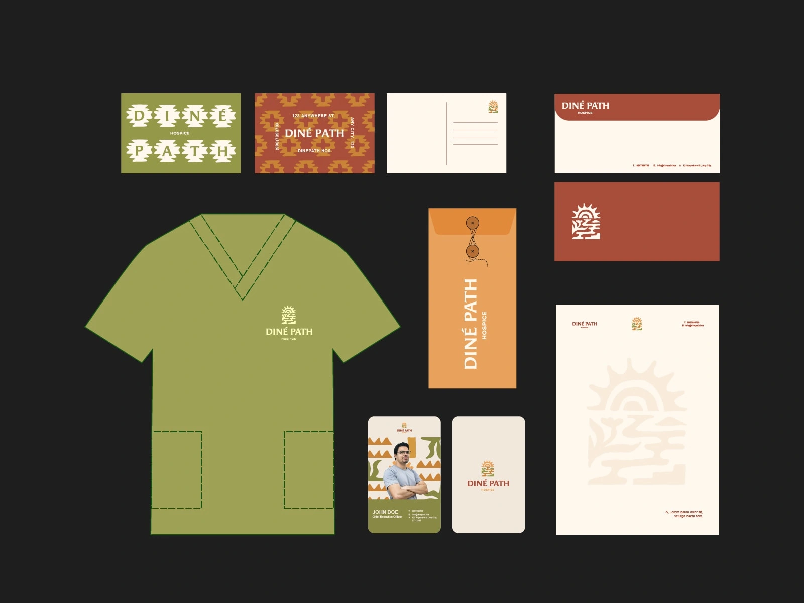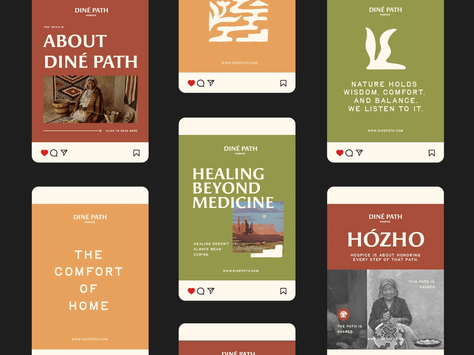 Spanning logo development, collateral, apparel, and social media. The identity blends modern healthcare professionalism with Navajo cultural grounding, using earth-based colors, balanced compositions, and symbolic elements to express hózhó: harmony, dignity, and continuity.