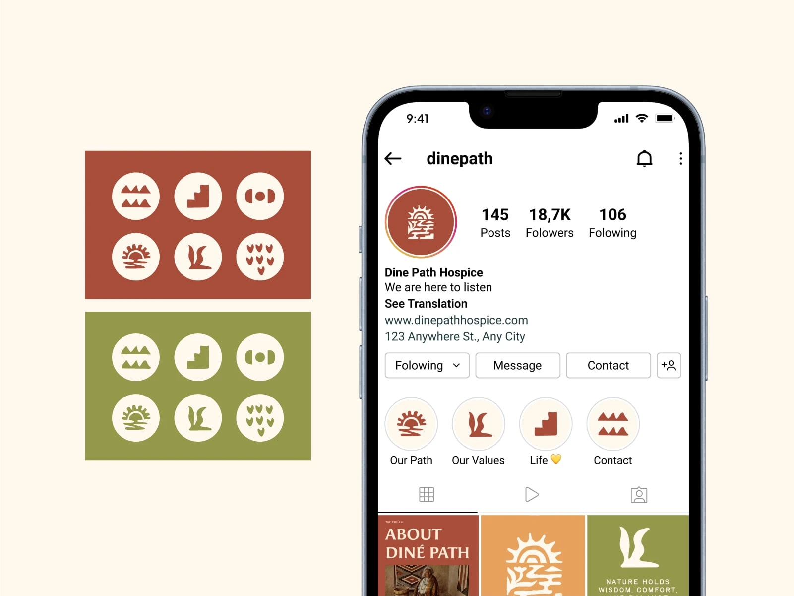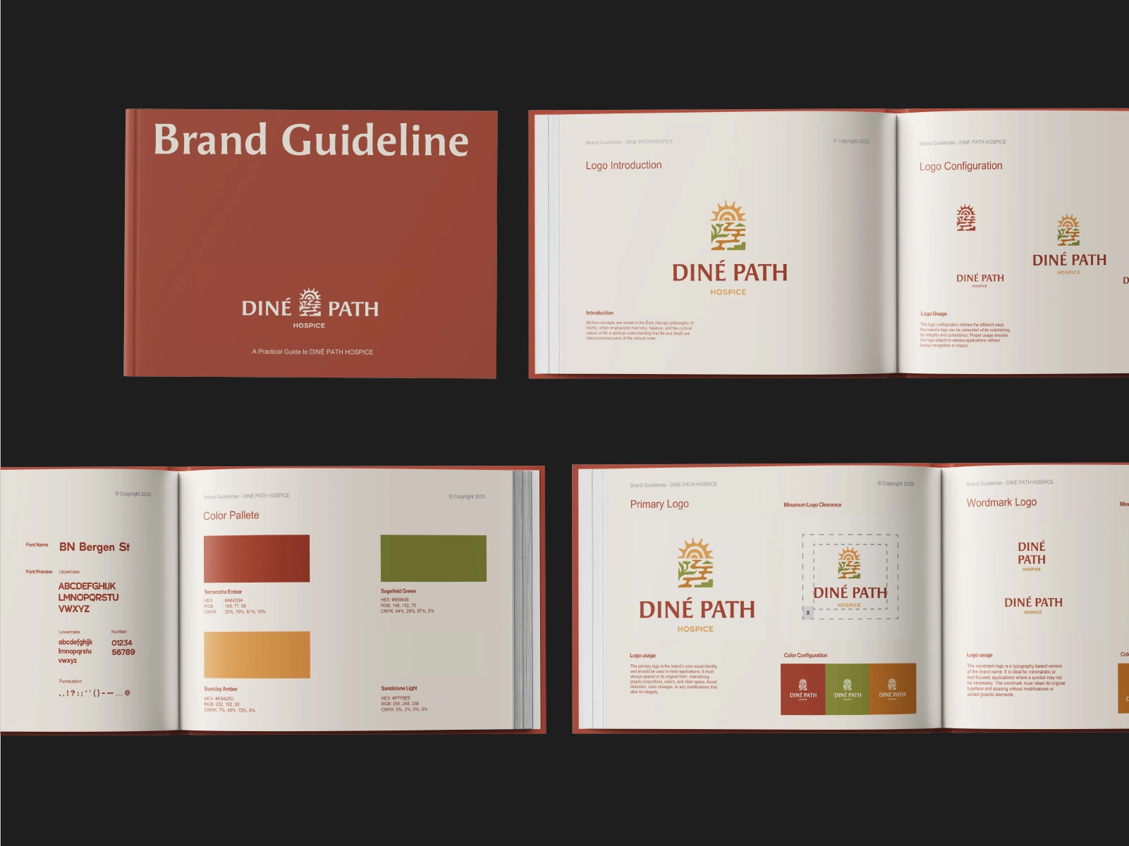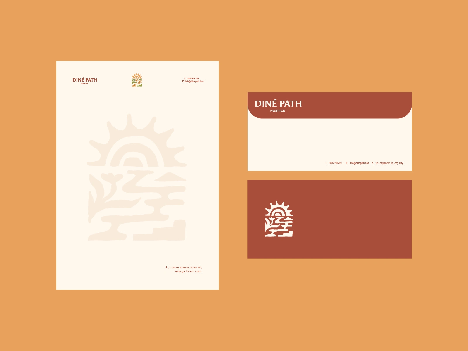 Spanning logo development, collateral, apparel, and social media. The identity blends modern healthcare professionalism with Navajo cultural grounding, using earth-based colors, balanced compositions, and symbolic elements to express hózhó: harmony, dignity, and continuity.