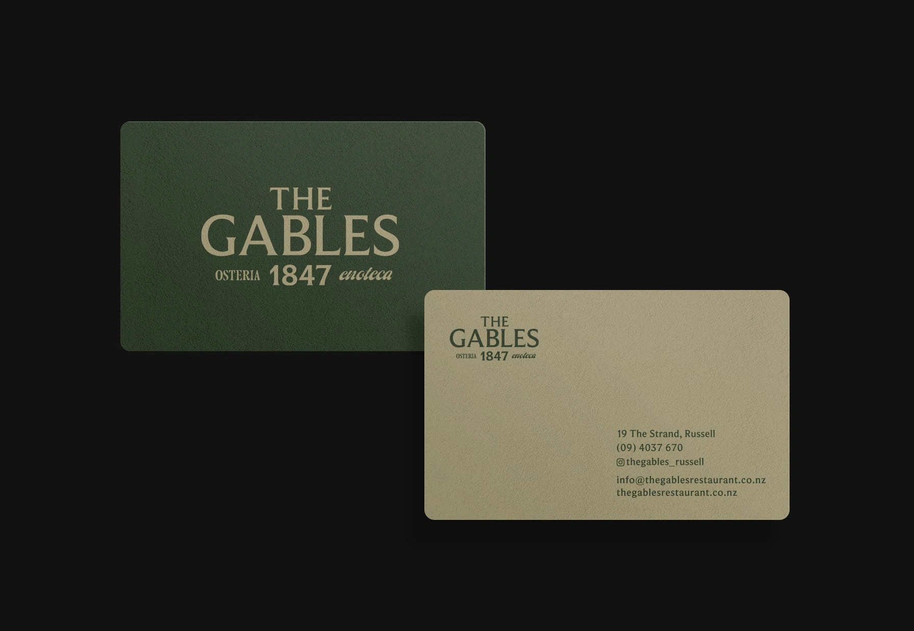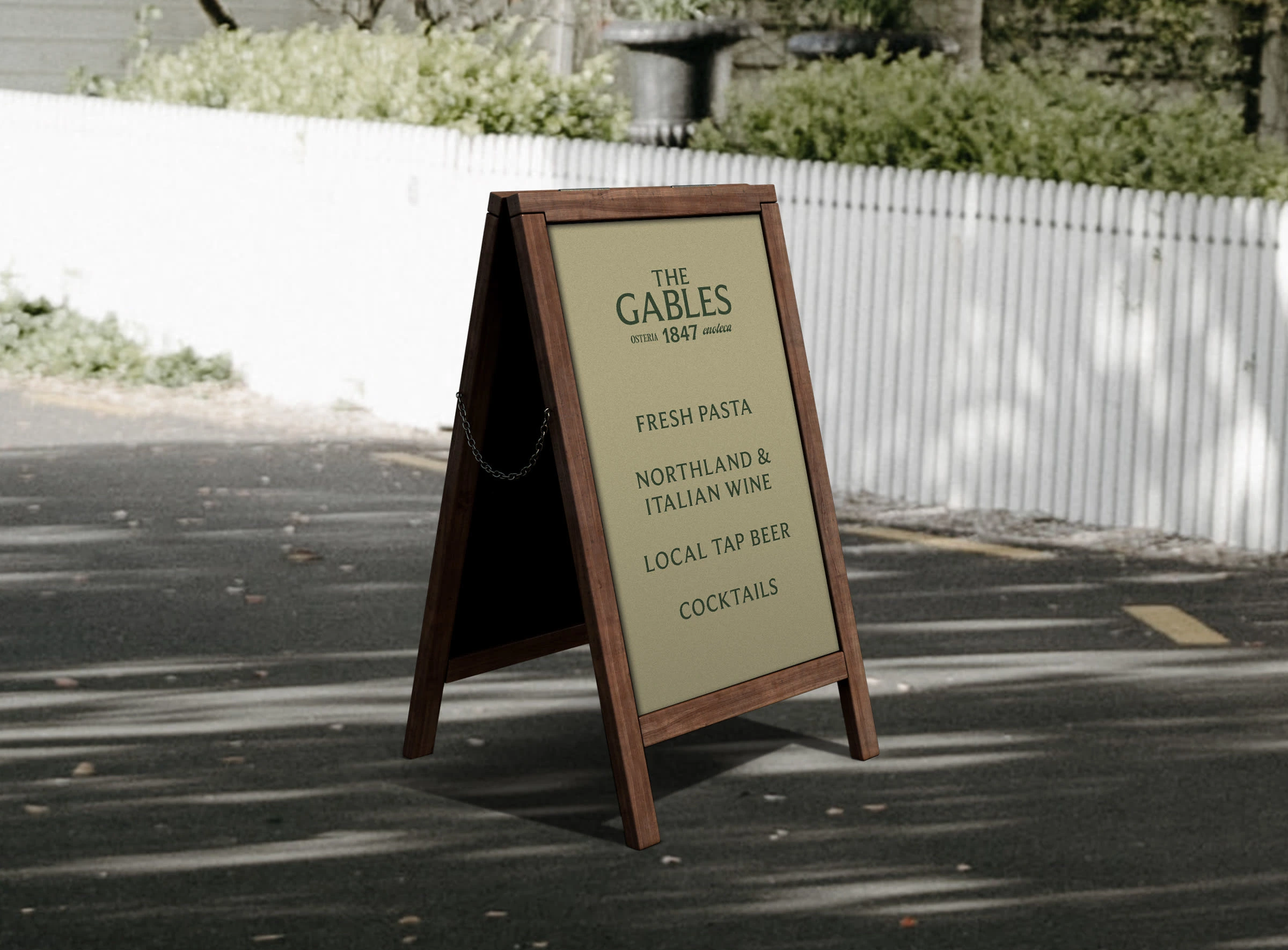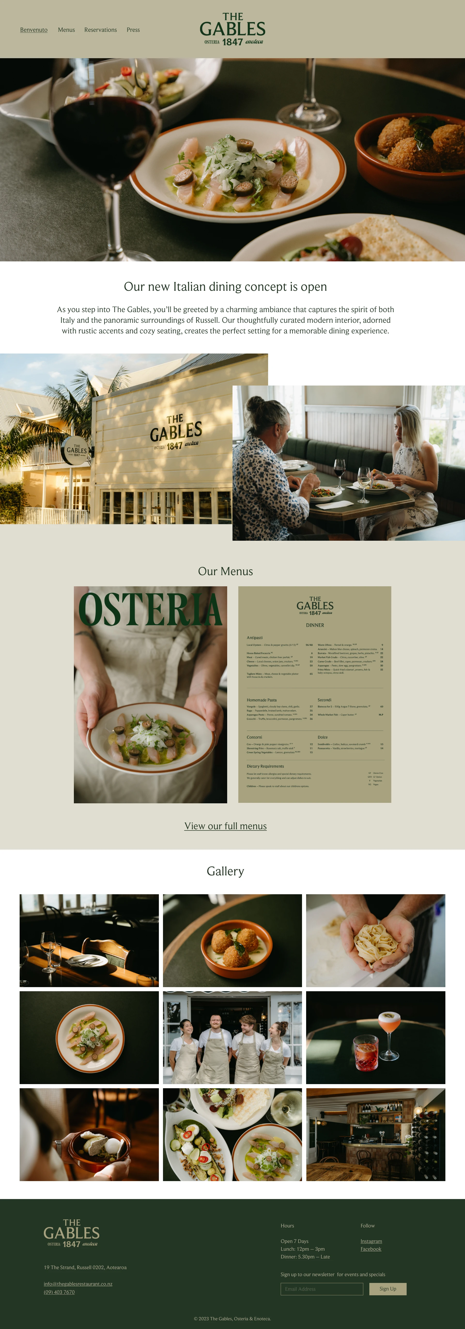 Accompanying a new Italian restaurant dining concept ‘The Gables’ required a fresh new look. A blend of old-world elegance with contemporary design and typography established an unpretentious yet sophisticated feel for the new brand. Handcrafted pasta and approachable Italian on the Russell Waterfront, generous and uncomplicated, warm and welcoming with an ambiance befitting of a casual Osteria. For the new restaurant, we wanted to honor the local Russell history and infuse it with an Italian-style charm and atmosphere – Benvenuto!
