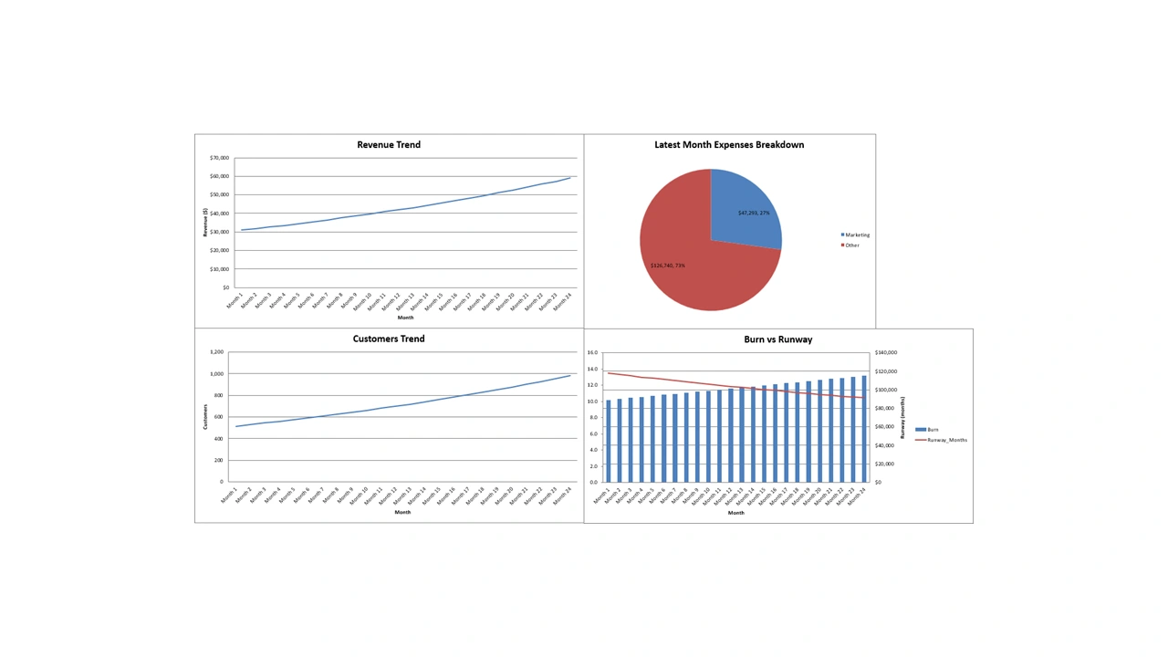 KPI dashboard in Excel/Google Sheets for startups. Tracks revenue growth, CAC, LTV, burn rate & runway. Clear insights for smarter, data-driven decisions.