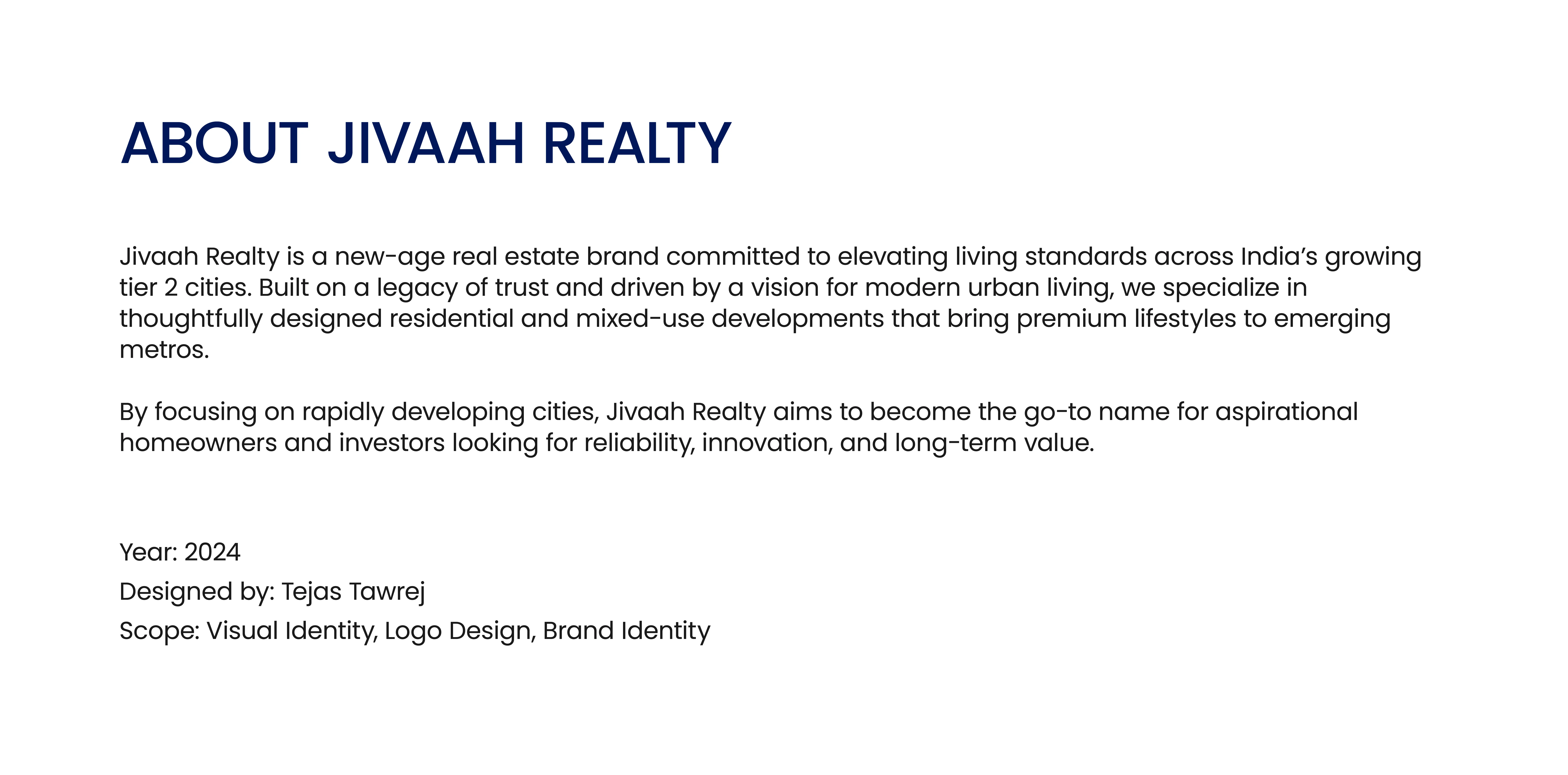 Jivaah Realty is redefining luxury living in tier 2 cities across India. To reflect their commitment to timeless quality and modern elegance, I designed a complete brand identity that blends heritage with contemporary appeal. The new logo and visual system communicate sophistication, while staying approachable and rooted in the values of craftsmanship and sustainable living, attracting homebuyers seeking refined yet comfortable spaces.