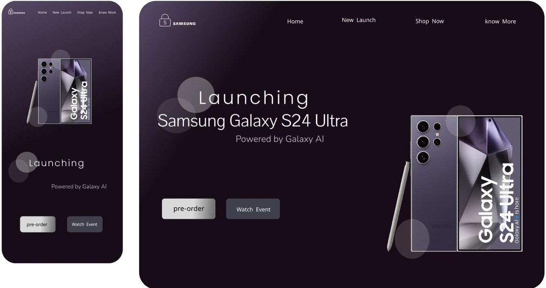 A concept landing page for the Samsung Galaxy S24 Ultra featuring a dark premium layout, responsive design, product showcase and preorder call-to-action.