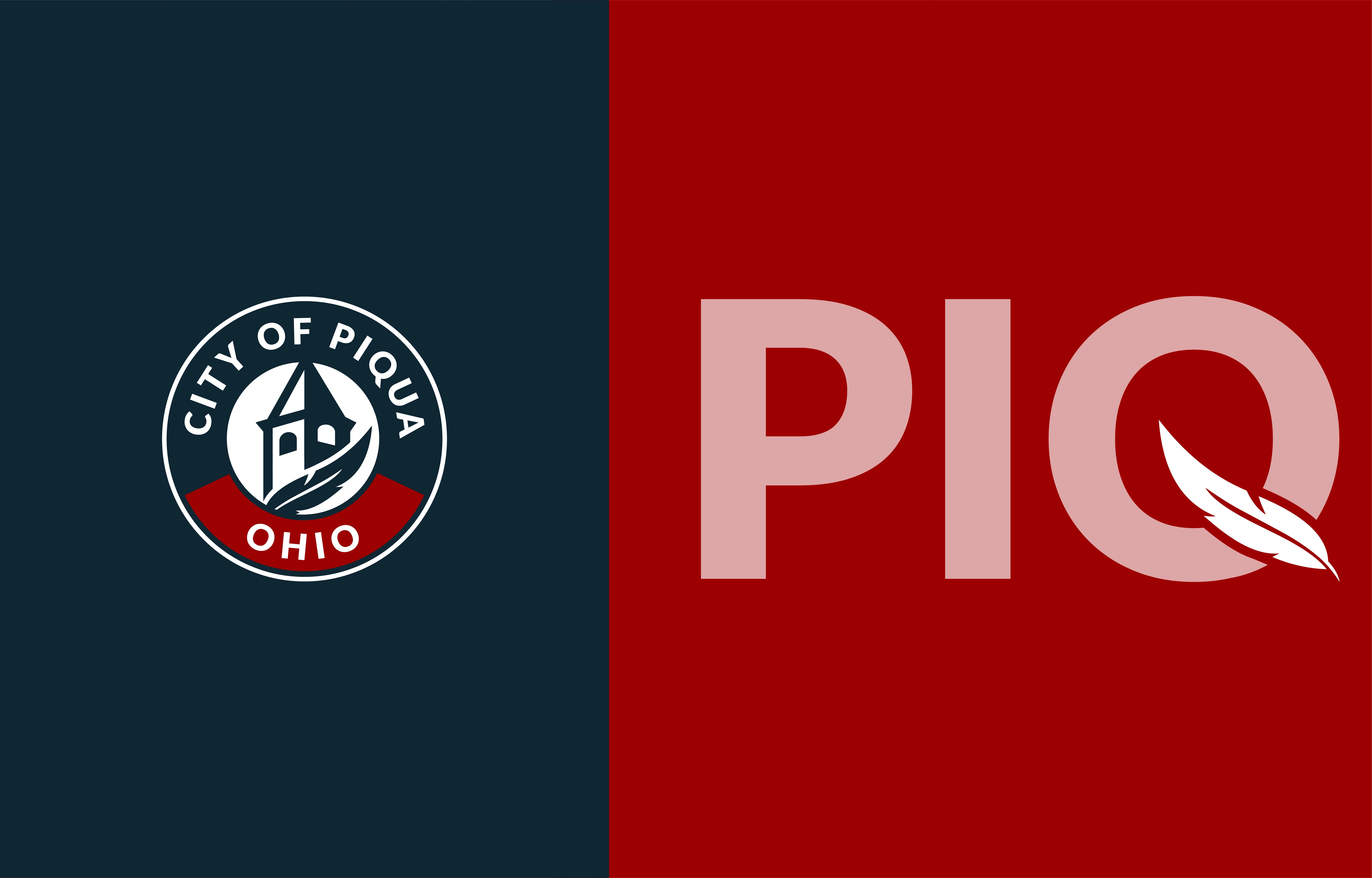 The system includes a primary civic badge, horizontal and vertical logo lockups, a standalone PIQUA wordmark with an integrated feather, supporting badges, and a flexible color palette designed for real-world municipal use.