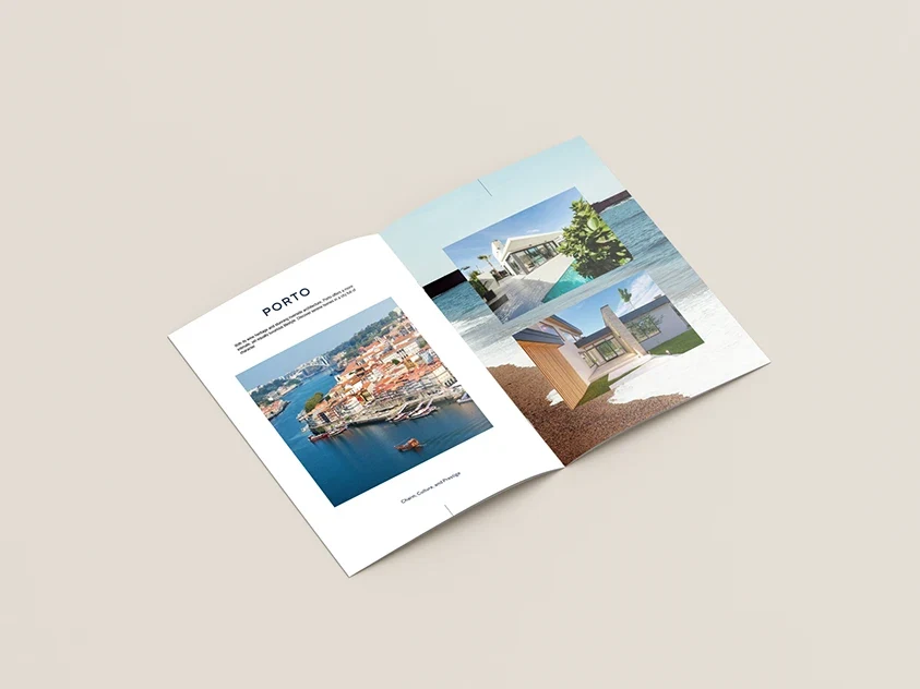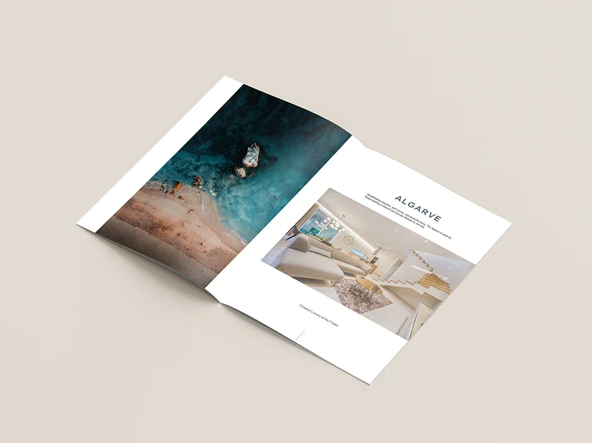 Visual identity and brochure design for luxury real estate firm in Portugal, attracting high-end international buyers.