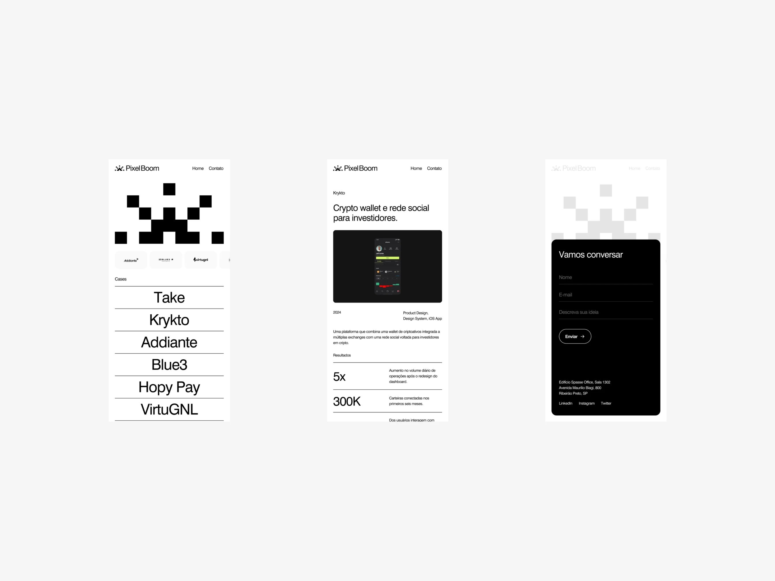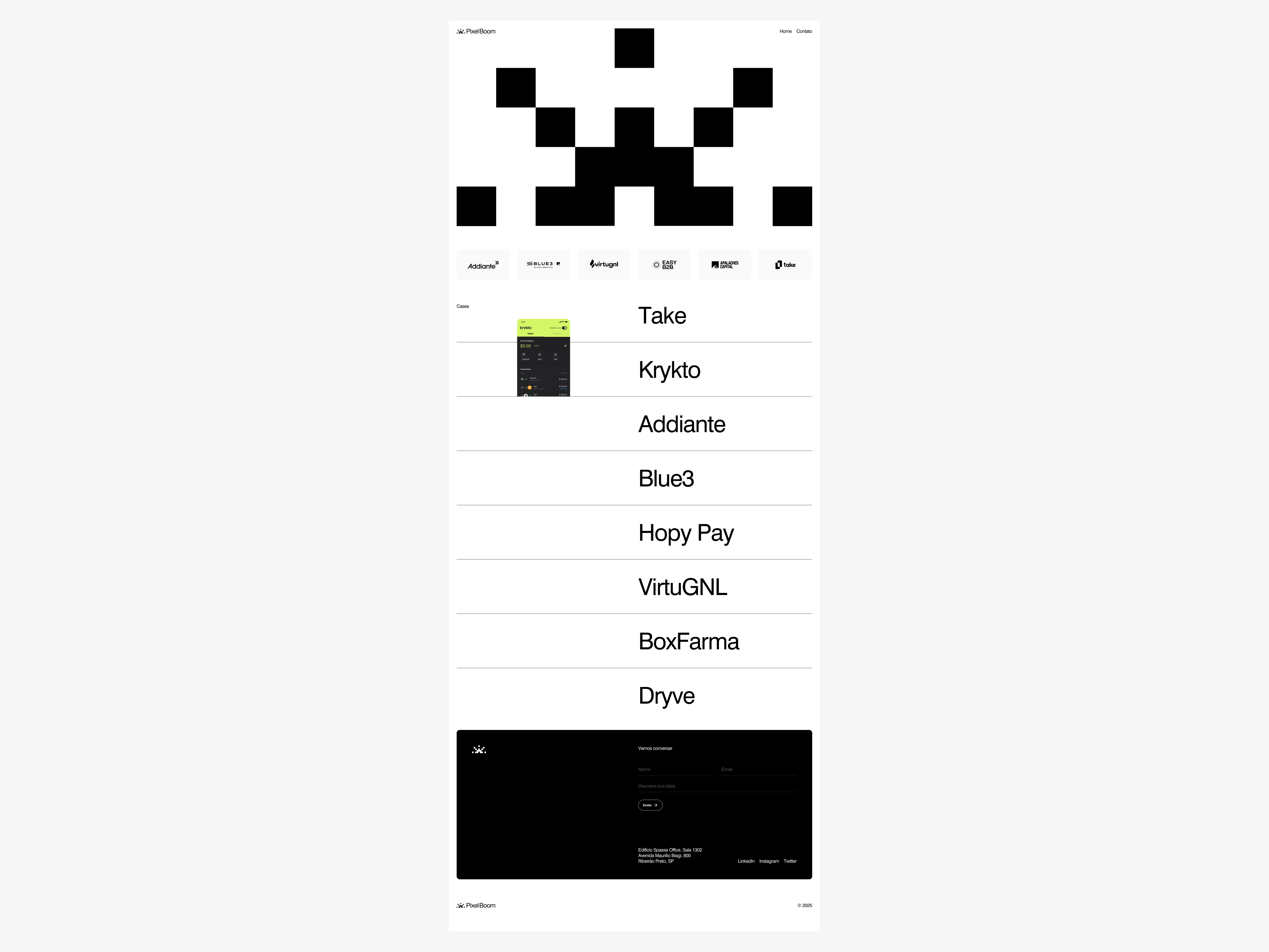 Pixel Boom is a Brazilian hybrid design and technology studio that creates high-performance websites and digital products where every detail serves a purpose. With 20+ years of experience, the studio combines strategy, design, and development for companies seeking a digital presence with craft and results. I was invited to explore directions for the studio's new website.