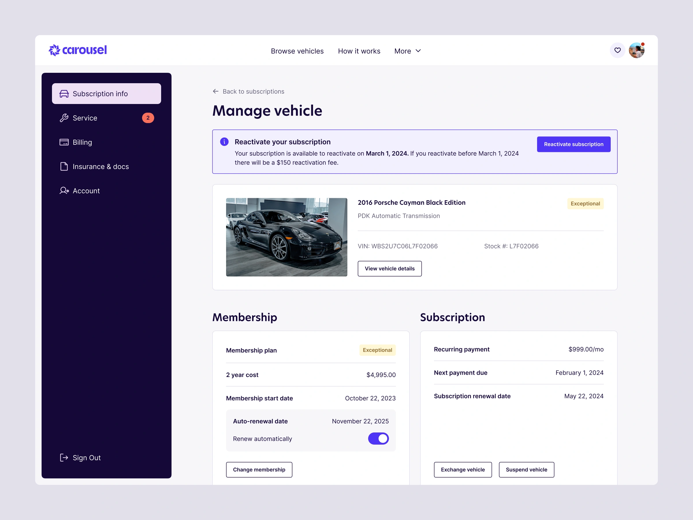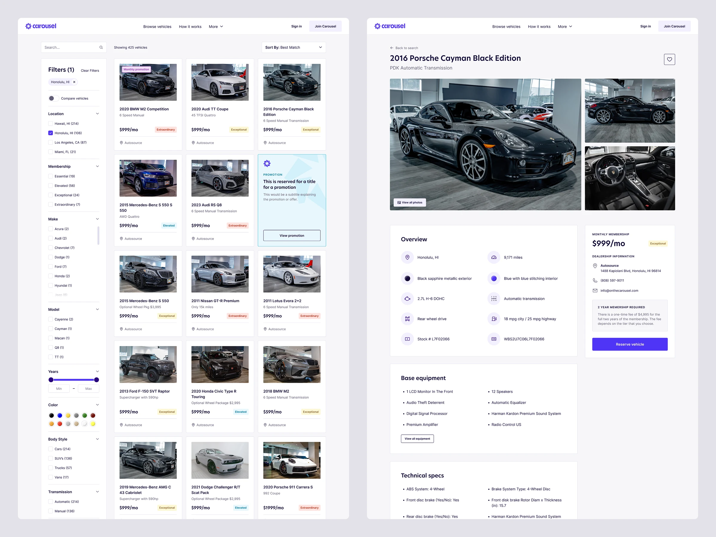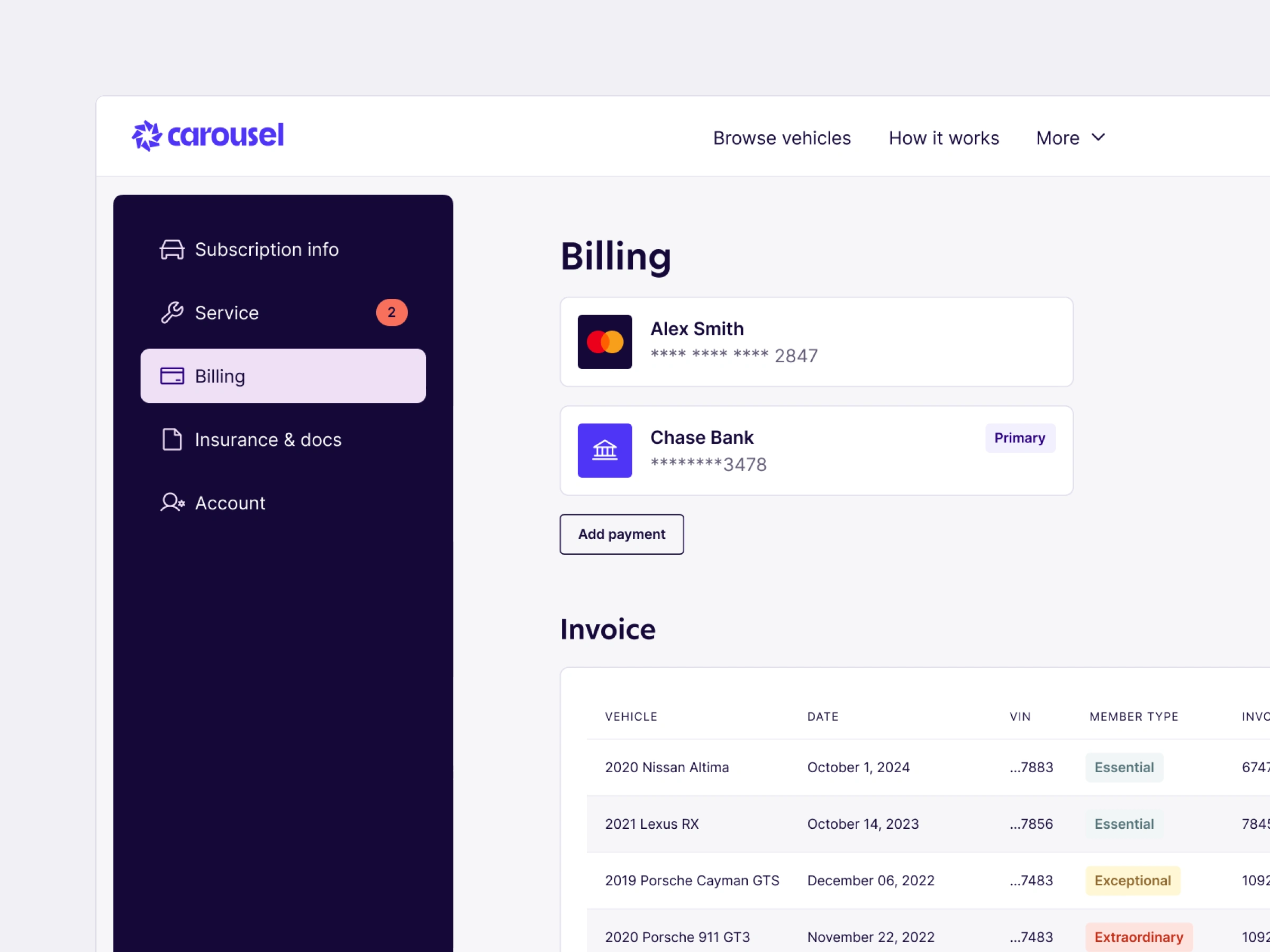 Carousel. Carousel is a vehicle subscription service that makes car ownership seamless and hassle-free. We helped them overhaul their entire workflow from spreadsheets to a robust online booking platform, client portal, and admin portal.