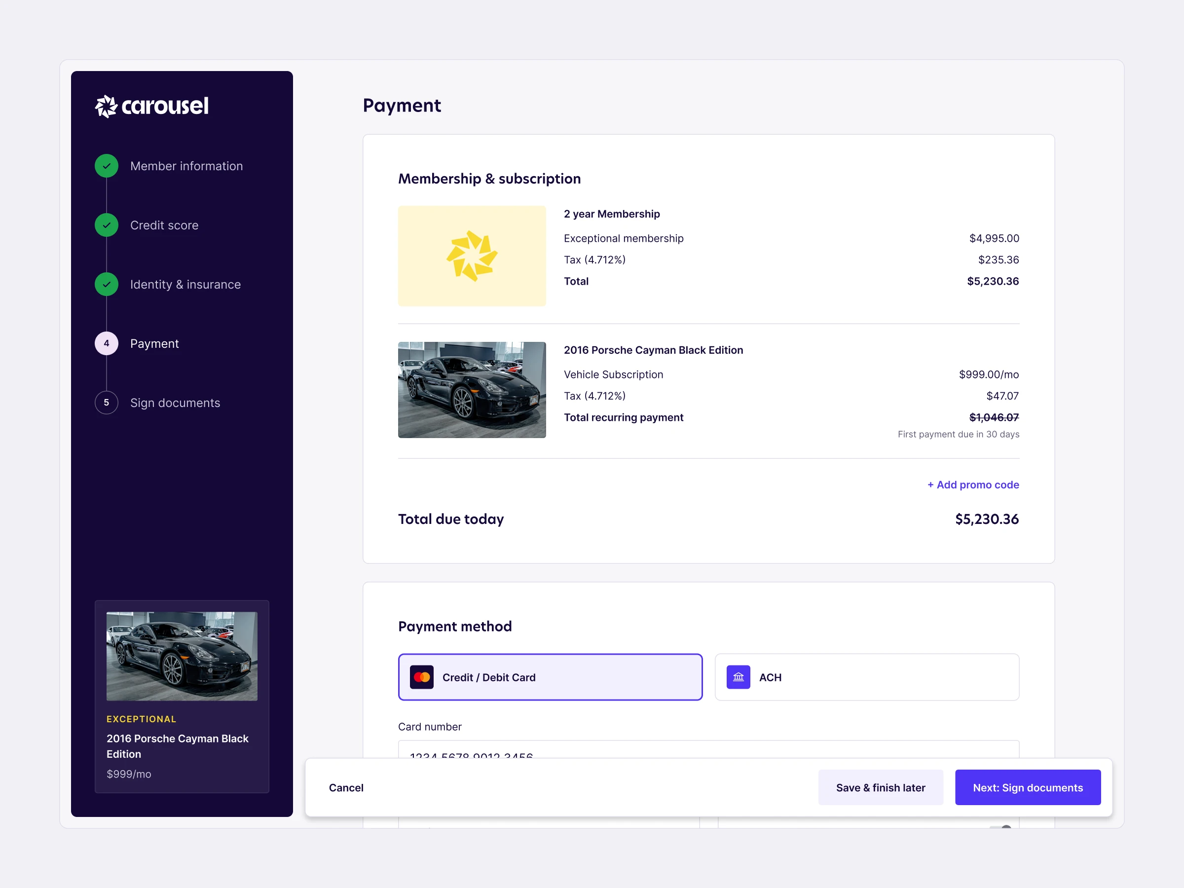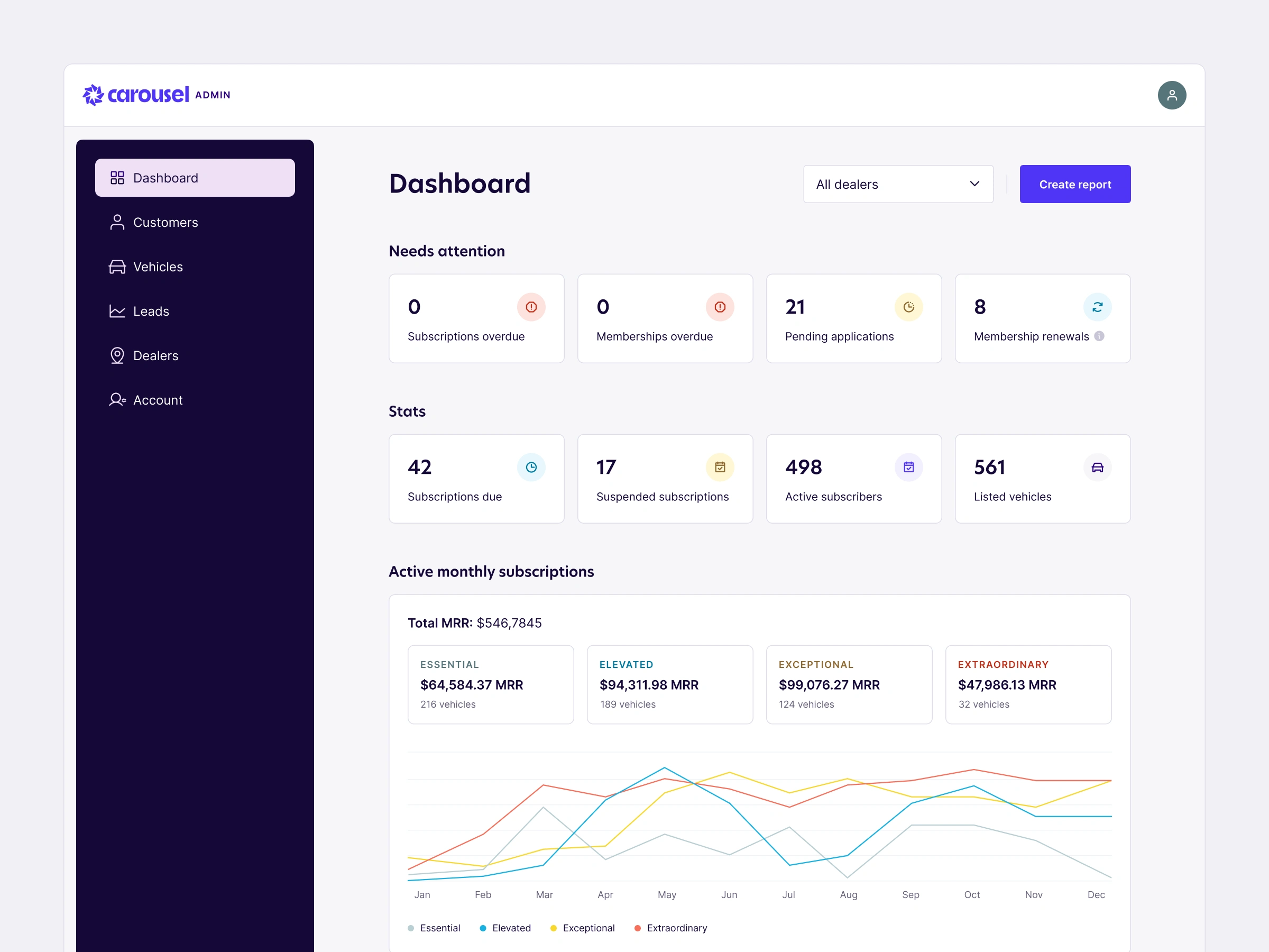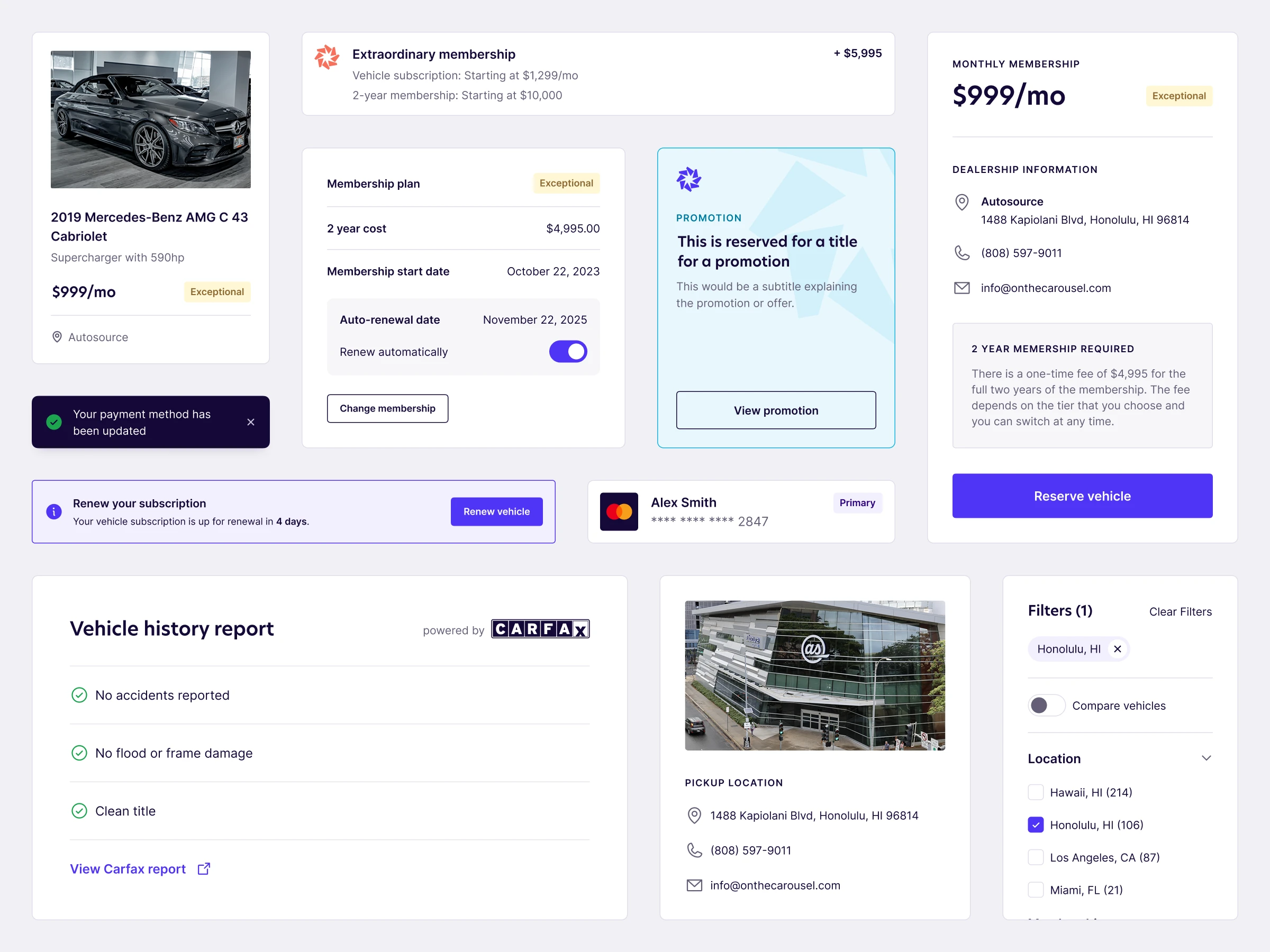 Carousel. Carousel is a vehicle subscription service that makes car ownership seamless and hassle-free. We helped them overhaul their entire workflow from spreadsheets to a robust online booking platform, client portal, and admin portal.