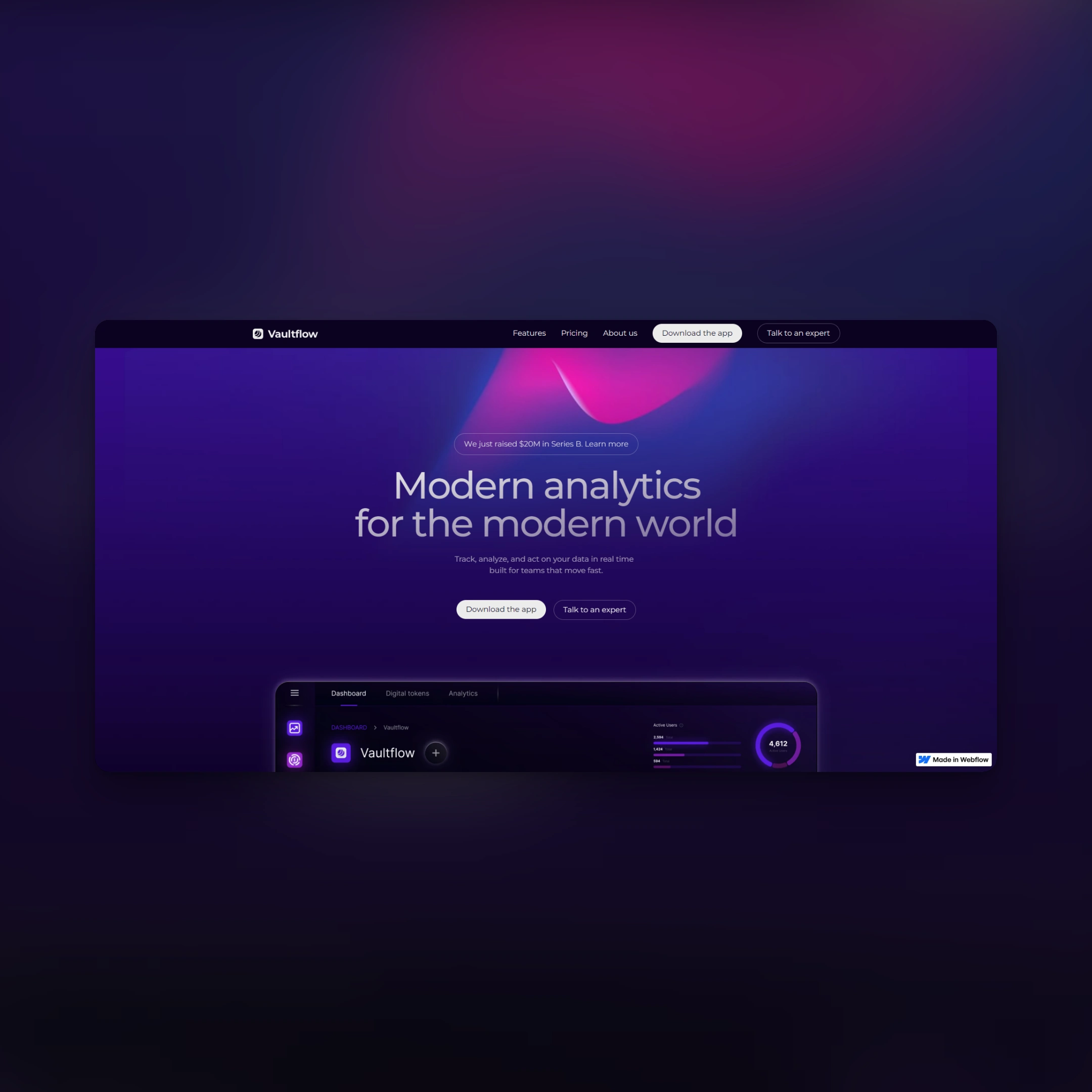 Personal project showcasing an Analytics SaaS landing page with page load animations, marquee fade effect, and dashboard mockup. Built in Webflow."