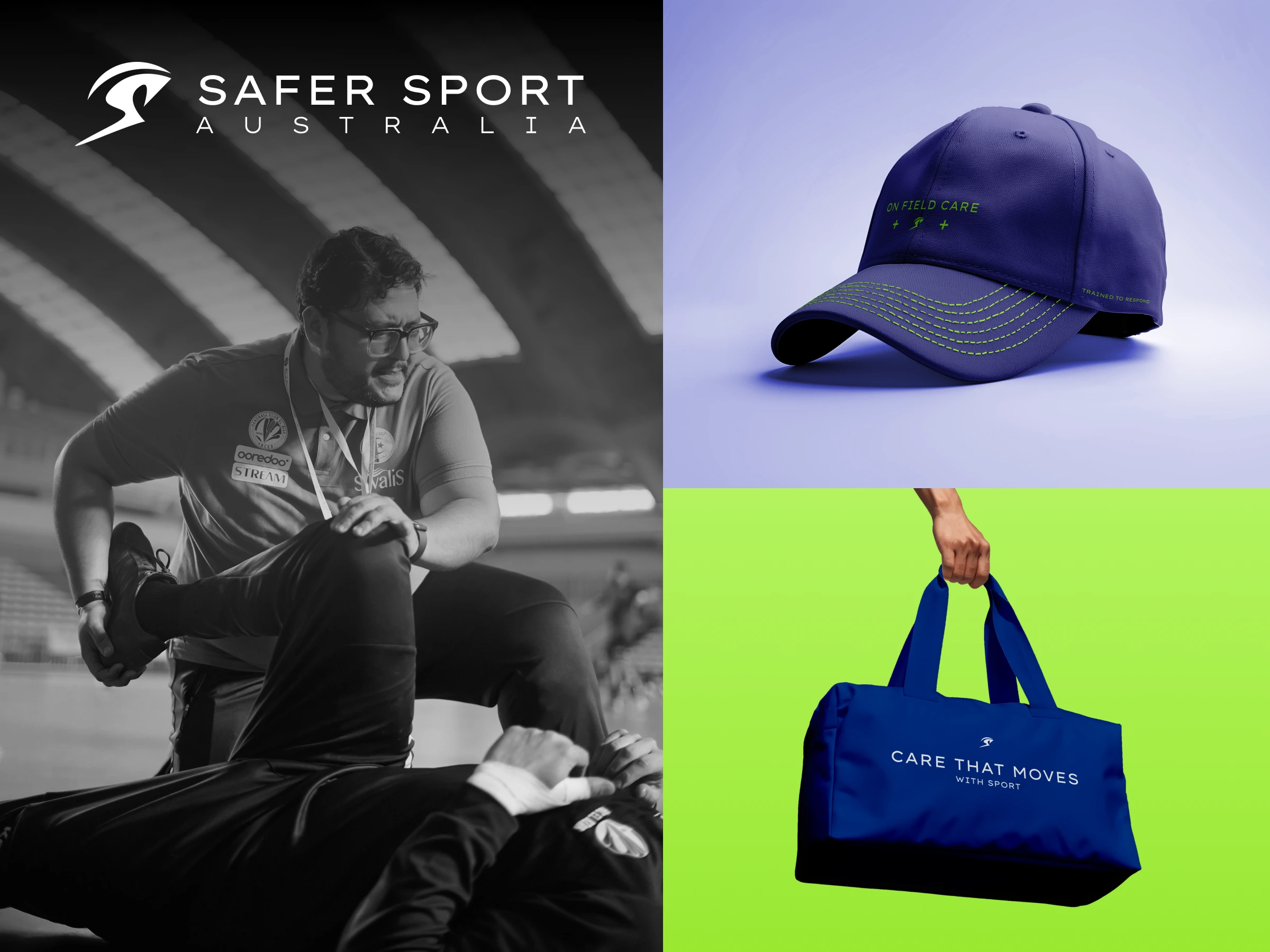 The final solution introduces a custom-built “S” symbol that simultaneously represents motion and protection. The form is shaped to suggest an athlete in forward movement, symbolizing performance and sport, while a sweeping arc subtly wraps around the figure, acting as a visual metaphor for care, prevention, and safeguarding.