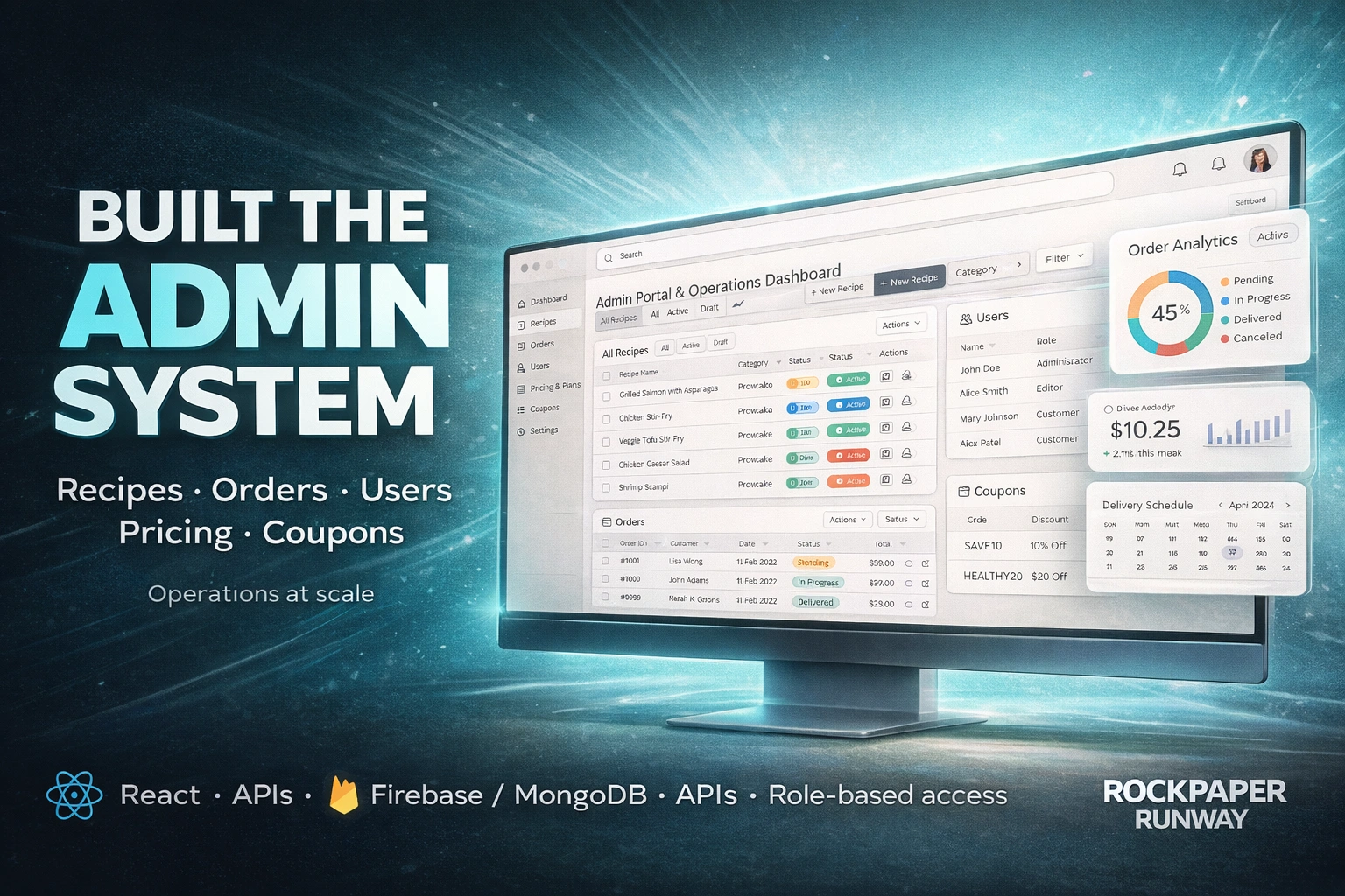Designed and built a centralized admin portal to manage recipes, pricing, plans, coupons, users, and orders for a meal kit delivery platform.