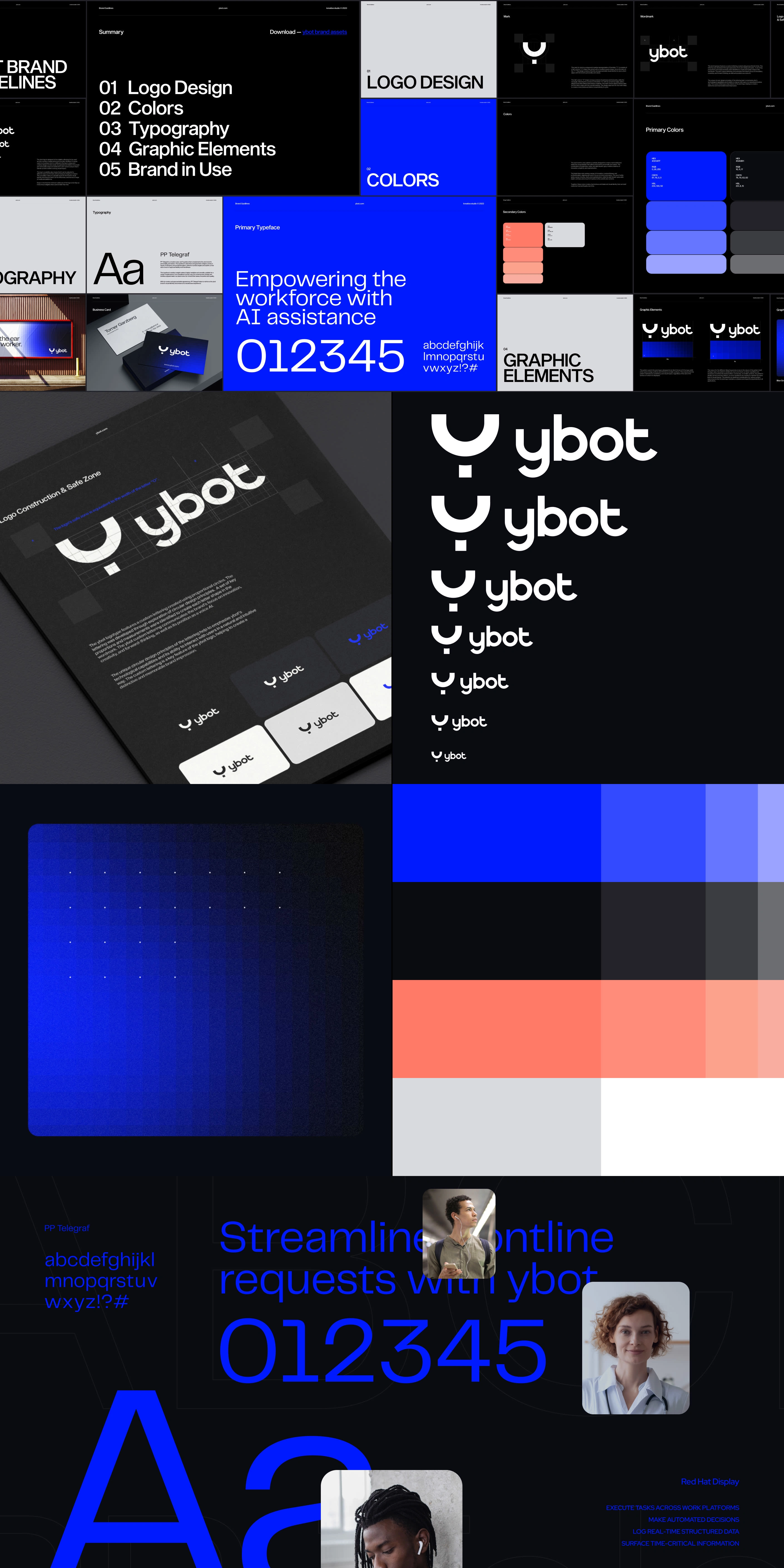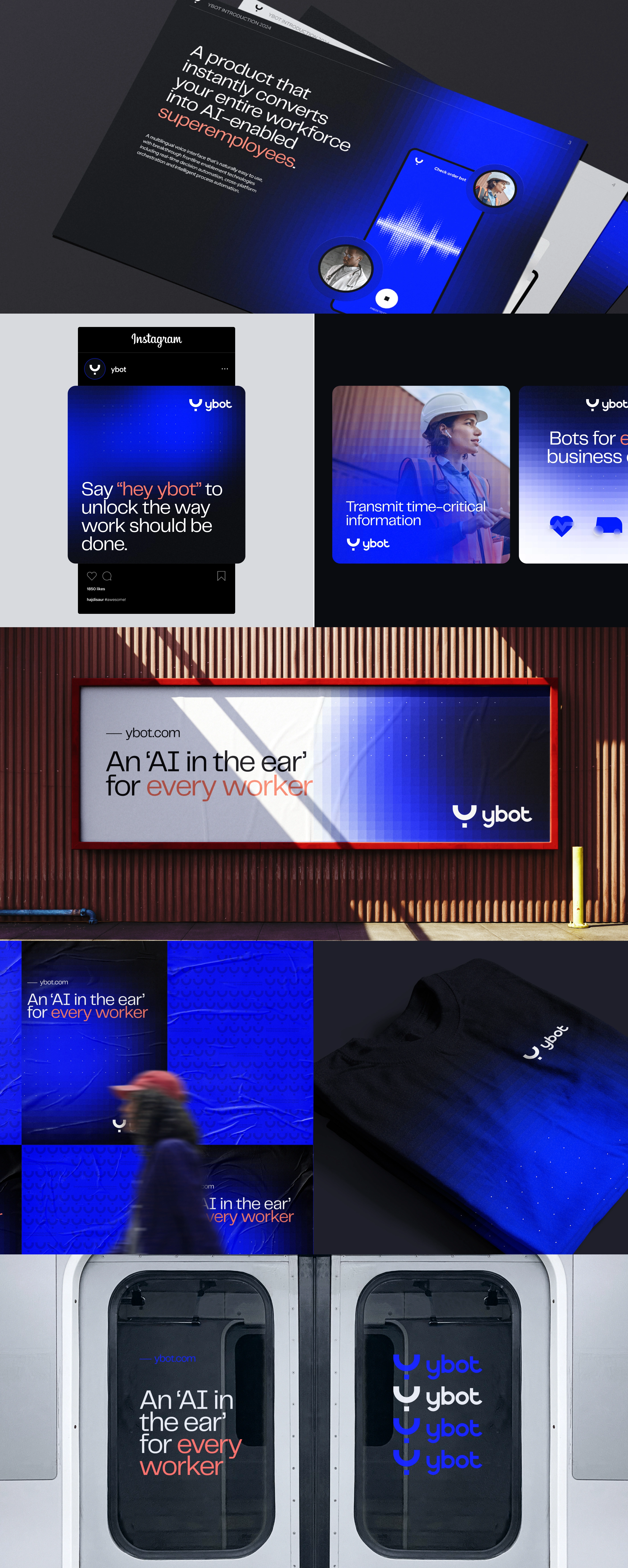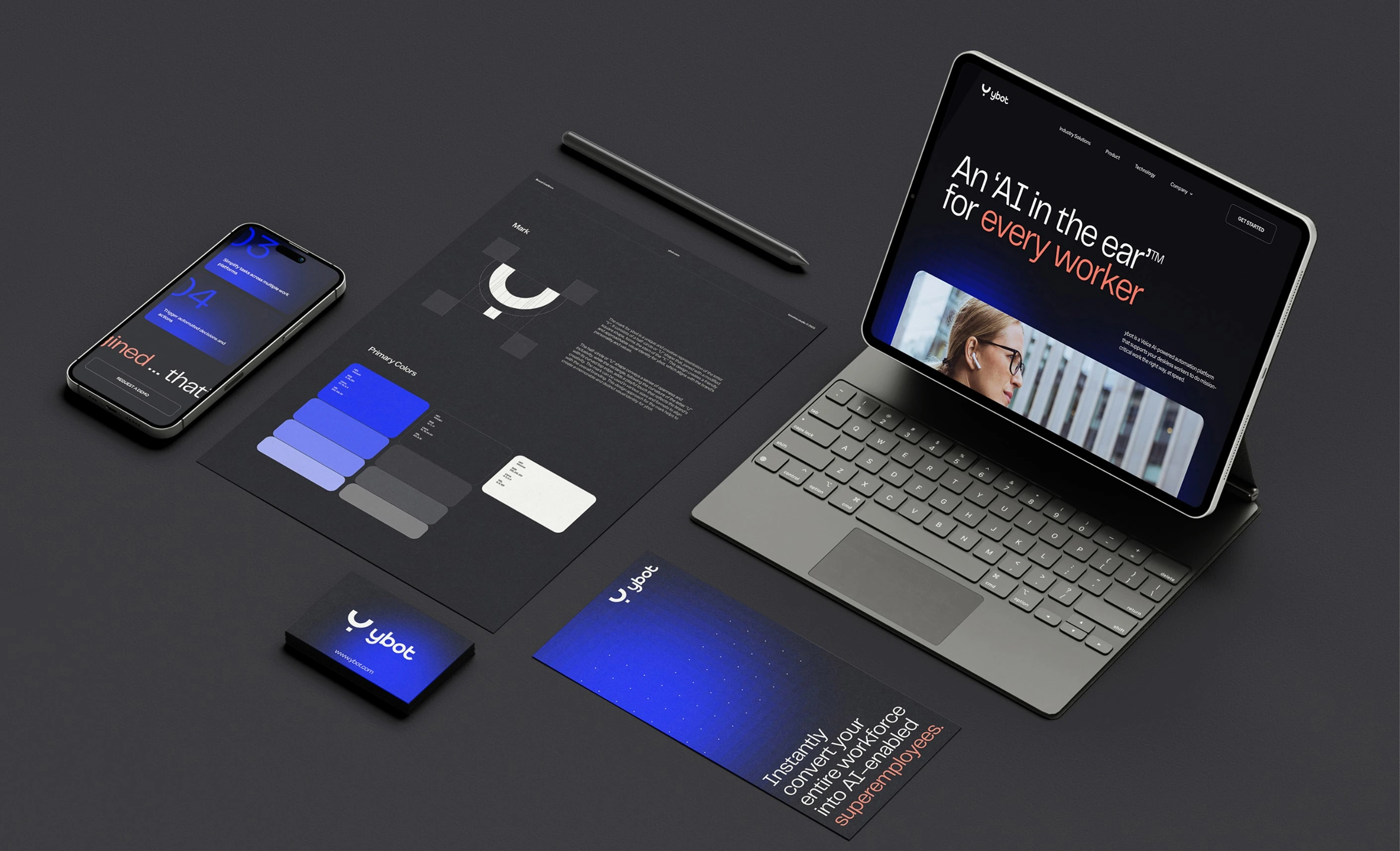 A new visual identity, website, app, and various brand assets created for ybot, an AI-powered platform for deskless workers.