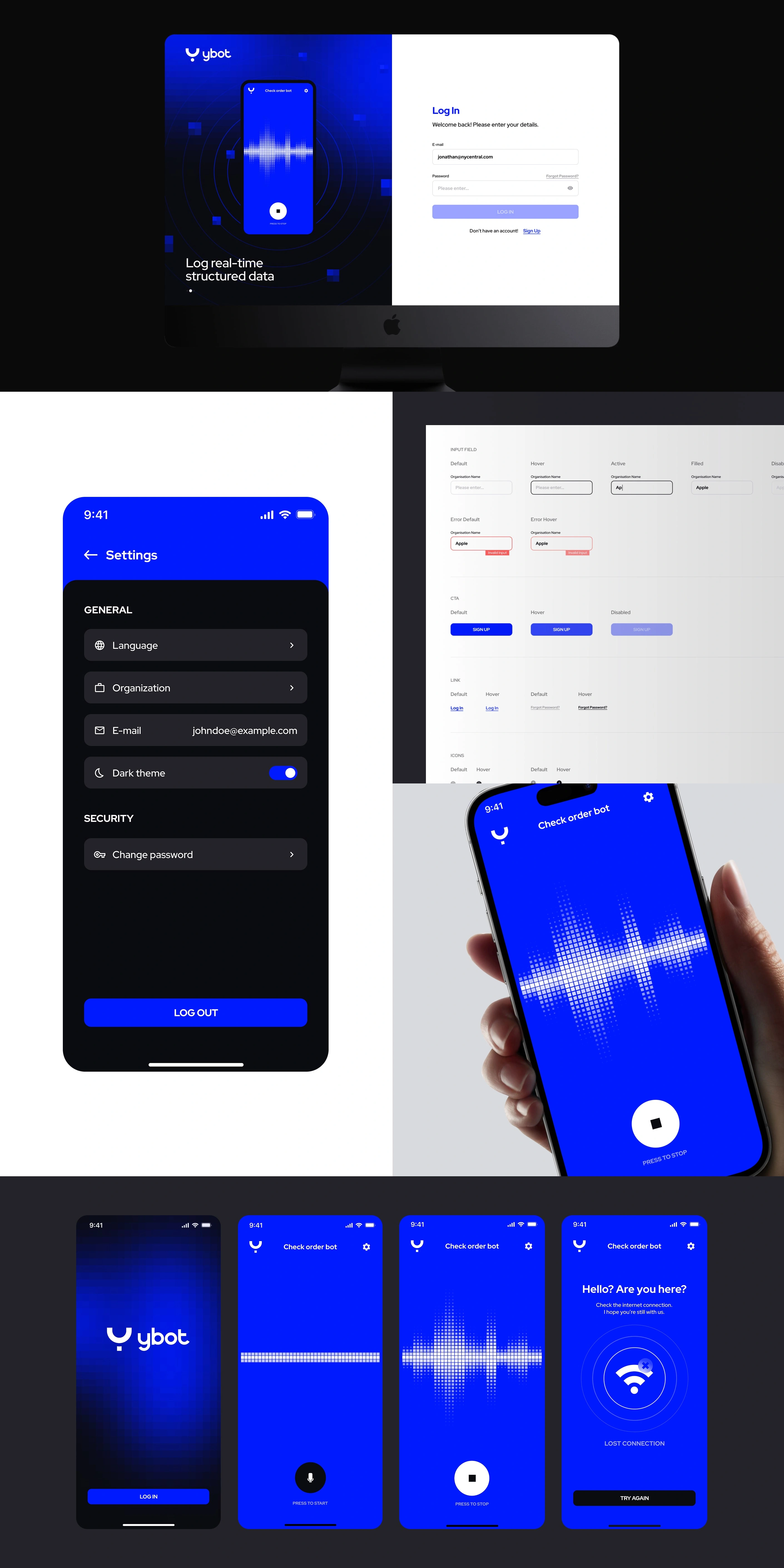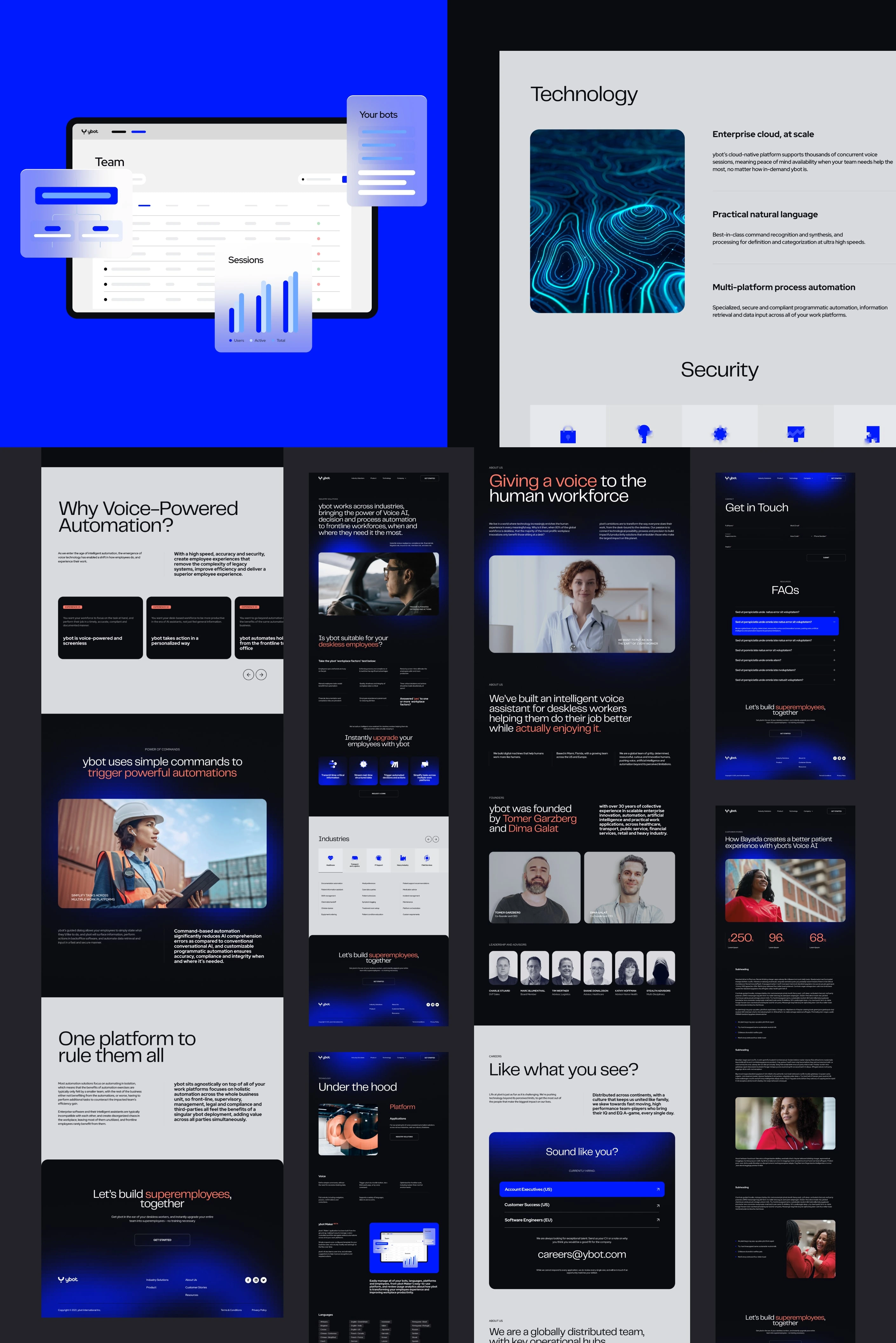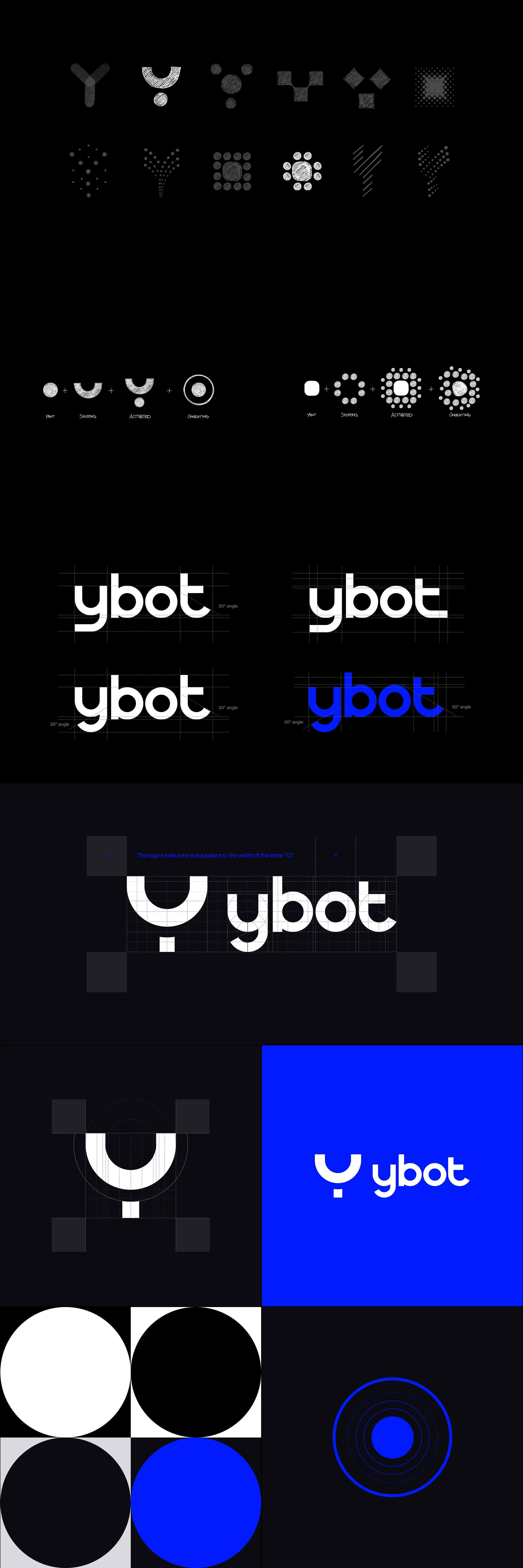 A new visual identity, website, app, and various brand assets created for ybot, an AI-powered platform for deskless workers.