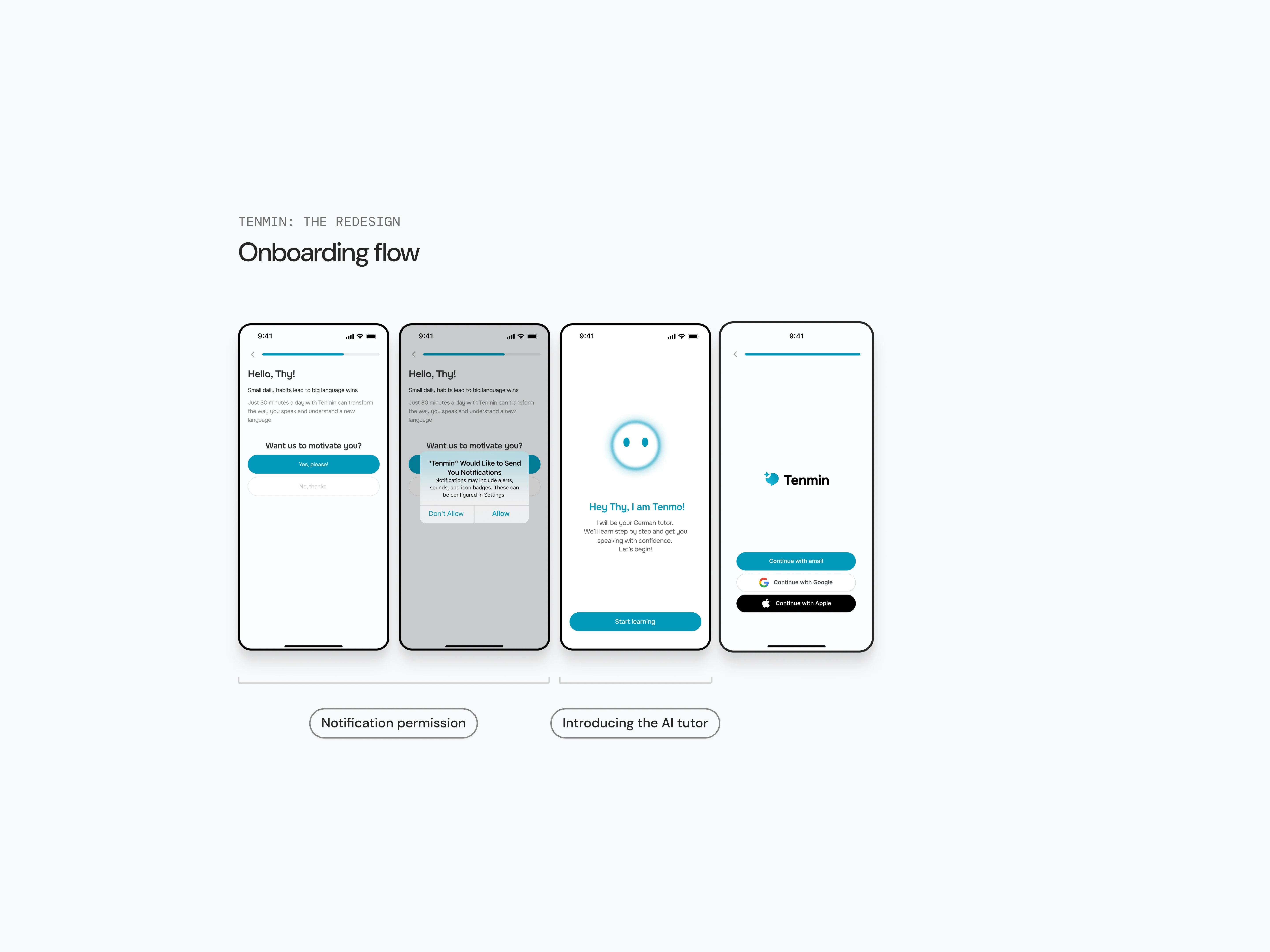 Onboarding flow: Enhanced the existing onboarding flow to introduce Tenmin’s AI tutor in a warm and confident way, ensuring new users quickly built trust and felt motivated to return