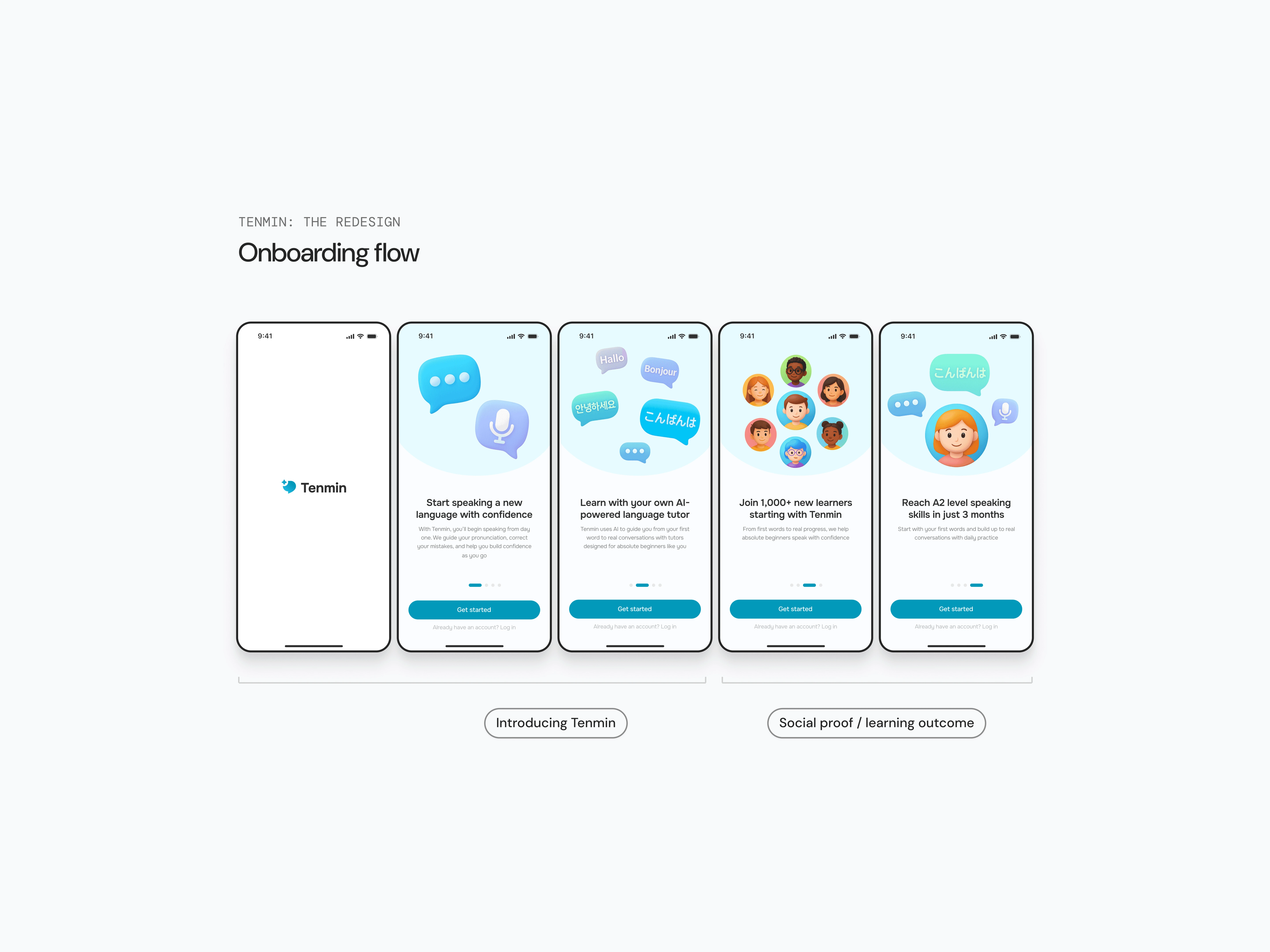 An onboarding flow that builds trust: A 4-screen sequence that clearly communicates Tenmin’s value, integrates social proof early, and uses bright illustrations with friendly microcopy to humanize the AI tutor.