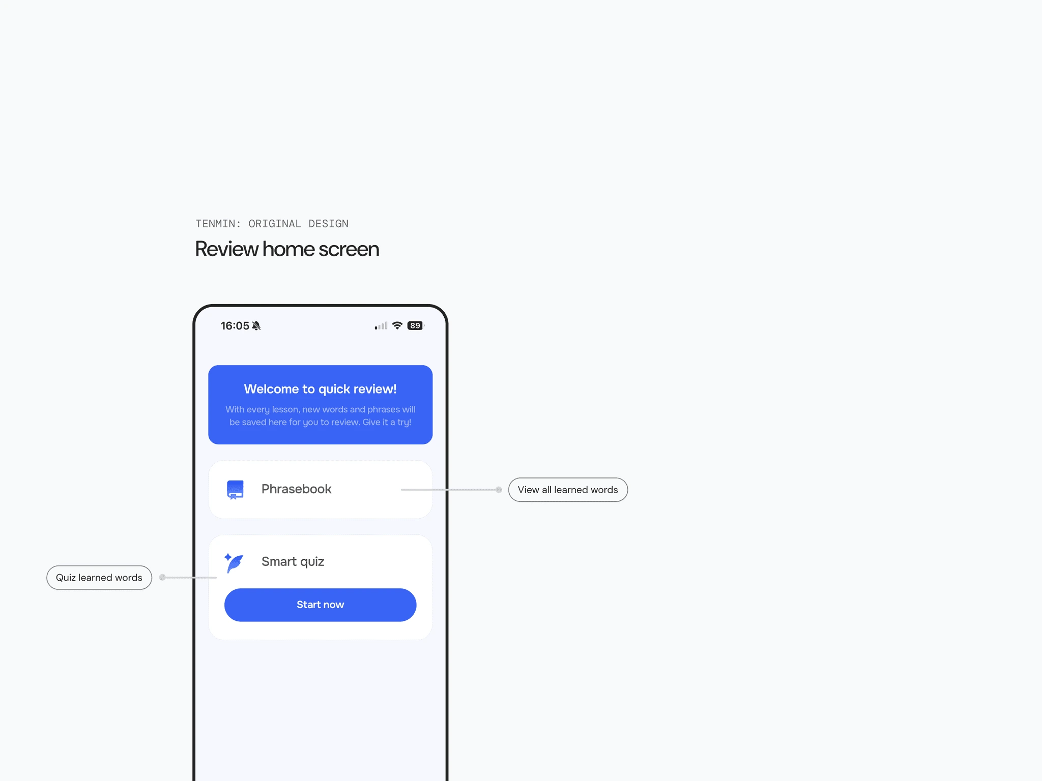 The Review screen that motivates daily practice: Reorganized Phrasebook and Smart Quiz for clarity, added time indicators and card counts, and aligned visuals with the onboarding tone to keep reviews light and focused.