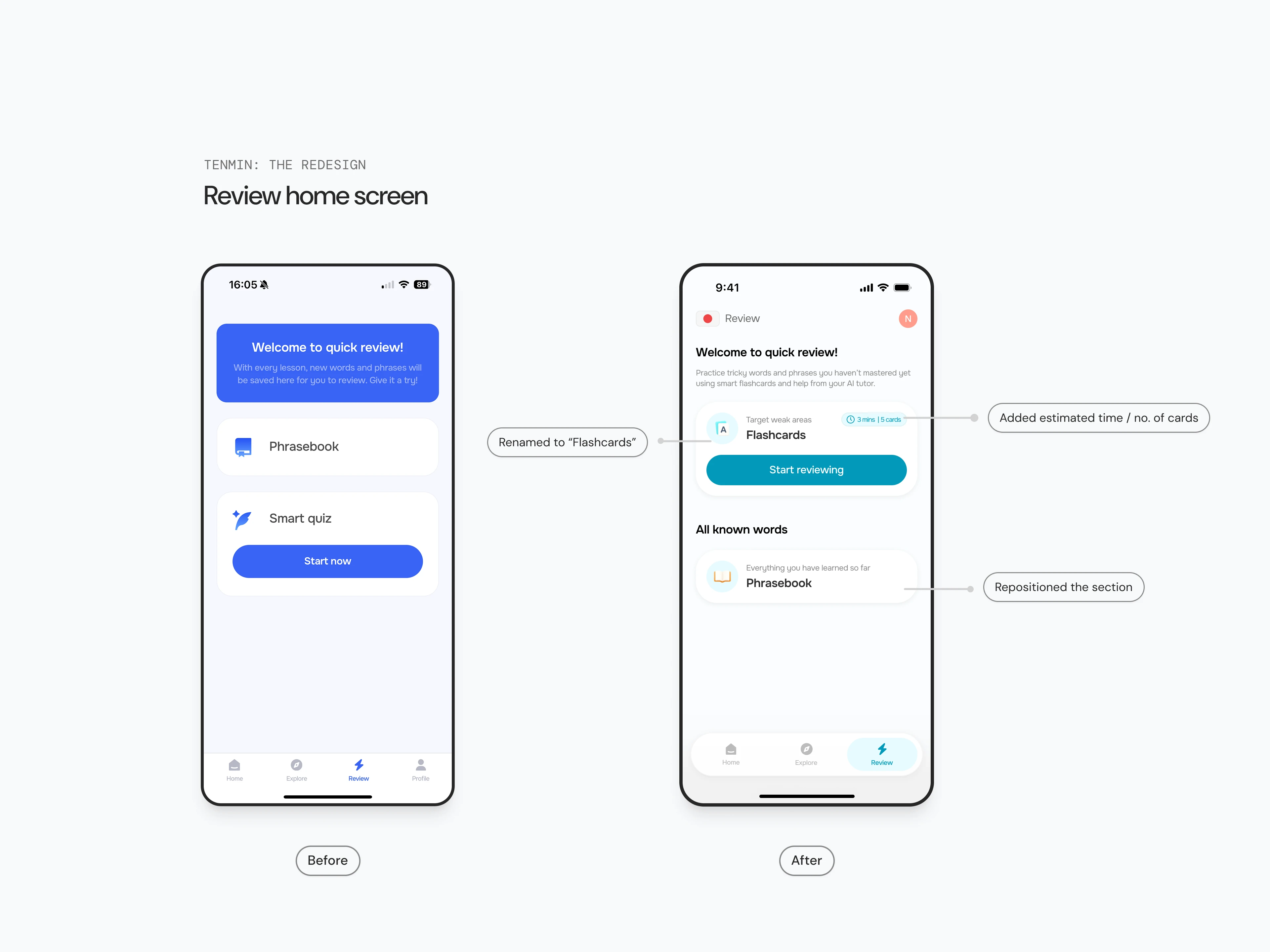 Review home screen: Redesigned the existing layout to make daily review simple, motivating, and visually clean