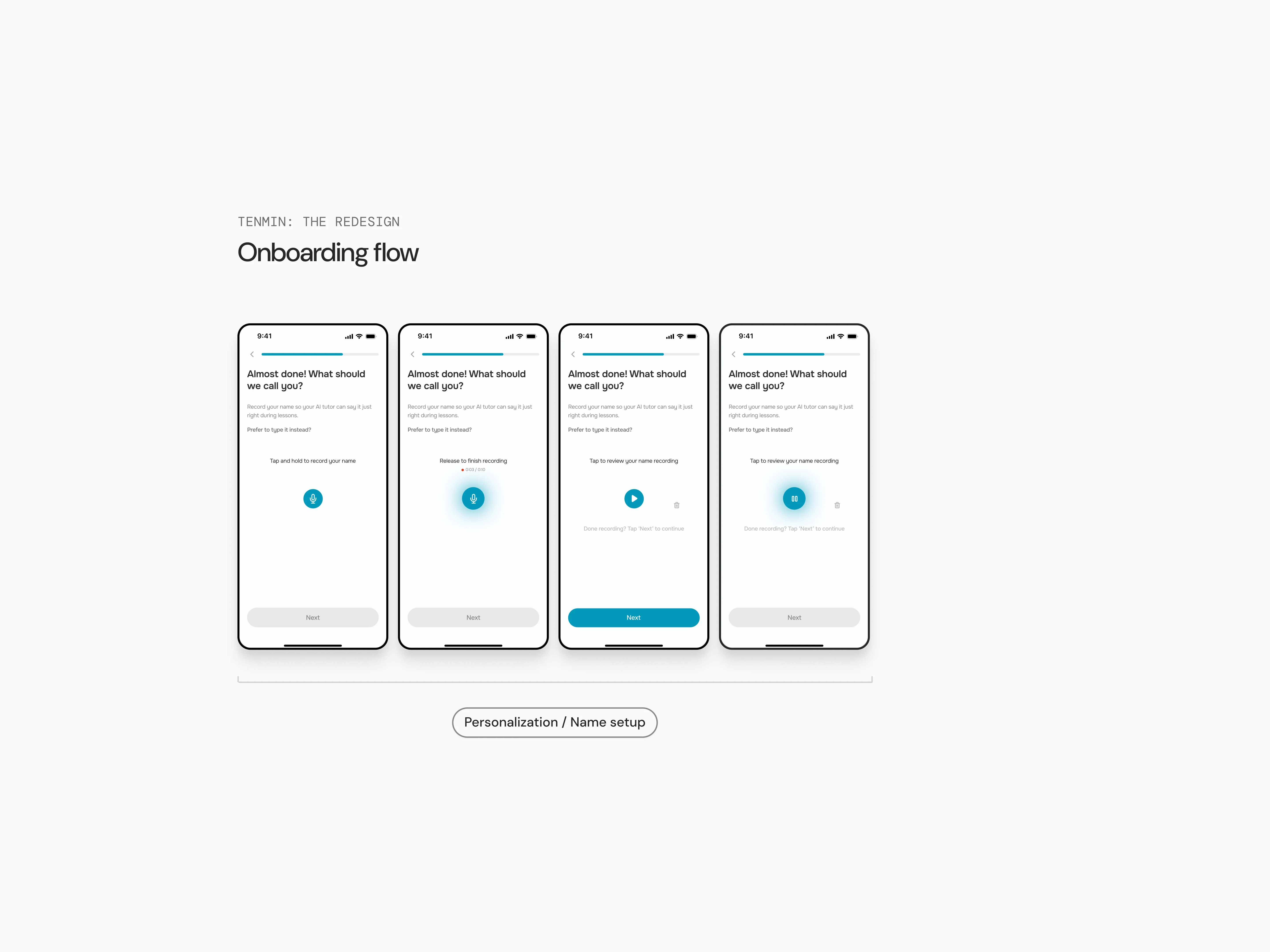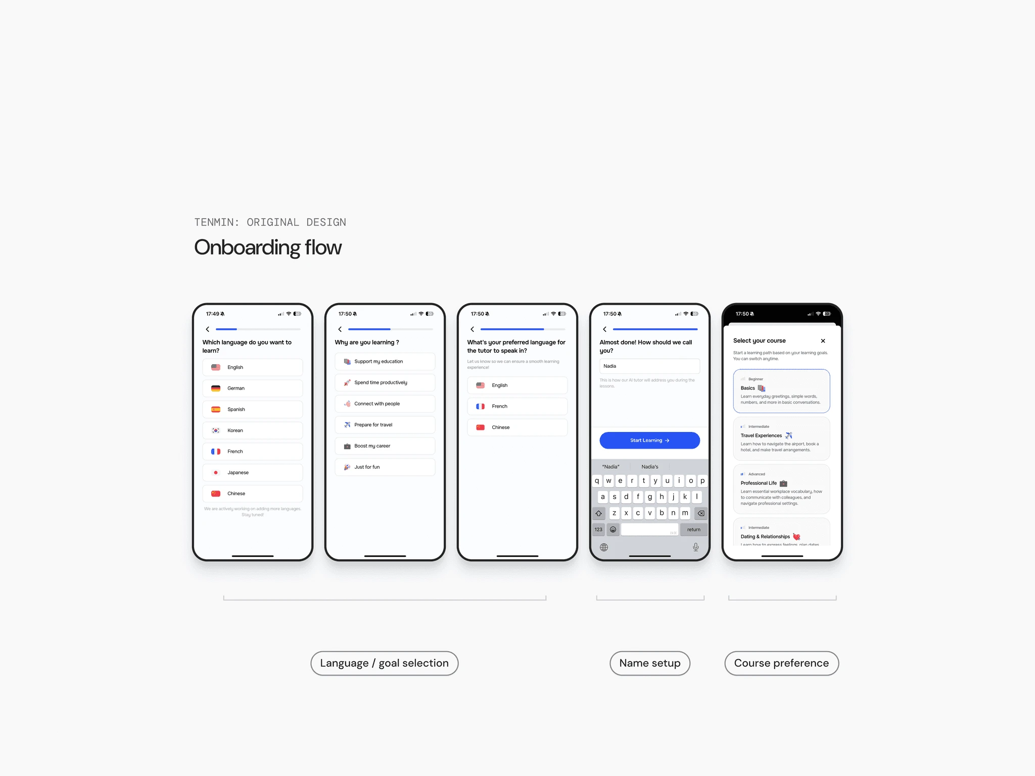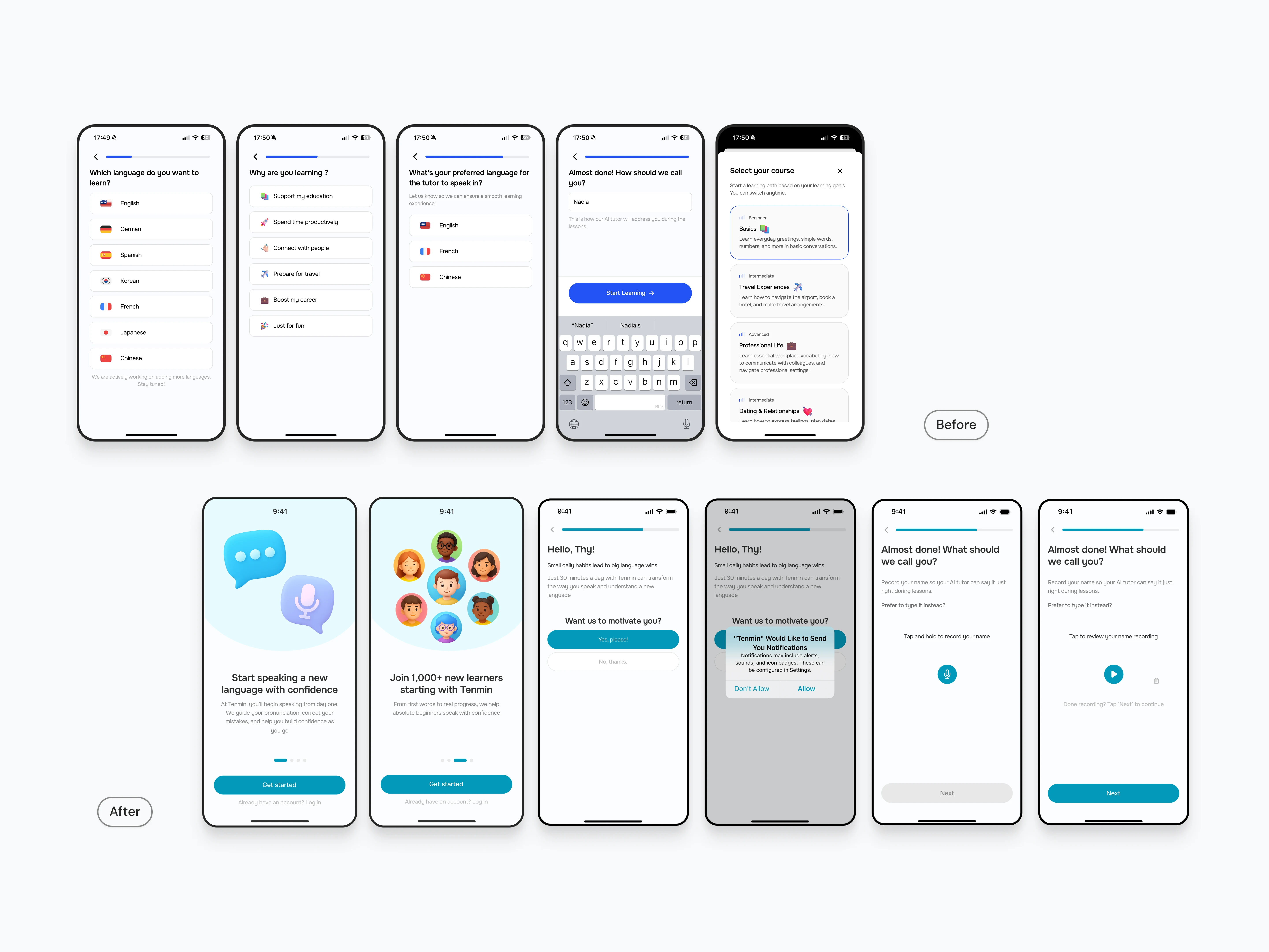 I redesigned the onboarding experience and a review screen to help users build trust with Tenmin’s AI tutor and motivate them to build lasting speaking habits.