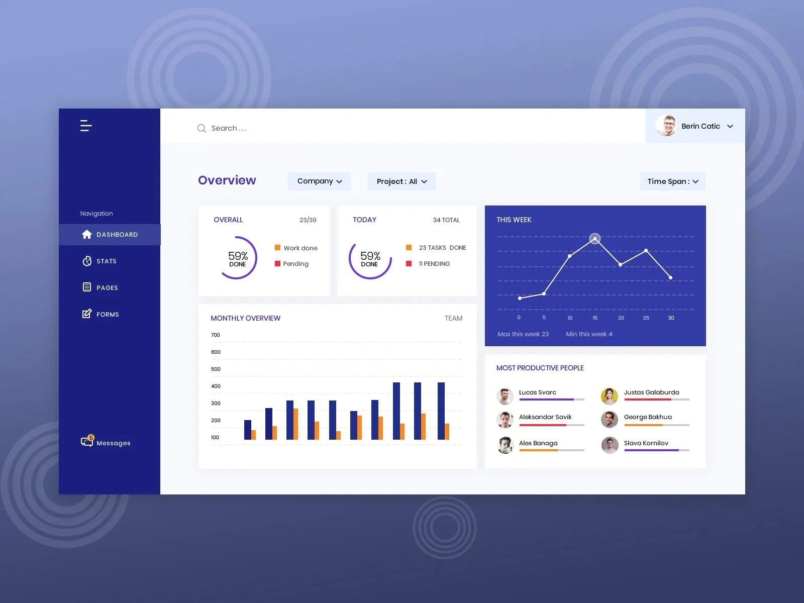 An intuitive and data-driven dashboard interface designed for productivity and performance tracking. The layout includes progress tracking, weekly trends, team statistics, and top performer highlights. With a balance of visual hierarchy, charts, and cards, this dashboard ensures clear readability and easy navigation. Ideal for SaaS platforms, project management tools, and enterprise dashboards that prioritize efficiency and clarity.