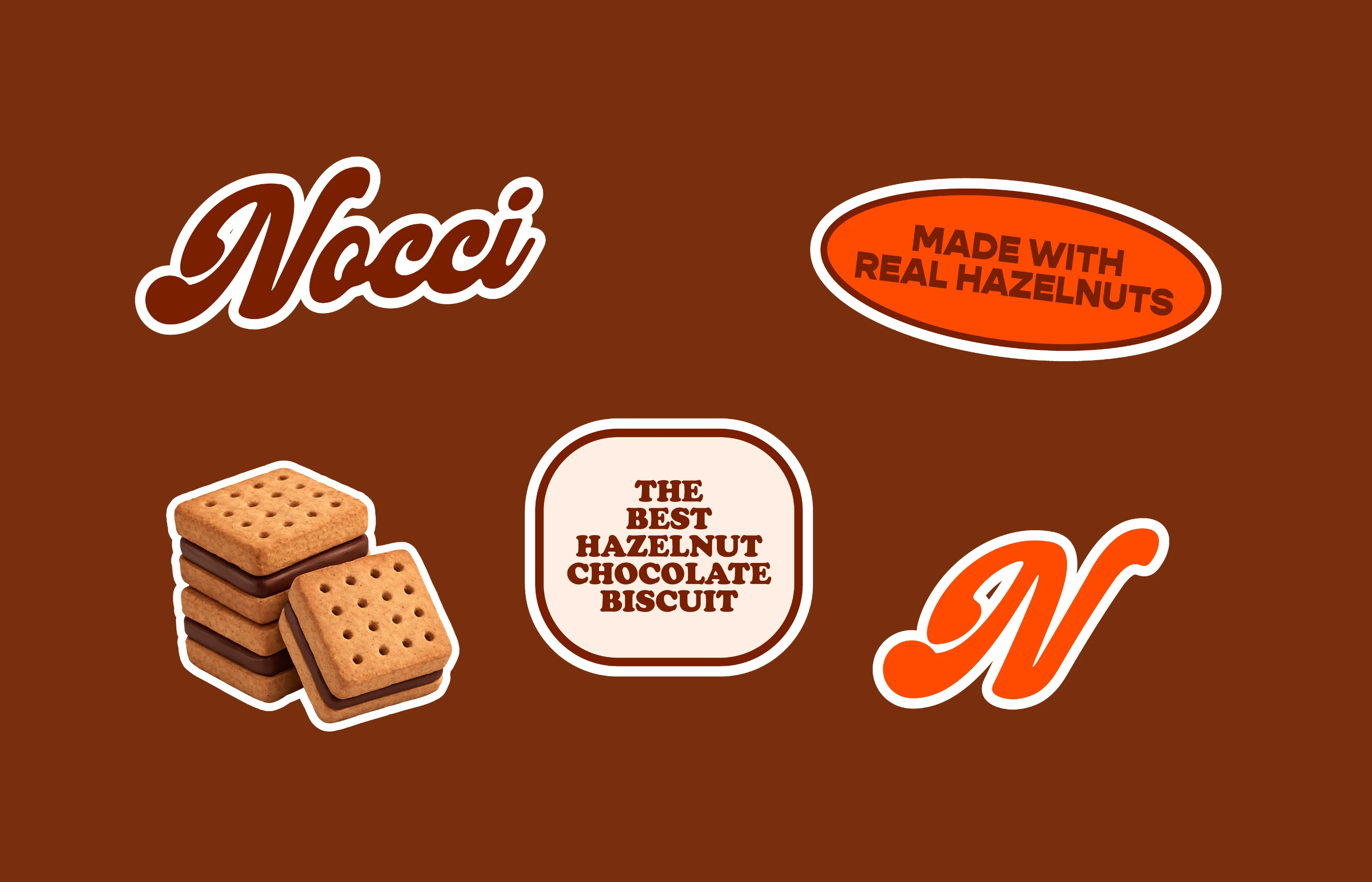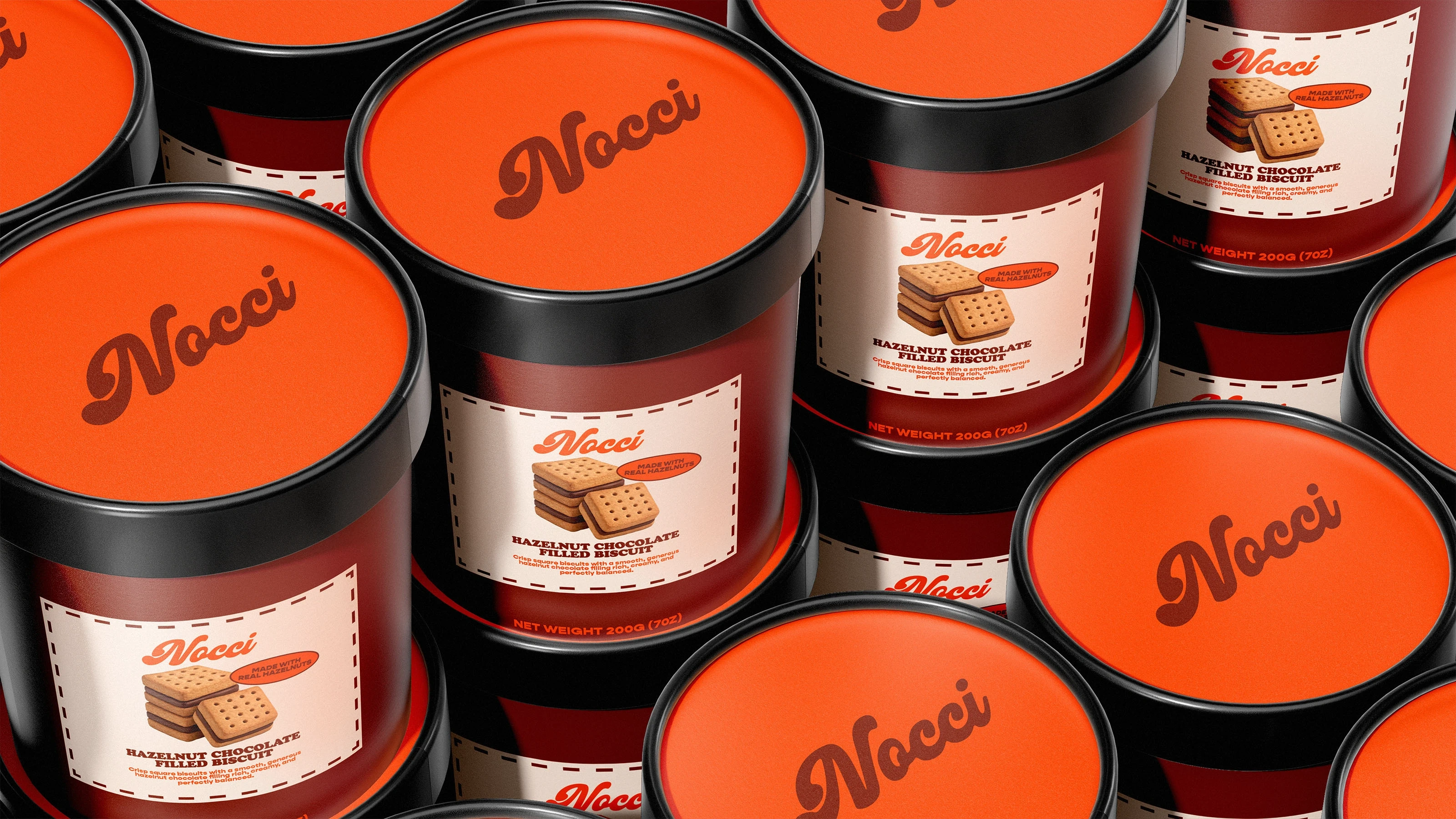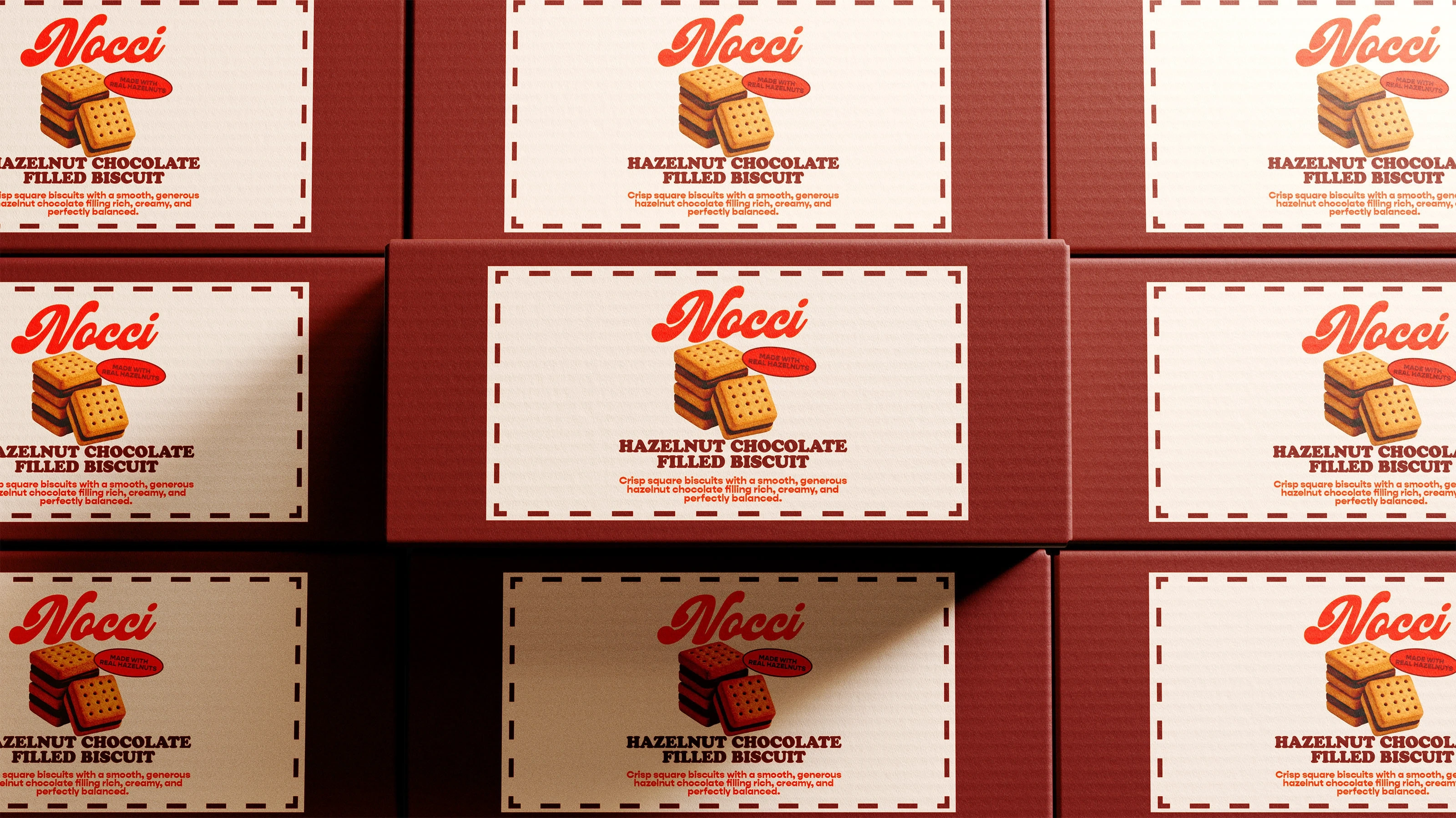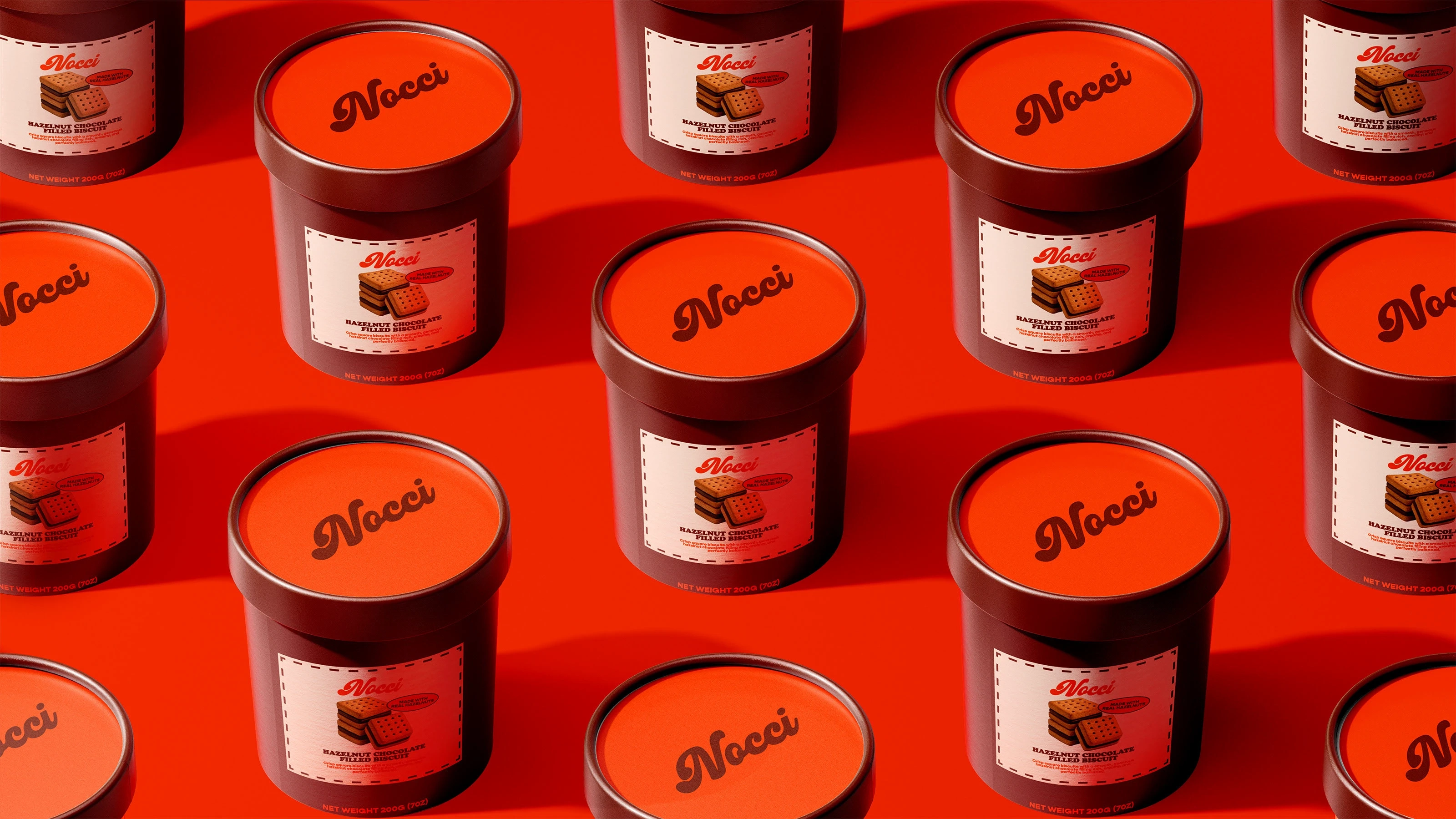 The solution was Nocci, a brand built around warmth, simplicity, and sensory indulgence. The concept focuses on elevating everyday biscuit treats into a more refined, giftable experience without losing their comforting essence. By combining a bold visual identity with clear, minimal communication, the brand achieves both memorability and clarity. The system extends seamlessly across tubs, boxes, and secondary elements, ensuring consistency while maintaining strong visual impact in both single-product and repeated compositions.