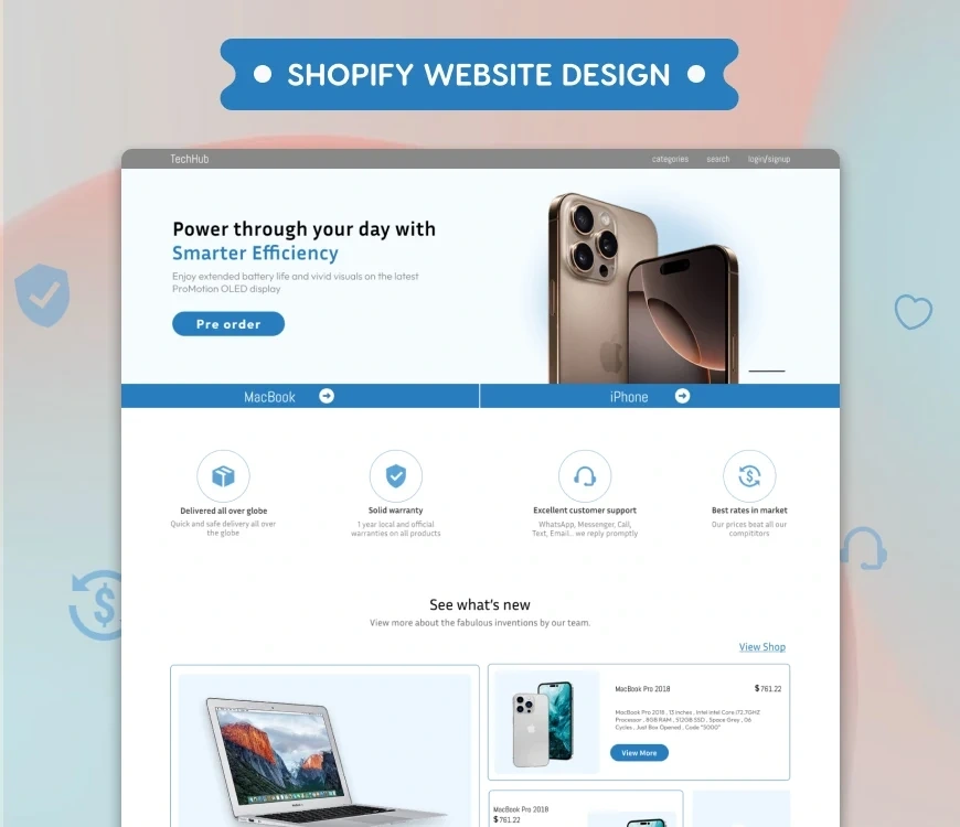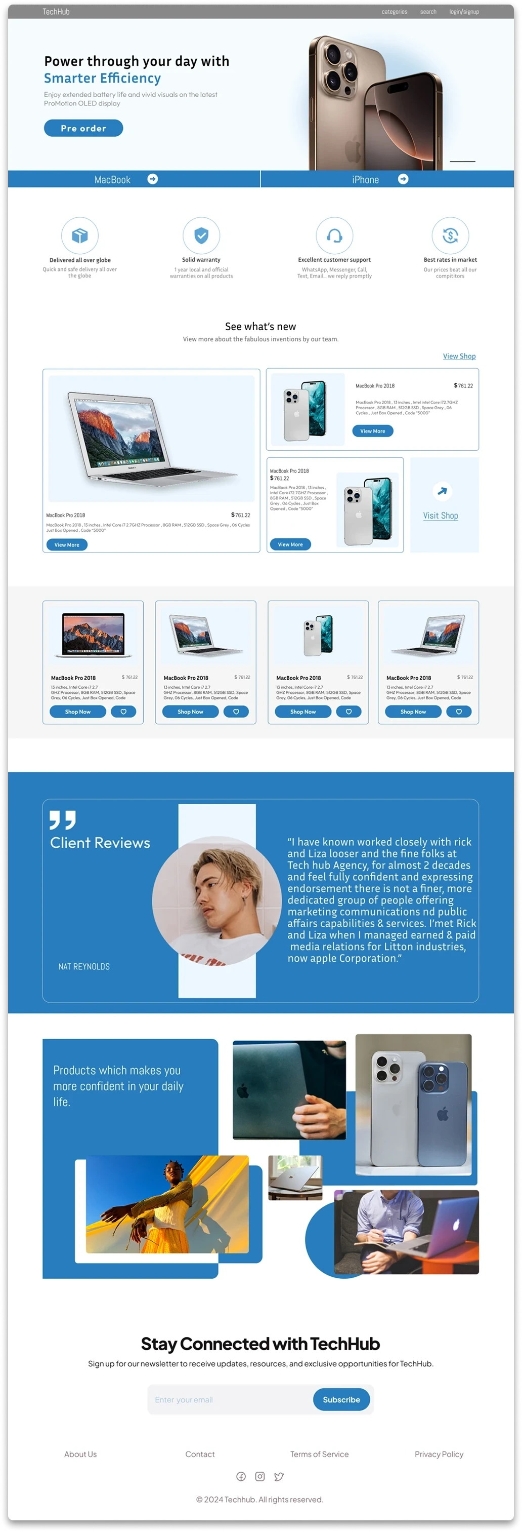 Designed a clean and fully responsive electronics eCommerce website for TechHub, focused on Apple product sales including MacBooks and iPhones. The website highlights a hero preorder section, product grids with pricing, and a toggle navigation for switching between product categories.