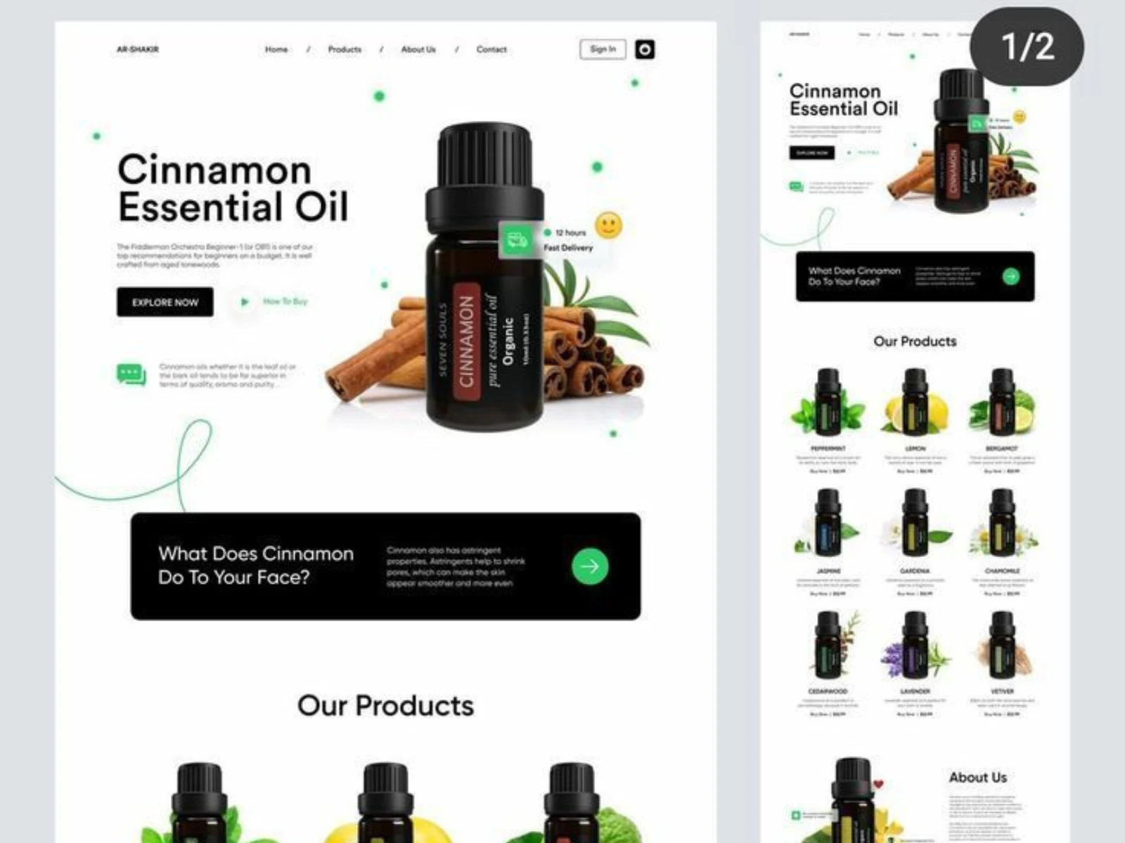 UI/UX design for a natural products e-commerce site, "AR SHAKIR." The design emphasizes the Cinnamon Essential Oil with clear product benefits