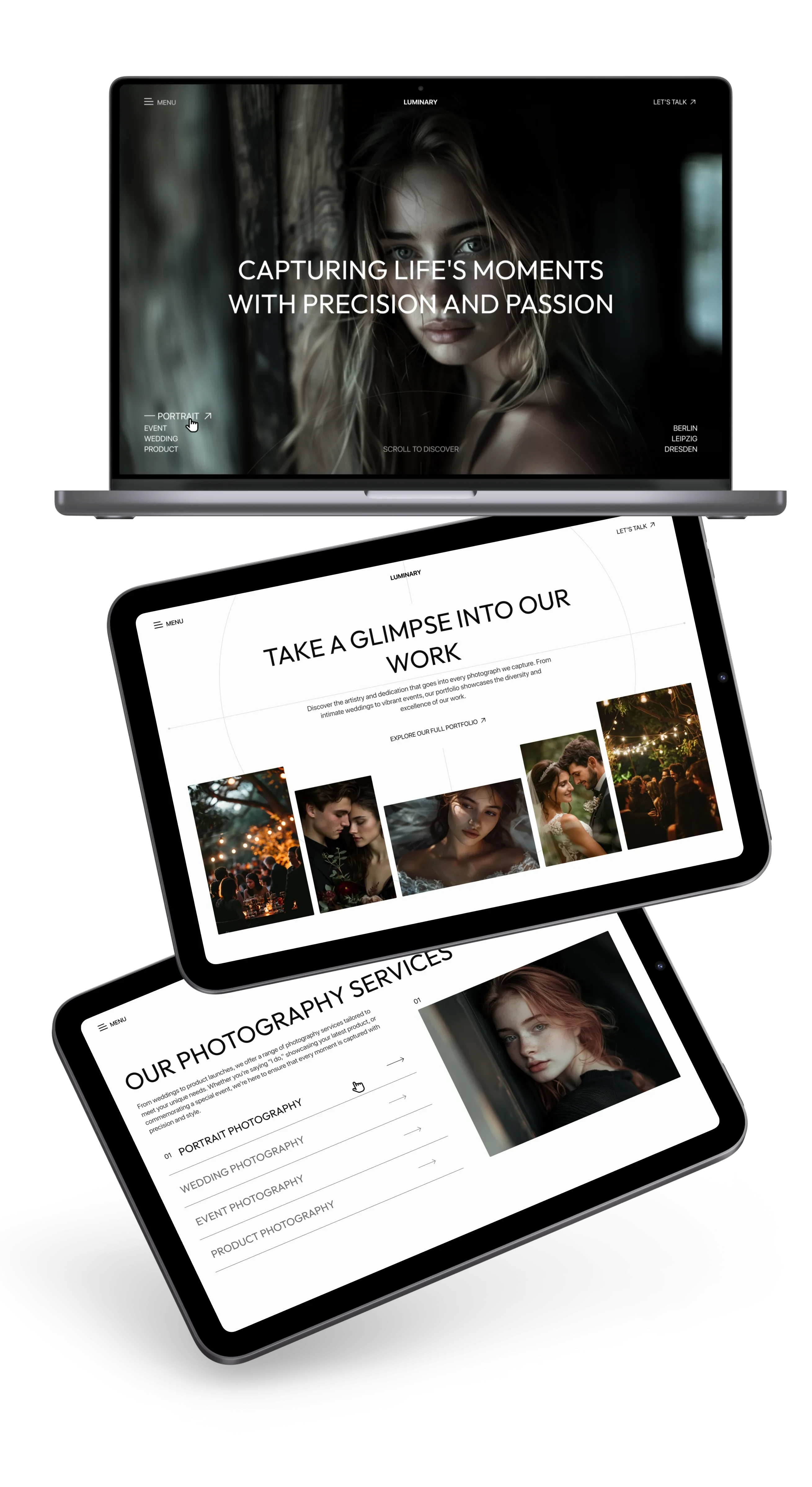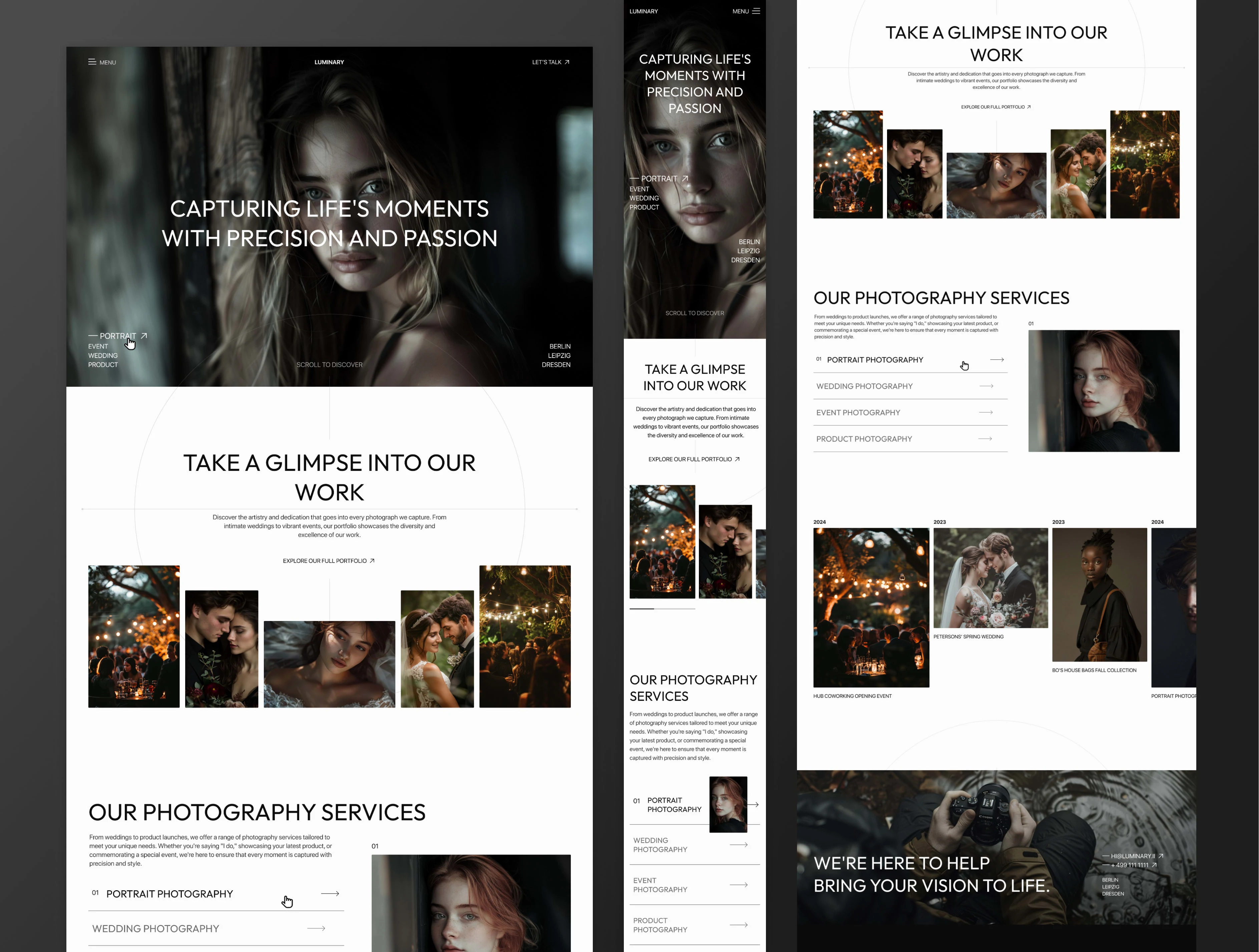 A web design for a small photography studio. The design process included wireframing with custom layouts, branding, and UI screens for all pages and services.