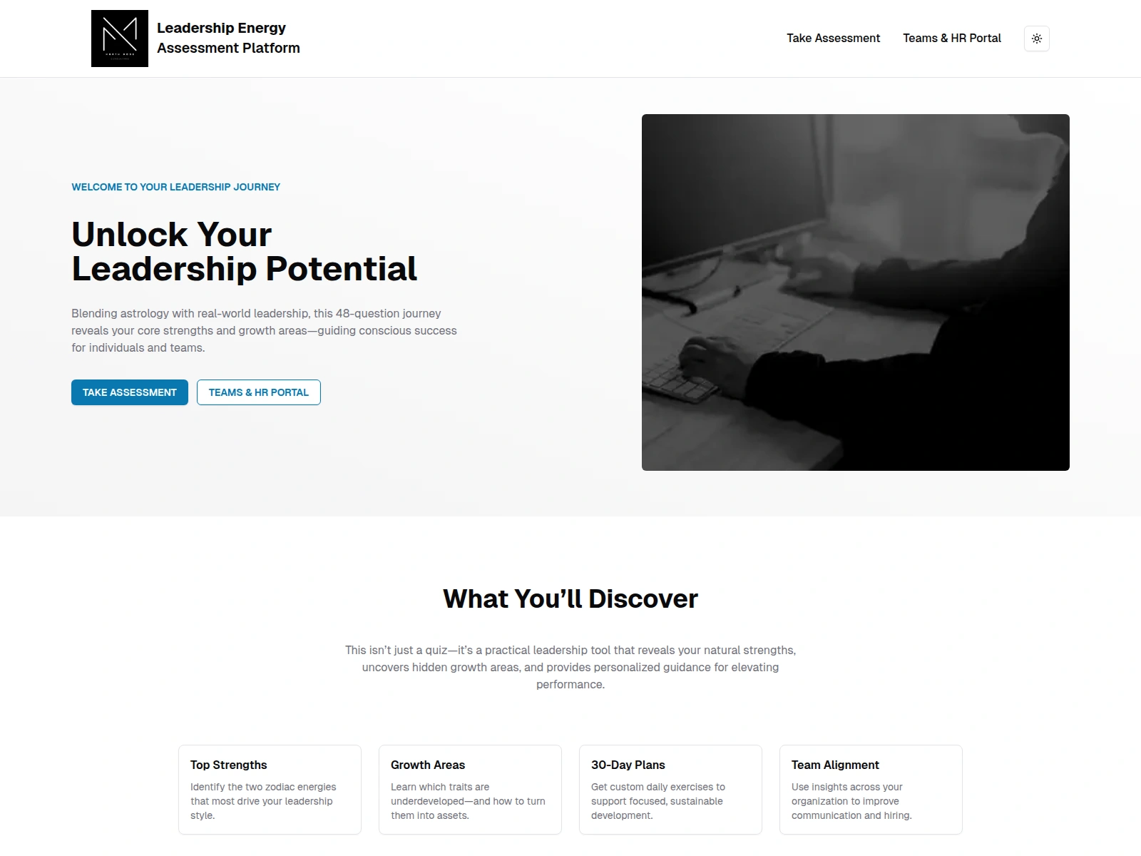 A comprehensive web-based assessment platform designed to evaluate users' leadership strengths and growth areas through an astrology-inspired scoring model. The system includes a TES (Team Energy Score) report integration, automated PDF generation, and a dynamic admin dashboard for managing pricing and reports.