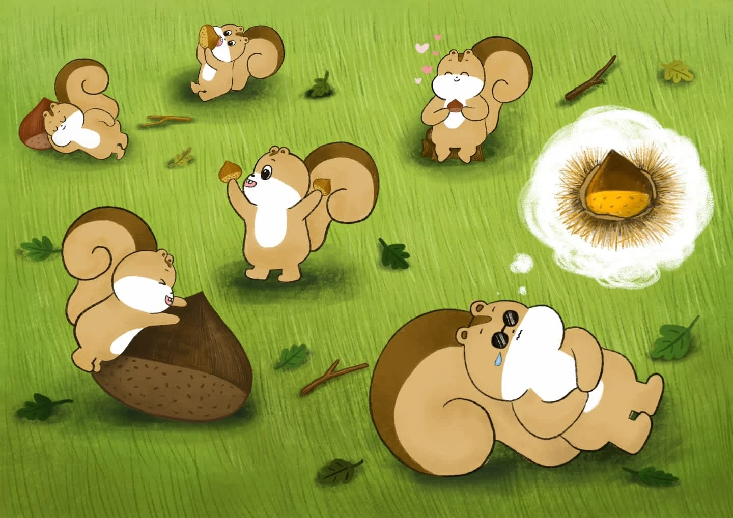 Picture book illustration of a squirrel reminiscing about the past when he loved chestnuts so much.